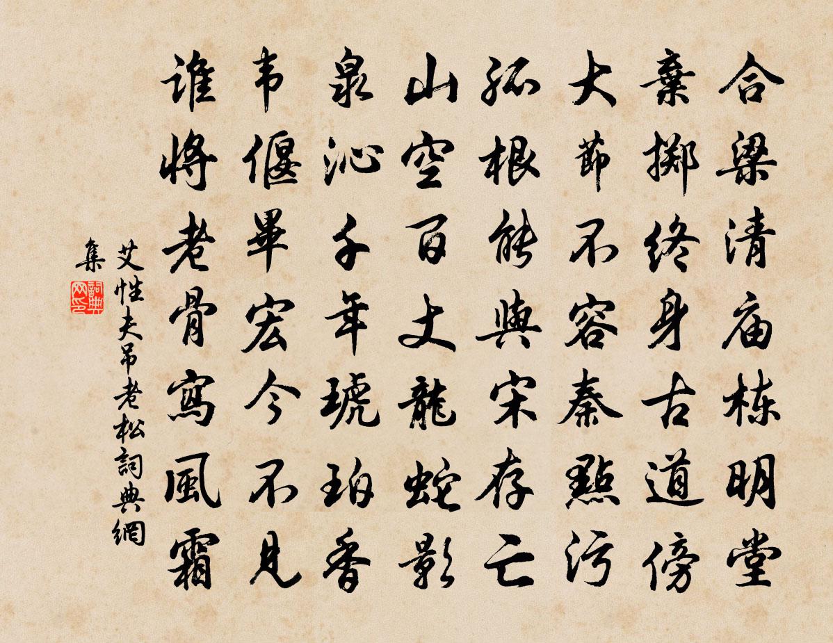 詩詞名句歷史字典書法欣賞書法字典國語詞典說文解字康熙字典古漢語字典標 題 作 者 詩 句 吊老松作者:艾性夫 朝代:宋代吊老松原文合梁清廟棟明堂,棄擲終身古道傍。大節不容秦點污,孤根能與宋存亡。山空百丈龍蛇影,泉沁千年琥珀香。韋偃畢宏今不見,誰將老骨寫風霜。詩詞問答問:吊老松的作者是誰?答:艾性夫問:吊老松寫於哪個朝代?答:宋代問:吊老松是什麼體裁?答:七律艾性夫吊老松書法欣賞吊老松書法作品詩詞推薦蔡州壼公觀劉道士蘇轍〔宋代〕恩潁求歸今幾時,布衣猶在老劉師。龍章舊有世人識,蟬蛻惟應野老知。昔葬衣冠今在否,近傳音問不須疑。曾聞不俗軒耐閒軒頌黃庭堅〔宋代〕不愛孔方乃不俗,放下利慾是耐閒。棒打石獅子,論實不論虛。楊白花一首王阮〔宋代〕天河秋來有時見,秋江人去無還期。南風北風日爭吹,三十六宮空淚垂。塞鴻已作隨陽去,社燕寧論故巢住。安得看採蓮白居易〔唐代〕小桃閒上小蓮船,半采紅蓮半白蓮。不似江南惡風浪,芙蓉池在臥床前。晚步釋文珦〔宋代〕秋色遍西原,行吟野興存。坂田通堰熟,溪水度灘喧。宿鳥分投樹,歸牛各認村。幽居乘夜返,松月在衡門。真游覓唐輿題詩不見有懷其人八首趙蕃〔宋代〕相從寧見樂,相別乃知悲。況辱平生友,而堅晚歲期。已醒臨別酒,還讀送行詩。何況維舟處,蒼然暮色時。漁父詞(其七)趙構〔宋代〕駭浪吞舟脫巨鱗。結繩為綱也難任。綸乍放,餌初沉。淺釣纖鱗味更深。詩三首嚴中和〔宋代〕一聲杜宇三更後,向曉綠陰連碧苔。卻恨樓高春數尺,柳綿飛不上窗來。和靖墓黃庚〔宋代〕西湖卜隱為詩忙,吟到梅花字字香。鶴不歸來山寂寂,梅邊閒詠月黃昏。早渡伊川見舊鄰作錢起〔唐代〕鵾雞鳴早霜,秋水寒旅涉。漁人昔鄰舍,相見具舟楫。出浦興未盡,向山心更愜。村落通白雲,茅茨隱紅葉。東皋使東川慚問囚元稹〔唐代〕司馬子微壇上頭,與君深結白雲儔。尚平村落擬連買,王屋山泉為別游。各待陸渾求一尉,共資三徑便同休。那知病後衰甚非籃輿不能出門感嘆有賦陸游〔宋代〕酒興詩情尚自如,形骸可怪頓成疏。平生只倚雙鳧舄,此日常須一鹿車。寂寂豈惟慚鄧禹,厭厭更覺類曹蜍。晚窗次曾宏甫見過二首韻曾幾〔宋代〕鶯啼花落後,芳草綠陰初。良會日不足,清談風有餘。飢餐聊當肉,嬾出坐無車。勿以貧兼病,相過跡也疏。寄張君玉喻良能〔宋代〕橘亭一別五回冬,寤寐何曾置此翁。二十五聲秋後點,八千里外月明中。夫君不寄平安信,而我方棲簿領叢。三峽天香長筌子〔元代〕若論修真,玄關直指,外緣心上都撇。靜處跏趺,存神握固,莫辯是非優劣。任緣度日,除飽暖其餘忘絕。一味清送李介甫赴官塘湯氏館仇遠〔宋代〕東盧山下義門中,弘開講席招蜀翁。主人擇客又擇主,童蒙求我我求童。俊傑識時審出處,道義結交全始終。惟應寄安陸友人姚合〔唐代〕別路在春色,故人云夢中。鳥啼三月雨,蝶舞百花風。煙束遠山碧,霞欹落照紅。想君登此興,回首念飄蓬。送進士萬知古釋智圓〔宋代〕經明行修徒爾為,一名屢點春官闈。時之不利非戰罪,歸山且著老萊衣。清時貪賤誠堪恥,侏儒太飽朔方飢。男兒寄婺州趙尚書產夫二首王邁〔宋代〕憶昔京畿人幕時,游從日淺辱深知。每誇得士如溫造,幾度逢人說項斯。親見登瀛應擊節,近聞去國為攢眉。江乾發山陽得順風二首袁說友〔宋代〕曉入山陽古渡頭,輕帆獵獵送行舟。風師憐我征程滯,頃刻揚舲到泗州。名句推薦日出東南隅,照我秦氏樓。佚名《陌上桑》 兵家稱客主異勢,客貴速戰,主貴持重。姚思廉《陳書·列傳·卷二十五》 治強生於法,弱亂生於阿。韓非及後人《韓非子·外儲說右下》 繡面芙蓉一笑開,斜飛寶鴨襯香腮。李清照《浣溪沙·閨情》 何時一樽酒,重與細論文。杜甫《春日憶李白》 此處不留人,自有留人處。馮夢龍《喻世明言·卷三》 酒意詩情誰與共?淚融殘粉花鈿重。李清照《蝶戀花·暖雨晴風初破凍》 危橋屬幽徑,繚繞穿疏林。柳宗元《巽公院五詠·苦竹橋》 少年不識愁滋味,愛上層樓。愛上層樓,為賦新詞強說愁。辛棄疾《醜奴兒·書博山道中壁》 河邊獨自看星宿,夜織天絲難接續。王建《七夕曲》