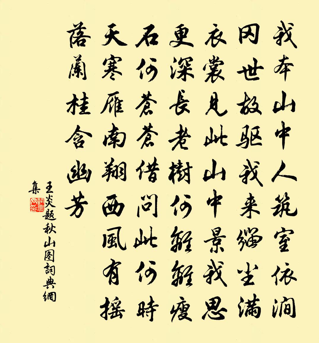 詩詞名句歷史字典書法欣賞書法字典國語詞典說文解字康熙字典古漢語字典標 題 作 者 詩 句 題秋山圖作者:王炎 朝代:宋代題秋山圖原文我本山中人,築室依澗岡。世故驅我來,緇塵滿衣裳。見此山中景,我思更深長。老樹何離離,瘦石何蒼蒼。借問此何時,天寒雁南翔。西風有搖落,蘭桂含幽芳。詩詞問答問:題秋山圖的作者是誰?答:王炎問:題秋山圖寫於哪個朝代?答:宋代王炎題秋山圖書法欣賞題秋山圖書法作品詩詞推薦南鄉子·集句蘇軾〔宋代〕悵望送春懷。漸老逢春能幾回。花滿楚城愁遠別,傷懷。何況清絲急管催。吟斷望鄉台。萬里歸心獨上來。景物登邀趙行之陳敬叟未至四韻速之劉學箕〔宋代〕一別親朋歲月催,衿連袂屬肯俱來。交情聊敘殷勤意,野蔌隨宜三兩杯。新月窺檐頻起顧,清風動竹几驚猜。碧雲郊廟歌辭。儀坤廟樂章。永和祝欽明〔唐代〕閟宮實實,清廟微微。降格無象,馨香有依。式昭纂慶,方融嗣徽。明禋是享,神保聿歸。妙庭觀曾治鳳〔宋代〕來訪雙成宅,溪流繞故山。玉真歸帝所,金鼎落人間。雲氣生窗戶,松聲記佩環。神仙在何處,且得片時閒。人日後歸自郡城楊萬里〔宋代〕倦來睡思酒般醲,曉起東園看曉風。孤負梅花三四日,新年人事到城中。夏日游九龍巖劉夢符〔宋代〕突兀靈岩古,紆迴石磴升。地幽忘日烈,壁峭喜雲蒸。峰頂池如月,山根水欲冰。摩挲可鐫處,大字紀中興。書齋謾興二首翁承贊〔唐代〕池塘四五尺深水,籬落兩三般樣花。過客不須頻問姓,讀書聲里是吾家。官事歸來衣雪埋,兒童燈火小茅齋。人家送陸鴻漸棲霞寺採茶皇甫冉〔唐代〕採茶非采菉,遠遠上層崖。布葉春風暖,盈筐白日斜。舊知山寺路,時宿野人家。借問王孫草,何時泛碗花。文王廟范成大〔宋代〕堂堂十亂欲興周,肯使君王死作囚。巧笑入宮天亦笑,可憐元不費深謀。個人三十韻吳融〔唐代〕裊裊復盈盈,何年墜玉京。見人還道姓,羞客不稱名。故事諳金谷,新居近石城。臉橫秋水溢,眉拂遠山晴。粉薄禪人寫真求贊釋正覺〔宋代〕瘦削而黃,慣窮不忙。閒情許淡,默味能長。靈犀之通一點暈,老蚌之蘊千年光。而今到處相隨去,頭頭的的露堂酹江月侯善淵〔元代〕茅庵瀟灑,靜無塵、獨坐垂簾孤僻。鎮日閒閒清澹泊,別有恬然活計。握固存真,心無雜念,忘我兼忘世。玉嬰神憶荔枝薛濤〔唐代〕傳聞象郡隔南荒,絳實豐肌不可忘。近有青衣連楚水,素漿還得類瓊漿。贊護教釋印肅〔宋代〕以南權正,無心應物。威德標宗,不可輕忽。吊盈盈三首王山〔宋代〕燭花紅死睡初醒,一枕孤懷病客情。海上有山應大夢,人間無路可長生。乾坤意入憑欄闊,風月人歸似舊情。漢殿次韻陳茲明五絕句史彌寧〔宋代〕南湖經雨綠瀰漫,偏照詩人兩眼寒。一笑鷗邊時獨速,吟魂飛不到愁端。訪趙公戴陳耆卿〔宋代〕西原仙境即西山,流水桃花隔世間。自笑重來湖海客,紅塵惹到白雲關。臨江仙山主〔元代〕日暮殘霞哀霧起,溪邊陣陣悲風。限臨選甚父娘兄。青松梢下,一例掩無窮。荊棘三皇墳上長,垂楊露滴花叢。折沁園春陳草閣〔宋代〕霜剝銅枯崖,何銅處郵亭,銅玉龍夜呼銅。喚經年幽夢,悠然獨覺,參橫璇漢,漏徹銅壺。漠漠風煙,昏昏水月,歸國遙·春欲晚韋莊〔五代〕春欲晚,戲蝶游蜂花爛熳。日落謝家池館,柳絲金縷斷。睡覺綠鬟風亂,畫屏雲雨散。閒倚博山長嘆,淚流沾皓腕名句推薦國必有誹譽,忠臣令誹在己,譽在上。劉向《戰國策·東周·周文君免士工師藉》 田家占氣候,共說此年豐。孟浩然《田家元日》 已覺逝川傷別念,復看津樹隱離舟。王勃《秋江送別二首》 勝地不常,盛筵難再;蘭亭已矣,梓澤丘墟。王勃《滕王閣序》 惡言不出於口,忿言不反於身。戴聖《禮記·祭義》 少婦今春意,良人昨夜情。沈佺期《雜詩三首·其三》 雨中禁火空齋冷,江上流鶯獨坐聽。韋應物《寒食寄京師諸弟》 爾來從軍天漢濱,南山曉雪玉嶙峋。陸游《金錯刀行》 相去日已遠,衣帶日已緩佚名《行行重行行》 欲利己,便是害己;肯下人,終能上人。王永彬《圍爐夜話·第二一五則》