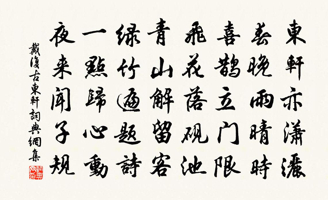 詩詞名句歷史字典書法欣賞書法字典國語詞典說文解字康熙字典古漢語字典標 題 作 者 詩 句 東軒作者:戴復古 朝代:宋代東軒原文東軒亦瀟灑,春晚雨晴時。喜鵲立門限,飛花落硯池。青山解留客,綠竹遍題詩。一點歸心動,夜來聞子規。詩詞問答問:東軒的作者是誰?答:戴復古問:東軒寫於哪個朝代?答:宋代問:戴復古的名句有哪些?答:戴復古名句大全戴復古東軒書法欣賞東軒書法作品詩詞推薦簡單宰二首陳造〔宋代〕縹緲雲藏羽客廬,不妨尋勝小踟躕。鴟夷載酒鶯花處,古錦囊詩簿領餘。百和風輕吹欲醉,萬山嵐凝對憑虛,譚間題舊日所藏晉陶淵明採區東籬下悠然見南山畫趙蕃〔宋代〕未必形模似,良由意象高。見山非得得,遇酒輒陶陶。蕪沒念三徑,飄零悲二毛。南征儻亡恙,歸老舊蓬蒿。出關和雷侍郎送行無魔不成佛觀過始知仁之句陳杰〔宋代〕事來思爛熟,罪去得深循。天壤嗟微義,風霜本至仁。十年江社夢,一道雪梅春。回首無他囑,當言莫愛身。秋日寄弟趙防〔唐代〕涼風颯庭戶,漸疑華發侵。已經楊柳謝,猶聽蟪蛄吟。雨助灘聲出,雲連野色深。鶺鴒今在遠,年酒共誰斟。鳳州歌汪元量〔宋代〕去路迢迢入兩當,三千三百到華陽。黃花川上黃花驛,千百猿聲斷客腸。浣溪沙(用前韻再答幼安)葉夢得〔宋代〕綠野歌歡喜見分。驟驚和氣曉來勻。妙歌誰敢和陽春。梅蕊舊年迎臘雪,月華今夜破寒雲。獨醒爭笑楚人魂。梁元帝二首陳造〔宋代〕中外誰非肉骨恩,顒顒帝子亦王孫。君王日握金銀筆,忍署兵威極六門。秋日夏口涉漢陽,獻李相公劉長卿〔唐代〕日望衡門處,心知漢水濆。偶乘青雀舫,還在白鷗群。間氣生靈秀,先朝翼戴勛。藏弓身已退,焚藁事難聞。舊業十月誕辰內殿宴群臣效柏梁體聯句李顯〔唐代〕潤色鴻業寄賢才,——李顯叨居右弼愧鹽梅。——李嶠運籌帷幄荷時來,——宗楚客職掌圖籍濫蓬萊。——劉憲兩春雨不止魯漕有二詩因次韻吳芾〔宋代〕青春能幾何,況已過寒食。此時對東風,一日亦可惜。正好倒清尊,呼婦戛鳴瑟。胡不少自寬,兀坐有憂色。一春鄂州南樓書事黃庭堅〔宋代〕四顧山光接水光,憑欄十里芰荷香。清風明月無人管,並作南來一味涼。丙寅十四首效韋蘇州黃庭堅〔宋代〕我思五柳翁,解作一生事。得錢送酒家,便靜尋山寺。念我還如此,翁應會人意。緣識宋太宗〔宋代〕棲真大道於南北,清淨之間求愛力,堅持雅志窮諸識。尋常如觀在眼前,唯仰三光無蹔息。憂念蒼生不暇食,自挫周仲章都官示卷因以贈之梅堯臣〔宋代〕赭白西北來,本是天馬種。朝秦暮至吳,嵩華如歷冢。伯樂曾未逢,垂頭牧青隴。今朝顧我鳴,振鬣耳聳聳。聲生酬故人陳乂都方乾〔唐代〕遠別那無夢,重遊自有期。半年鄉信到,兩地赤心知。坐久吟移調,更長硯結凘。文人才力薄,終怕阿戎欺。悲歌四顧況〔唐代〕何處春風吹曉幕,江南淥水通朱閣。美人二八面如花,泣向春風畏花落。【南呂】一枝花商衟〔元代〕遠寄粘花惹草心,招攬風流事,都不似今日個這嬌姿。伶變知音,雅有林泉志。合歡連理枝,兩意相投,美滿夫妻黃嗣深尚書自仰山來惠茶及竹薰爐曾幾〔宋代〕茗椀中超舌界,薰爐上悟香塵。坐我集雲峰頂,對公小釋迦身。人有畫花中四倫者偶記毗陵舊詩即題其上家鉉翁〔宋代〕佩玉垂紳廊廟人,幽花小草豈其倫。須知四海皆兄弟,淡泊論交處處親。清平樂(謝叔良惠木犀)辛棄疾〔宋代〕少年痛飲。憶向吳江醒。明月團圓高樹影。十里薔薇水冷。大都一點宮黃。人間直恁芳芬。怕是九天風露,染教世名句推薦盡道豐年瑞,豐年事若何羅隱《雪》 當年萬里覓封侯。匹馬戍梁州。陸游《訴衷情·當年萬里覓封侯》 贈人以言,重於金石珠玉;觀人以言,美於黼黻、文章;聽人以言,樂於鐘鼓琴瑟。荀子《荀子·非相》 參差煙樹灞陵橋,風物盡前朝柳永《少年游·參差煙樹灞陵橋》 移舟水濺差差綠,倚檻風擺柄柄香鄭谷《蓮葉》 去國十年老盡、少年心。黃庭堅《虞美人·宜州見梅作》 林斷山明竹隱牆。亂蟬衰草小池塘。蘇軾《鷓鴣天·林斷山明竹隱牆》 冰合井泉月入閨,金缸青凝照悲啼。李白《夜坐吟》 東飛烏鵲西飛燕。盈盈一水經年見。陳師道《菩薩蠻·七夕》 千人同心則得千人力,萬人異心則無一人之用。劉安及其門客《淮南子·兵略訓》