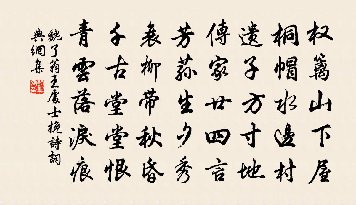 詩詞名句歷史字典書法欣賞書法字典國語詞典說文解字康熙字典古漢語字典標 題 作 者 詩 句 王處士輓詩作者:魏了翁 朝代:宋代王處士輓詩原文權籬山下屋,桐帽水邊村。遺子方寸地,傳家廿四言。芳蓀生夕秀,衰柳帶秋昏。千古堂堂恨,青雲落淚痕。詩詞問答問:王處士輓詩的作者是誰?答:魏了翁問:王處士輓詩寫於哪個朝代?答:宋代魏了翁王處士輓詩書法欣賞王處士輓詩書法作品詩詞推薦次韻傅茂元二絕劉子翬〔宋代〕濠樂亭前花已披,馬軍送酒故來遲。只愁風雨卷春去,紅染芳效一徑泥。偈頌一百零一首釋慧性〔宋代〕初三十一,中九下七。更不囊藏,當陽拈出。一氣轉洪鈞,八方開壽域。鷓鴣引王惲〔元代〕何處人間淑景新。韶光都付牡丹春。後庭花老空瓊樹,曲水江深見麗人。金屑粉,麝香裙。近前細看倒芳尊。惜教轉調賀聖朝/賀聖朝佚名〔宋代〕漸覺一日,濃如一日,不比尋常。若知人、未伊瘦損,成病又何妨。相思到了,不成模樣,收淚千行。把從前淚,題照禪師道場趙孟堅〔宋代〕重到招提十七年,吟題墨色又成嫣。蟠虬老檜枝垂舞,像刻前碑石載鐫。留賦縱然常滿壁,玄機竟莫悟枯禪。道場新釀熟小飲陸游〔宋代〕籬菊猶堪采落英,一尊玉瀣釀初成。今宵要向中庭飲,不展華茵展月明。春日野望懷故人李中〔唐代〕野外登臨望,蒼蒼煙景昏。暖風醫病草,甘雨洗荒村。雲散天邊野,潮回島上痕。故人不可見,倚杖役吟魂。挽梅屋陳起〔宋代〕桐陰吟社憶當年,別後攀梅結數椽。湖海有聲推逸韻,弓旌不至嘆遺賢。兒收殘稿能傳業,自志平生不愧天。航便酬海宗二侍者釋重顯〔宋代〕蘭之得蓀,其道必存。扶吾病起,古風入門,二兮一兮,且論勿論。祭果南澗南叔凱釋善珍〔宋代〕我憩閩北,叔凱枉顧。出南澗書,劇談至暮。言昔之夜,得夢怪奇。當與藏叟,會阿耨池。想耶因耶,一笑眇邈。弋陽縣驛陸游〔宋代〕大雨山中採藥回,丫頭岩畔覓詩來。喚船野渡逢迎雪,攜酒溪頭領略梅。久客愁心端欲折,何時笑口得頻開?殷勤題岐王舊山池石壁白居易〔唐代〕樹深藤老竹迴環,石壁重重錦翠斑。俗客看來猶解愛,忙人到此亦須閒。況當霽景涼風后,如在千岩萬壑間。黃綺和叔夏田舍三絕胡寅〔宋代〕作堨辛勤雨更遲,桔槔誰語漢陰知。不嫌機事侵純白,一日何妨灌百畦。淮南夜泊黎廷瑞〔宋代〕低篷矮艇載詩翁,又泊淮南港汊東。月黑荒村行獨虎,雲深遠渚拍低鴻。詩書落落心如梗,天地悠悠鬢欲蓬。輾轉中梁山寺文同〔宋代〕煙巒彩翠霜林紅,層樓復閣雲霧中。襟懷太爽睡不得,一夜滿山鈴鐸風。光化戊午年舉公見示省試春草碧色詩偶賦是題鄭谷〔唐代〕萇弘血染新,含露滿江濱。想得尋花徑,應迷拾翠人。窗紗迎擁砌,簪玉姑成茵。天借新晴色,雲饒落日春。虞美人(寄李公定)王千秋〔宋代〕流蘇斗帳泥金額。我亦花前客。謫仙標韻勝瓊枝。一詠一觴、常是得追隨。自從風借雲帆便。冷落青樓宴。石橋風挽趙南塘方大琮〔宋代〕初開學禁預招延,俄滯周南四十年。大振文詞驚海內,肯將訓詁讓儒先。孤忠自許漢遺老,高氣直凌唐謫仙。鳳昔酒病中寄李十二招飲五首張耒〔宋代〕酒病岑岑更怯寒,一窗疏雨擁衾眠。西風一入庭前樹,便有秋聲到枕邊。乙丑重五陸游〔宋代〕盤中共解青菰粽,衰甚猶簪艾一枝。寂寞廢詩仍止酒,今年真負此佳時。名句推薦銅華滄海,愁霾重嶂,燕北雁南天外。吳文英《永遇樂·乙巳中秋風雨》 寧戀本鄉一捻土,莫愛他鄉萬兩金。吳承恩《西遊記·第十二回》 十年舊夢無尋處,幾度新春不在家。吳文英《思佳客·癸卯除夜》 念疇昔風流,暗傷如許。柳如是《金明池·詠寒柳》 情如之何,暮塗為客,忍堪送君。吳文英《沁園春·送翁賓暘游鄂渚》 有過則改之,未萌則戒之馮夢龍《警世通言·卷三十八》 細草微風岸,危檣獨夜舟。杜甫《旅夜書懷》 一曲危弦斷客腸。津橋捩柂轉牙檣。嚴仁《鷓鴣天·惜別》 十分不耐煩,乃為人大病王永彬《圍爐夜話·第五四則》 千人之諾諾,不如一士之諤諤。司馬遷《史記·商君列傳》
