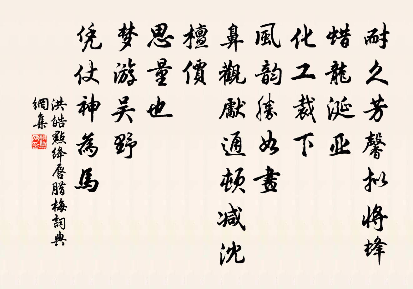 詩詞名句歷史字典書法欣賞書法字典國語詞典說文解字康熙字典古漢語字典標 題 作 者 詩 句 點絳唇(臘梅)作者:洪皓 朝代:宋代點絳唇(臘梅)原文耐久芳馨,擬將蜂蠟龍涎亞。化工裁下。風韻勝如畫。鼻觀先通,頓減沈檀價。思量也。夢遊吳野。憑仗神為馬。詩詞問答問:點絳唇(臘梅)的作者是誰?答:洪皓問:點絳唇(臘梅)寫於哪個朝代?答:宋代問:點絳唇(臘梅)是什麼體裁?答:詞洪皓點絳唇(臘梅)書法欣賞點絳唇(臘梅)書法作品詩詞推薦病起見梅花有感四首袁燮〔宋代〕霜月交輝色愈明,風標高節聖之清。謗觀毫髮無遺恨,始信名花集大成。白藕黃文度〔宋代〕白藕花前一信風,颯然吹雨到梧桐。可憐一段淒涼意,併入西窗客夢中。答李季蘭皎然〔唐代〕天女來相試,將花欲染衣。禪心竟不起,還捧舊花歸。感昔陸游〔宋代〕常記東園按舞時,春風一架晚薔薇。尊前不展鴛鴦錦,只就殘紅作地衣。布袋贊釋普濟〔宋代〕九 * 人之相,百千億微塵數身。兜率長汀人不識,拌擻精神一欠伸。和馬粹老四明雜詩聊記里俗耳十首舒坦〔宋代〕歲熟禾論{策去竹加禾},人歸夜擊鐘。金澄沙底水,龍臥井邊峰。香火長存社,漁鹽每奪農。年來縑帛賤,砧杵答毅父孔武仲〔宋代〕朝趁朔風出,暮乘殘月歸。塵埃變發毛,豈不損裘衣。憶昔年少日,未知願輕肥。登高作越吟,所喜獨翠微。至今過青陽驛使風梅堯臣〔宋代〕天應憐逆旅,乞與順風初。不假卒添力,任從帆自慚。燕攙舟尾健,鷁漱水花余。會與王都近,何須問疾徐。游始興道館詩陰鏗〔南北朝〕紫台高不極。清溪千仞余。壇邊逢藥銚。洞裡閱仙書。庭舞經乘鶴。池游被控魚。稍昏蕙葉斂。欲暝槿花疎。徒教菩薩蠻王之道〔宋代〕晴窗睡起爐煙直。香雲墮髻嬌無力。溪水碧涵空。拒霜深淺紅。墜鞭還駐馬。縹緲珠簾下。自是意中人。臨風休障鳳凰台二首黎廷瑞〔宋代〕淚落零陽酒一杯,赤藤遺墨亦堪哀。蒼梧雲去簫聲冷,莫是當年也誤來。秋日蔡襄〔宋代〕城頭蔓草受新霜,天外孤鴻叫夕陽。送客情懷楓樹老,著人襟袖菊花香。哭日老二首劉克莊〔宋代〕竹湖疇昔嘆兼通,孔墨何曾是別宗。唐代儒先重顛老,晉朝名勝賞林公。頌辭大眾存遺札,塔與寒齋共一峰。聞說偈二首釋可封〔宋代〕天左旋,地右轉,過眼光陰人不薦。春已過,夏初臨,塵劫來事在而今。今日事,來日事,歷劫明明即這是。是則句劉能〔宋代〕懶向九嶷歧路望,渡頭雲雨正霏霏。游小身岩胡仲弓〔宋代〕各古岩隈跡未塵,幾多斧鑿幻全身。金身丈六猶言小,絕倒侏儒世上人。出宿環碧劉克莊〔宋代〕逐客挑包水榭中,忽聞乾鵲噪東風。若非閩嶠安書至,即是襄州吉語通。緣識宋太宗〔宋代〕心專慕道真空法,恬澹清虛好到頭。如此修行皆盡達,十洲仙侶道相求。藤枕郭印〔宋代〕剡藤新織就,一榻共清涼。琥珀珍難得,龍頭貴莫當。不辭拳石冷,寧羨錦囊香。夢覺華胥樂,神怡四體康。金陵十二釵正冊——巧姐曹雪芹〔清代〕勢敗休雲貴,家亡莫論親。偶因濟劉氏,巧得遇恩人。名句推薦手種堂前垂柳,別來幾度春風?歐陽修《朝中措·送劉仲原甫出守維揚》 晚日金陵岸草平,落霞明,水無情歐陽炯《江城子·晚日金陵岸草平》 天下不患無臣,患無君以使之。天下不患無財,患無人以分之。管仲《管子·牧民》 花門樓前見秋草,豈能貧賤相看老。岑參《涼州館中與諸判官夜集》 團扇,團扇,美人病來遮面。王建《宮中調笑·團扇》 戰陣之間,不厭詐偽。韓非及後人《韓非子·難一》 筆落驚風雨,詩成泣鬼神杜甫《寄李十二白二十韻》 正西望長安,下見江水流。李白《秋浦歌十七首》 魯酒不可醉,齊歌空復情。李白《沙丘城下寄杜甫》 柳垂江上影,梅謝雪中枝。晏幾道《臨江仙·身外閒愁空滿》