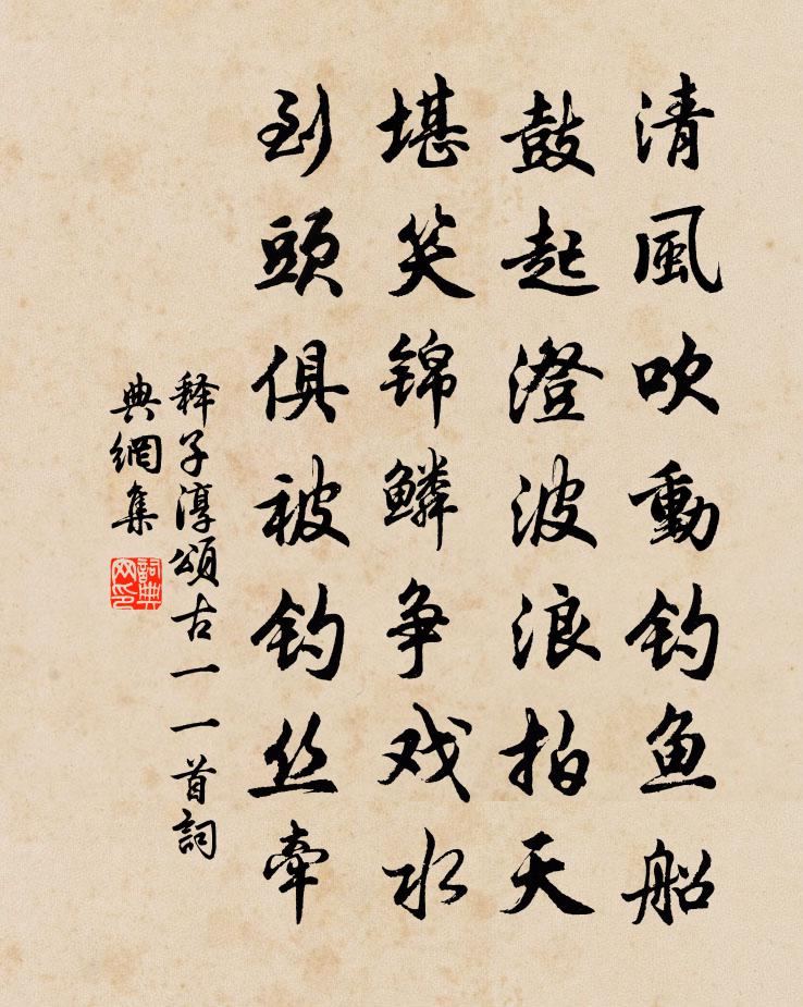 詩詞名句歷史字典書法欣賞書法字典國語詞典說文解字康熙字典古漢語字典標 題 作 者 詩 句 頌古一○一首作者:釋子淳 朝代:宋代頌古一○一首原文清風吹動釣魚船,鼓起澄波浪拍天。堪笑錦鱗爭戲水,到頭俱被釣絲牽。詩詞問答問:頌古一○一首的作者是誰?答:釋子淳問:頌古一○一首寫於哪個朝代?答:宋代釋子淳頌古一○一首書法欣賞頌古一○一首書法作品詩詞推薦寄晁應之二首張耒〔宋代〕瑜珥瑤環豁眼明,碧梧翠竹照人清。同車汲黯今難忮,挾彈潘郎舊有名。自是風流襲家世,行看談笑取公卿。塵埃同室仇遠〔宋代〕同室過百指,一官寢四年。幸無乞米帖,何取買山錢。止酒陶元亮,思歸孟浩然。乾魚兼菜把,頗勝酌貪泉。山中期張芬不至李端〔唐代〕石堤春草碧,雙燕向西飛。悵望雲天暮,佳人何處歸。藥欄蟲網遍,苔井水痕稀。誰道嵇康懶,山中自掩扉。三月三日,自京到華陰,於水亭獨酌,寄裴六、薛八獨孤及〔唐代〕祗役匪遑息,經時客三秦。還家問節候,知到上巳辰。山縣何所有,高城閉青春。和風不吾欺,桃杏滿四鄰。舊友望漢陽柳色寄王宰李白〔唐代〕漢陽江上柳,望客引東枝。樹樹花如雪,紛紛亂若絲。春風傳我意,草木別前知。寄謝弦歌宰,西來定未遲。見梅袁甫〔宋代〕半月山行不識梅,近城纏見一枝開。呼童截竹敲冰水,盛取數枝隨轎來。驀山溪(效樵歌體)吳儆〔宋代〕清晨早起,小閣遙山翠。頮面整冠巾,問寢罷、安排菽水。隨家豐儉,不羨五侯鯖,軟煮肉,熟炊粳,適意為甘旨喜遷鶯(叔父生日)史浩〔宋代〕朱旂鳳闕展,弄罷五弦,南薰敲竹。雨糝桃蹊,錢浮荷沼,一瞬染成新綠。玉皇香案吏,曾是時、鶴飛江國。對此石湖葉茵〔宋代〕千古湖山人物,百年翰墨文章。寂寞梅花開處,一尊自酹寒香。東陽澗陳岩〔宋代〕澗平如划水流遲,湛碧溶溶可染衣。白石欄邊人不到,日明風細一鷗飛。偷聲木蘭花(仙呂調)張先〔宋代〕畫橋淺映橫塘路。流水滔滔春共去。目送殘暉。燕子雙高蝶對飛。風花將盡持杯送。往事只成清夜夢。莫更登樓。薄游杜甫〔唐代〕淅淅風生砌,團團日隱牆。遙空秋雁滅,半嶺暮雲長。病葉多先墜,寒花只暫香。巴城添淚眼,今夜復清光。次督洗泯韻洪皓〔宋代〕陰山趺坐匪逃秦,杖錫聊充觀國賓。君已無家攜愛子,我雖有室別慈親。頃年共詩同文館,今日俱為異域人。千里郡圃殘雪楊萬里〔宋代〕城外城中雪半開,遠峰依舊玉崔嵬。池冰綻處才如線,便有鴛鴦浮過來。玉樓春辛棄疾〔宋代〕往年巃嵸堂前路。路上人夸通判雨。去年拄杖過瓢泉,縣吏垂頭民笑語。學窺聖處文章古。清到窮時風味苦。尊前終風行周麟之〔宋代〕北風駕寒萬竅號,聲如八月江上濤。又疑大鵬上青霄,南溟水擊摶扶搖。昆陽陣敗虎豹嗥,撼城飛瓦千兵逃。焚輪有懷竹隱之筍復用前韻趙蕃〔宋代〕我家章泉旁,生事苦不足。惟餘數畝地,有竹森似束。別束夢寐之,詩語見編錄。況當萌茁時,熟杜樵採辱。官居頌古一百則釋正覺〔宋代〕言衣半夜付盧能,攪攪黃梅七百僧。臨際一枝 * 眼,瞎驢滅卻得人憎。心心相印,祖祖傳燈。夷平海岳,變化鯤挽趙秋曉胡駿升〔宋代〕父子同年錄,雲霄步武高。功名方夢蟻,宇宙適交鰲。岩壑淮南隱,詩文太白豪。九泉不可作,幾些續離騷。送張元直尉鹽官二首楊萬里〔宋代〕璧水寒薺客,春闈擢掛郎。折腰端小耐,整翮未須忙。德進官無小,詩癯譽更香。會看兩鸂鶆,飛下蓼灘傍。名句推薦誰憐一片影,相失萬重雲?杜甫《孤雁 / 後飛雁》 今夕不登樓,一年空過秋。高觀國《菩薩蠻·何須急管吹雲暝》 悽惻近長沙,地僻秋將盡楊冠卿《卜運算元·秋晚集杜句吊賈傅》 我行殊未已,何日復歸來。宋之問《題大庾嶺北驛》 三思而行,再思可矣。佚名《增廣賢文·上集》 大漠孤煙直,長河落日圓。王維《使至塞上》 舊苑荒台楊柳新,菱歌清唱不勝春。李白《蘇台覽古》 天下者、大具也,不可以小人有也,不可以小道得也,不可以小力持也。荀子《荀子·正論》 中夜四五嘆,常為大國憂。李白《經亂離後天恩流夜郎憶舊遊書懷贈江夏韋太守良宰》 樵人歸欲盡,煙鳥栖初定。孟浩然《宿業師山房期丁大不至 / 宿業師山房待丁大不至》