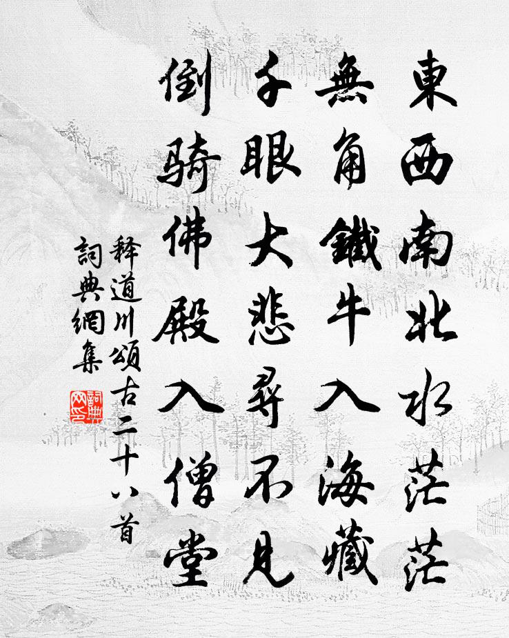 詩詞名句歷史字典書法欣賞書法字典國語詞典說文解字康熙字典古漢語字典標 題 作 者 詩 句 頌古二十八首作者:釋道川 朝代:宋代頌古二十八首原文東西南北水茫茫,無角鐵牛入海藏。千眼大悲尋不見,倒騎佛殿入僧堂。詩詞問答問:頌古二十八首的作者是誰?答:釋道川問:頌古二十八首寫於哪個朝代?答:宋代釋道川頌古二十八首書法欣賞頌古二十八首書法作品詩詞推薦洪景盧內翰為甘叔懷作碧崖修造疏戲題小詩奉周必大〔宋代〕碧崖道士拍洪肩,白水真人覓玉泉。我似東軒無一物,閣山風月不論錢。自責二首朱淑真〔宋代〕女子弄文誠可罪,那堪詠月更吟風。磨穿鐵硯非吾事,繡折金針卻有功。悶無消遣只看詩,不見詩中話別離。添得桃源憶故人佚名〔宋代〕庭槐沐雨翻新翠。疊雪香羅初試。鈴響彩旗天墜。忽報徐卿二。簾幃坐客歡聲沸。脫紫須煩半臂。借問月娥知未。九日用淵明韻二首方回〔宋代〕淵明謝督郵,猶有金石交。故人篤古誼,未隨霜葉雕。把菊東籬下,氣與南山高。顏生忽至止,雙鳳鳴青霄。我誓與道侶同於水陸寺會宿子蘭〔唐代〕論道窮心少有朋,此時清話昔年曾。柿凋紅葉鋪寒井,鵠墜霜毛著定僧。風遞遠聲秋澗水,竹穿深色夜房燈。出門臨江仙佚名〔宋代〕稱觴喜對二陽臨。況當弦月上,一醉祝千春。和危府教劉過〔宋代〕先生場屋文之虎,氣懾狐狸自不知。老去莫嫌官尚冷,灞橋風朋要新詩。水亭陸游〔宋代〕日淡暑猶薄,雨餘風更清。翛然水亭立,試此葛衣輕。曬粉憐孤蝶,穿枝喜晚鶯。誰知簿書里,也復得吾生!雨花台唐仲友〔宋代〕促膝紅爐擁肉圍,淺斟竹葉介繁禧。明年雪裡人應健,醉客詩成語益奇。戲掬巧爭肌玉瑩,快餐不省鬢絲垂。歸來岩桂餉鄭舜舉戲筆代柬陳棣〔宋代〕折得天葩滿袖香,小窗寂寂伴淒涼。何如乞與文園客,瑤髻斜簪試晚妝。封建論柳宗元〔唐代〕天地果無初乎?吾不得而知之也。生人果有初乎?吾不得而知之也。然則孰為近?曰:有初為近。孰明之?由封建挽郭知府李祥〔宋代〕平生孤苦范希文,蓋世功名自立身。要識鄉閭稱孝子,定知宗社作忠臣。一麾未足摶雲翼,五鼎猶懷念棘薪。悵望失調名王琪〔宋代〕金斗熨秋江。點絳唇 追和趙文敏公舊作十首客有持文敏公邵亨貞〔元代〕作長短句題於後。公以承平王孫而嬰世變,離黍之悲,有不能忘情者,故深得騷人意度。予生十有四年而公斃,每再用韻十首楊公遠〔宋代〕地僻人煙少,林深轍跡稀。折蕉當巨扇,裁葛作單衣。田綠秧初遍,梅紅雨後肥。茅檐喧鬧處,紫燕引雛飛。烏夜啼(八之四)陸游〔宋代〕世事從來慣見,吾生更欲何之。鏡湖西畔鞦韆頃,鷗鷺共忘機。一枕苹風午醉,二升菰米晨炊。故人莫訝音書絕,偈頌一百二十三首釋普度〔宋代〕八十翁翁輥繡球,誰知輥得意休休。如今逗到凌霄上,雲自高飛水自流。憩折山市袁甫〔宋代〕折山山下簇人煙,一似吳兒笑語喧。始信煙脂溪水媚,木瓜分得也嫣然。青龍寺題故曇上人房李端〔唐代〕遠公留故院,一徑雪中微。童子逢皆老,門人問亦稀。翻經徒有處,攜履遂無歸。空念尋巢鶴,時來傍影飛。春望思舊遊許渾〔唐代〕適意極春日,南台披薜蘿。花光晴漾漾,山色晝峨峨。湘水美人遠,信陵豪客多。唯憑一瓢酒,彈瑟縱高歌。名句推薦學術之微,四蠹害之也。黃宗羲《明儒學案·諸儒學案上·文正方正學先生孝孺》 望極春愁,黯黯生天際。柳永《蝶戀花·佇倚危樓風細細》 酒肆人間世,琴台日暮雲。杜甫《琴台》 蜂兒不解知人苦,燕兒不解說人愁。程垓《最高樓·舊時心事》 辜負我,悔憐君,告天天不聞。牛嶠《更漏子·春夜闌》 此路無知己,明珠莫暗投。高適《送魏八》 甘井近竭,招木近伐。墨子《墨子·01章 親士》 北極懷明主,南溟作逐臣。宋之問《途中寒食題黃梅臨江驛寄崔融》 藍橋春雪君歸日,秦嶺秋風我去時。白居易《藍橋驛見元九詩》 燕歸花謝,早因循、又過清明。納蘭性德《紅窗月·燕歸花謝》