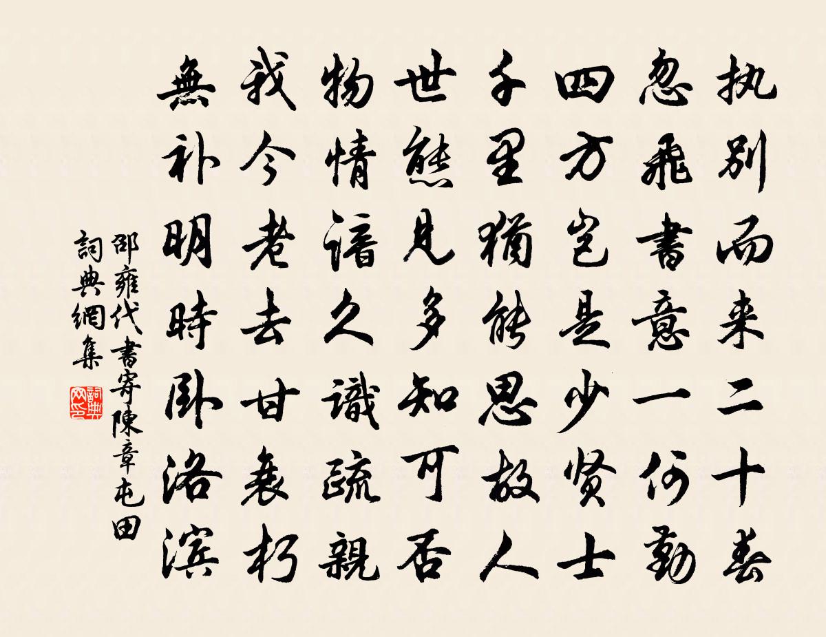 詩詞名句歷史字典書法欣賞書法字典國語詞典說文解字康熙字典古漢語字典標 題 作 者 詩 句 代書寄陳章屯田作者:邵雍 朝代:宋代代書寄陳章屯田原文執別而來二十春,忽飛書意一何勤。四方豈是少賢士,千里猶能思故人。世態見多知可否,物情諳久識疏親。我今老去甘衰朽,無補明時臥洛濱。詩詞問答問:代書寄陳章屯田的作者是誰?答:邵雍問:代書寄陳章屯田寫於哪個朝代?答:宋代邵雍代書寄陳章屯田書法欣賞代書寄陳章屯田書法作品詩詞推薦六月二十日夜渡海蘇軾〔宋代〕參橫斗轉欲三更,苦雨終風也解晴。雲散月明誰點綴,天容海色本澄清。空餘魯叟乘桴意,粗識軒轅奏樂聲。九死紫木筆花舒岳祥〔宋代〕簪筆侍臣輝荷橐,絲綸郎省照薇花。管城不任中書職,咄咄書空蘸晚霞。孔叢子引遺諺先秦無名〔先秦〕堯舜千鍾。孔子百觚。子路嗑嗑。尚飲十榼。會稽頌馬太守廟諸葛興〔宋代〕書畀姒兮力溝洫,民奠居兮勤稼穡。降嬴劉兮言水利,嘉鄴渠兮夸鄭國。慨元光兮瓠子決,彼鄃封兮河之北。悼一句秦韜玉〔唐代〕女媧羅裙長百尺,搭在湘江作山色。從軍北征李益〔唐代〕天山雪後海風寒,橫笛偏吹行路難。磧里征人三十萬,一時回向月明看。春晚山莊率題盧照鄰〔唐代〕顧步三春晚,田園四望通。遊絲橫惹樹,戲蝶亂依叢。竹懶偏宜水,花狂不待風。唯餘詩酒意,當了一生中。夢後寄歐陽永叔梅堯臣〔宋代〕不趁常參久,安眠向舊溪。五更千里夢,殘月一城雞。適往言猶在,浮生理可齊。山王今已貴,肯聽竹禽啼。戲題友人壁李商隱〔唐代〕花徑逶迤柳巷深,小闌亭午囀春禽。相如解作長門賦,卻用文君取酒金。庚申喜聞彭秋宇〔宋代〕萬方嘆喜 * ,數路飛書奏凱同。天擬諸公扶社稷,人言多難識英雄。周邦雖小名猶正,楚國方強力易窮。從此岩泉應虛室釋智愚〔宋代〕天籟發中靜,峰高遠出雲。有來非眼聽,無處足心聞,蒲冷禪衣弊,空虛月影分。大功終不宰,縱爾自云云。早起杜甫〔唐代〕春來常早起,幽事頗相關。帖石防隤岸,開林出遠山。一丘藏曲折,緩步有躋攀。童僕來城市,瓶中得酒還。樂居戶文輓詩項安世〔宋代〕藝應天王拜,名高月旦評。一官娛晚暮,千載遇恩榮。未許行疇昔,猶應得久生。年來頻見此,老淚不禁傾。經耒陽杜工部墓羅隱〔唐代〕紫菊馨香覆楚醪,奠君江畔雨蕭騷。旅魂自是才相累,閒骨何妨冢更高。騄驥喪來空蹇蹶,芝蘭衰後長蓬蒿。屈原哭柵石壁釋紹曇〔宋代〕心鏡交光十四年,誰知失照髑髏前。春風夢繞福城路,忍聽亂啼花塢鵑。補樂府十篇帝高辛氏之樂歌曹勛〔宋代〕田有黍稷,原有榛栗。尊卑秩秩,民有家室。門徑釋善珍〔宋代〕門徑莓苔古意深,閉門懶復事參尋。棋圖靜見孫吳法,樵唱真聞韶濩音。米盡有方烹白石,丹靈無意化黃金。花飛送姚先生歸宜山三首陳師道〔宋代〕老逢熙運乞前官,病遇先生得內丹。一飽有期吾事了,千年不死後人看。雁劉過〔宋代〕萬重山水萬重雲,歲負江南客此身。在末西風晚來急,數行飛下一汀苹。仲微殿丞以余多難退居洊貽誨問復緘新什以勉宋庠〔宋代〕朴遫參邦彥,幽憂負主恩。投身采樵路,脫籍上車門。病肘垂楊老,塵眸覆鑑昏。於陵三咽味,楚澤九升魂。喘甚名句推薦春雨樓頭尺八簫,何時歸看浙江潮?蘇曼殊《本事詩十首·選二》 舟遙遙以輕颺,風飄飄而吹衣。陶淵明《歸去來兮辭·並序》 秦女含顰向煙月,愁紅帶露空迢迢。溫庭筠《惜春詞》 應難奈,故人天際,望徹淮山,相思無雁足。史達祖《八歸·秋江帶雨》 故園書動經年絕,華發春唯滿鏡生。崔塗《春夕》 歲寒,然後知松柏之後凋也。孔子弟子《論語·子罕篇》 惟天下至誠,為能盡其性。宋祁、歐陽修、范鎮、呂夏卿等《新唐書·列傳·卷八十二》 同來不得同歸去,故國逢春一寂寥!杜牧《宣州送裴坦判官往舒州時牧欲赴官歸京》 重岩疊嶂,隱天蔽日。酈道元《三峽》 鄉淚客中盡,孤帆天際看。孟浩然《早寒江上有懷 / 早寒有懷 / 江上思歸》