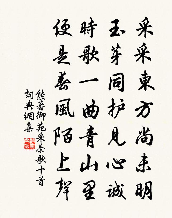 詩詞名句歷史字典書法欣賞書法字典國語詞典說文解字康熙字典古漢語字典標 題 作 者 詩 句 御苑採茶歌十首作者:熊蕃 朝代:宋代御苑採茶歌十首原文采采東方尚未明,玉芽同護見心誠。時歌一曲青山里,便是春風陌上聲。詩詞問答問:御苑採茶歌十首的作者是誰?答:熊蕃問:御苑採茶歌十首寫於哪個朝代?答:宋代熊蕃御苑採茶歌十首書法欣賞御苑採茶歌十首書法作品詩詞推薦效杜甫七歌在長洲縣作余懷〔清代〕有客有客字船子,平生赤腳踏海水。身經戰鬥少睡眠,功名富貴徒為爾。自比稷契何其愚,非薄湯武良有以。嗚呼水龍吟 次前韻二首許有壬〔元代〕此身就健宜閒,莫教七十才休致。招讒賈怨,聲名*赫,文章雄麗。三紀紅塵,一簪華發,消磨豪氣。有清泉白石漫興鄭樵〔宋代〕初秋一雨新涼,子夜長吟未央。階下花枝冷艷。堂前佛火微茫。道無情尹志平〔元代〕不避春風迢遞。來往默通真意。那個是吾家。信天涯。本性玄通無托。到處一身安樂。了了沒西東。住雲峰。雜詠八首上禮部李侍郎幽琴劉長卿〔唐代〕月色滿軒白,琴聲宜夜闌。飀飀青絲上,靜聽松風寒。古調雖自愛,今人多不彈。向君投此曲,所貴知音難。送吉中孚拜官歸業李端〔唐代〕南入華陽洞,無人古樹寒。吟詩開舊帙,帶綬上荒壇。因病求歸易,沾恩更隱難。孟宗應獻鮓,家近守漁官。次韻答琳老毛滂〔宋代〕雲水肝腸要掃除,筆頭費盡淡工夫。居山應免逢京兆,過我聊當見子虛。夜臥春蒲諸念冷,晚吟秋漢一峰孤。打包西還壽安路西歇馬白居易〔唐代〕槐陰歇鞍馬,柳絮惹衣巾。日晚獨歸路,春深多思人。去家才百里,為客只三旬。已念紗窗下,應生寶瑟塵。從蘇公登後樓陳師道〔宋代〕倏作三年別,才堪一解顏。樓孤帶清洛,林缺見巴山。五月池無水,千年鶴自還。白鷗沒浩蕩,愛惜鬢毛斑。奉節朱尉宋祁〔宋代〕初命東南尉,征途上下弦。傳家萬石貴,結綬半綸鮮。邑籍饒岷芋,公囊滿鄧錢。仙才今有助,銘閣待新篇。和慎思寄次張弟蔡肇〔宋代〕南山千畝龍蛇窟,半夜春雷起屈盤。欲釣六鰲滄海去,為留春筍作長竿。贈羅竹山術者牟巘五〔宋代〕鞾紋紙帳稻畦衲,榾柮地爐煨芋供。此是人間真富貴,莫針輕易許渠儂。提刑使者還嘉州宋祁〔宋代〕使者艤行舟,是行及淒序。祖帳俯平沙,從騎羅前渚。一進酒惟醴,再進魴及鱮。還客已少悰,況將暌宴語。勁風無題二首李商隱〔唐代〕昨夜星辰昨夜風,畫樓西畔桂堂東。身無彩鳳雙飛翼,心有靈犀一點通。隔座送鉤春酒暖,分曹射覆蠟燈紅。嗟余新植海石榴柳宗元〔唐代〕弱植不盈尺,遠意駐蓬瀛。月寒空階曙,幽夢彩雲生。糞壤擢珠樹,莓苔插瓊英。芳根閟顏色,徂歲為誰榮。艤舟清江鎮從任子嚴運使求菊周必大〔宋代〕陶令思歸未得歸,黃花想見繞東籬。滿頭須插何容易,且向盤園乞一枝。永叔寄詩八首並祭子漸文一首因采八詩之意警梅堯臣〔宋代〕昔聞退之與東野,相與結交賤微時。孟不改貧韓漸貴,二人情契都不移。韓無驕矜孟無靦,直以道義為己知。我今上晁主客陳師道〔宋代〕兩疏父子共含香,不獨家榮國有光。剩欲展懷因問疾,孰知相對只銜觴。年侵身要兼人健,節近花須滿意黃。從此入蕪湖港過吉祥寺岳珂〔宋代〕昔時曾訪後山松,天道那令霸業窮。夾岸人觀新太守,擁門僧認舊詩翁。隱磯漫指六朝事,魯港嘗淹五宿風。從此虞美人劉辰翁〔宋代〕猶疑綠萼花微甚。難與青蓮並。青蓮朵朵是天人。又向天人想見、洛陽春。多情素質塵生步。況被潘妃污。此花仍名句推薦便做春江都是淚,流不盡,許多愁。秦觀《江城子·西城楊柳弄春柔》 尺蠖之屈,以求信也;龍蛇之蟄,以存身也。佚名《易傳·繫辭傳下·第五章》 春風對青冢,白日落梁州。張喬《書邊事》 帶雨牡丹無氣力,黃鸝愁雨濕。汪莘《謁金門·簾漏滴》 孤燈寒照雨,濕竹暗浮煙。司空曙《雲陽館與韓紳宿別》 一曲危弦斷客腸。津橋捩柂轉牙檣。嚴仁《鷓鴣天·惜別》 何當金絡腦,快走踏清秋。李賀《馬詩二十三首》 地冷葉先盡,谷寒雲不行。李白《冬日歸舊山》 喜得故人同待詔,擬沽春酒醉京華。高啟《清明呈館中諸公》 長江巨浪征人淚,一夜西風共白頭。宋琬《江上阻風》