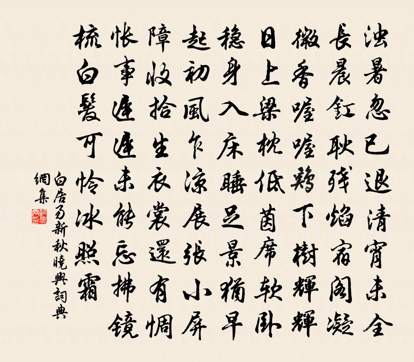 詩詞名句歷史字典書法欣賞書法字典國語詞典說文解字康熙字典古漢語字典標 題 作 者 詩 句 新秋曉興作者:白居易 朝代:唐代新秋曉興原文濁暑忽已退,清宵未全長。晨釭耿殘焰,宿閣凝微香。喔喔雞下樹,輝輝日上樑。枕低茵席軟,臥穩身入床。睡足景猶早,起初風乍涼。展張小屏障,收拾生衣裳。還有惆悵事,遲遲未能忘。拂鏡梳白髮,可憐冰照霜。詩詞問答問:新秋曉興的作者是誰?答:白居易問:新秋曉興寫於哪個朝代?答:唐代問:新秋曉興是什麼體裁?答:五古問:白居易的名句有哪些?答:白居易名句大全白居易新秋曉興書法欣賞新秋曉興書法作品注釋全唐詩詩詞推薦欲之新鄉答崔顥綦毋潛李頎〔唐代〕數年作吏家屢空,誰道黑頭成老翁。男兒在世無產業,行子出門如轉蓬。吾屬交歡此何夕,南家搗衣動歸客。銅爐臨石步港徐鉉〔唐代〕碕岸隳縈帶,微風起細漣。綠陰三月後,倒影亂峰前。吹浪遊鱗小,黏苔碎石圓。會將腰下組,換取釣魚船。湖南江西道中十首劉克莊〔宋代〕派里人人有集開,競師山谷友誠齋。只饒白下騎驢叟,不敢勾牽入社來。獨醉元稹〔唐代〕一樹芳菲也當春,漫隨車馬擁行塵。桃花解笑鶯能語,自醉自眠那藉人。送趙判官赴黔府中丞叔幕李白〔唐代〕廓落青雲心,結交黃金盡。富貴翻相忘,令人忽自曬。蹭蹬鬢毛斑,盛時難再還。巨源咄石生,何事馬蹄間?綠蘿寄題忠州小樓桃花白居易〔唐代〕再游巫峽知何日?總是秦人說向誰?長憶小樓風月夜,紅欄幹上兩三枝。秋霖曲錢起〔唐代〕君不見聖主旰食憂元元,秋風苦雨暗九門。鳳凰池裡沸泉騰,蒼龍闕下生雲根。 * 離畢太淹度,倦鳥將歸不知樹禱富沙華岳〔宋代〕十年蹤跡淖泥沙,為炷靈香禱富沙。萬里無由詣霜闕,一書聊欲為星槎。解驂許我來齊晏,釋縛從君問左車。他日雪中尋友不遇司馬光〔宋代〕擁袖犯風雪,驅車行詣誰。朱門不可入,素友復難期。依世誠多拙,迷方忽自悲。褊心終寡合,吾道易參差。窗前古槐二首裘萬頃〔宋代〕密葉繁陰畫不成,捲簾雙眼為渠明。人間炎熱無來處,贏得軒窗分外清。次韻瀹留避地有憶欲歸因用前韻示之陳著〔宋代〕離亂身命危,煩惱頭髮折。我兒在山南,百書饒苦舌。誰知我憶兒,如火煅心鐵。人生恩愛海,各自憐骨血。初謂賀廣東黃漕生辰六絕曾豐〔宋代〕數從仙伯至仙公,一歲一仙三歲中。三歲三遷吾事足,歸驕明月弄清風。代陳季若上張帥林光朝〔宋代〕峨峨雙闕晝煙橫,玉籙金箱記姓名。況有曲江家舊渚,小虹橋外柳花輕。朱尚書夫人洪氏輓詞戴栩〔宋代〕八座方新玉鉉家,妝檯忽掩五雲賒。徽聲不愧古彤管,覺性能空曇缽花。夜月東岡疏磬度,春風南國去旌斜。所親遠遊聯句韓愈〔唐代〕別腸車輪轉,一日一萬周。 ——孟郊離思春冰泮,爛漫不可收。 ——韓愈馳光忽以迫,飛轡誰能留。 ——孟太上皇帝合端午帖子詞汪應辰〔宋代〕火德方居夏,端符帝運亨。化工初不宰,繼照付重明。哭張唐公王安石〔宋代〕堂邑山林久寂寥,屬車前日駐雞翹。冥冥獨鳳隨雲霧,南陌空聞引葬簫。重陽吟五首方回〔宋代〕此身生死國興亡,搖落年年本是常。無奈潘郎解悽怨,滿城風雨近重陽。春貼子皇帝閣六首真德秀〔宋代〕進陰消屬此一時,凝旒南面盍深思。微臣自愧無規諫,原獻元朝學士詩。寓言九首王安石〔宋代〕詵詵古之士,出必見禮樂。群游與群飲,仁義待揚搉。心疲歌舞荒,耳聒米鹽濁。所以後世賢,絕俗乃為學。名句推薦謝亭離別處,風景每生愁。李白《謝公亭·蓋謝朓范雲之所游》 借與門前磐石坐,柳陰亭午正風涼。范成大《夏日田園雜興》 空自覺、圍羞帶減,影怯燈孤。張炎《渡江雲·山陰久客一再逢春回憶西杭渺然愁思》 乍暖還輕冷。張先《青門引·春思》 爾曹身與名俱滅,不廢江河萬古流。杜甫《戲為六絕句·其二》 人善被人欺,馬善被人騎。佚名《增廣賢文·上集》 照野瀰瀰淺浪,橫空隱隱層霄。蘇軾《西江月·頃在黃州》 何處它年寄此生,山中江上總關情。虞集《院中獨坐》 寫不成書,只寄得、相思一點。張炎《解連環·孤雁》 提三尺劍以定四海吳兢《貞觀政要·卷八·論貢賦》