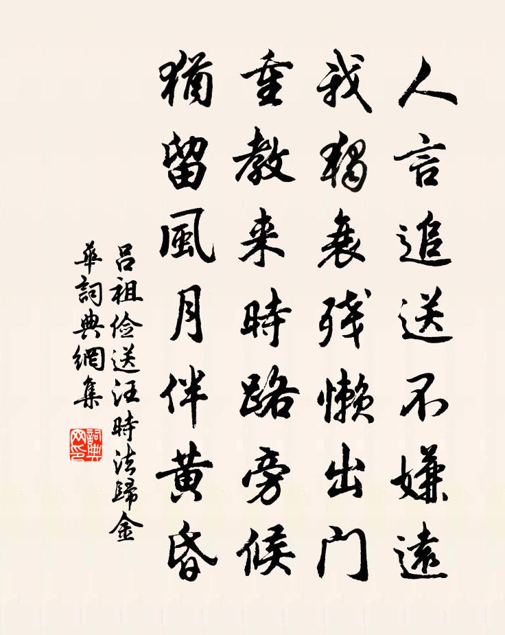 詩詞名句歷史字典書法欣賞書法字典國語詞典說文解字康熙字典古漢語字典標 題 作 者 詩 句 送汪時法歸金華作者:呂祖儉 朝代:宋代送汪時法歸金華原文人言追送不嫌遠,我獨衰殘懶出門。重教來時路旁候,猶留風月伴黃昏。詩詞問答問:送汪時法歸金華的作者是誰?答:呂祖儉問:送汪時法歸金華寫於哪個朝代?答:宋代呂祖儉送汪時法歸金華書法欣賞送汪時法歸金華書法作品詩詞推薦南城懷古 其二王冕〔元代〕青山連壁是居庸,古北漁陽一線通。人物盡隨風土變,川原須是古今同。淡煙著柳金溝暗,小雨飛花玉殿空。昨夜過德清姜夔〔宋代〕木酊誰家縹緲亭,畫堂臨水更虛明。經過此處無相識,塔下秋云為我生。葉伯宇和霞字韻計再作一篇王洋〔宋代〕全似襄陽隱士家,只添靈照減丹霞。晚山寒後猶疑遠,古木春來亦好華。酒似竹光仍斬綠,人如錦面更添花。了知望江南張繼先〔宋代〕四通九達,青玉交輝。天作高山,地靈若此。常相謂曰:身處真人之墟,而不知也。登戲珠峰,以見虎蹲龍躡,遠□後圃成三絕句馮伯規〔宋代〕家山稍遠夢難到,郡事漸希詩作魔。句就欲煩相催和,夜窗無奈透霜何。有感吟王冕〔元代〕昨宵風雨多,新愁亂無數。洛陽城西富貴家,舊時台榭今何處?枯藤古樹棲老烏,敗垣荒草藏狐兔。好花不見春風仲春感懷強至〔宋代〕春色愁邊已不濃,眼開天地久陰中。亂紅雜下殘花雨,暗綠兼飛弱柳風。生計荒蕪有酒盞,交期零落減詩筒。多情山中自賦文天祥〔宋代〕□□□□□□□,門外蒼松一水修。不必清高逼巢許,只教瀟灑勝由求。空花自滿三千界,老樹相看五百秋。坐有詠意白居易〔唐代〕常聞南華經,巧勞智憂愁。不如無能者,飽食但遨遊。平生愛慕道,今日近此流。自來潯陽郡,四序忽已周。不分寄題安福斯人家賞靜軒聽雨二首趙蕃〔宋代〕有聽輒有感,所關非所聞。小軒渠對雨,無地我看雲。大被清霜曉,短檠寒夜分。朝昏解同趣,南北謝離群。春夜峽州田侍御長史津亭留宴(得筵字)杜甫〔唐代〕北斗三更席,西江萬里船。杖藜登水榭,揮翰宿春天。白髮煩多酒,明星惜此筵。始知雲雨峽,忽盡下牢邊。勞坑入前城黃庭堅〔宋代〕刀坑石如刀,勞坑人馬勞。窈窕篁竹陰,是常主逋逃。白狐跳梁去,豪豬森怒嘷。雲黃覺日瘦,木落知風饕。輕軒與胡祠部游法華山蘇軾〔宋代〕陂湖欲盡山為界,始見寒泉落高派。道人未放泉出山,曲折虛堂瀉清快。使君年老尚兒戲,綠棹紅船舞澎湃。一笑啜建溪新茗李文授有二絕句次韻曾幾〔宋代〕壑源今日為君傾,可當杯盤瀉濁清。未到舌根先一笑,風爐石鼎雨來聲。和司馬博士詠雪詩何遜〔南北朝〕凝階夜似月。拂樹曉疑春。蕭散忽如盡。徘徊已復新。暫蔽卷紈質。復慚施粉人。若逐微風起。誰言非玉塵。【中呂】普天樂_吳門客中九任昱〔元代〕吳門客中九秋天,三吳地,江空寒早,天遠書遲。 * 開,丹楓墜。流水行雲無拘系,好光陰枉自驅馳。塵心自洗閏月二日雨三日復雨寄斯遠三首趙蕃〔宋代〕大雨固滂霈,小雨更霢霂。蕭然涼已生,隱若雷未伏。前時歷月陰,邇日連朝暴。早田有愁乾,菜本亦恐縮。居閒觀獵羅公升〔宋代〕詭御羞禽獲,隨車忍獸呼。為敺須桀紂,況逐欠陳吾。三月望日微雨汎舟西湖四首張鎡〔宋代〕非是天慳一日晴,晦明多態屬詩人。雲翻畫樣烘蒙墨,波卷紋頭起突銀。酒泉子·黛薄紅深顧敻〔五代〕黛薄紅深,約掠綠鬟雲膩。小鴛鴦,金翡翠,稱人心。錦鱗無處傳幽意,海燕蘭堂春又去,隔年書,千點淚,恨難名句推薦斜日更穿簾幕,微涼漸入梧桐。晏殊《破陣子·燕子欲歸時節》 輕則寡謀,驕則無禮。左丘明《國語·周語·王孫滿觀秦師》 悠悠卷旆旌,飲馬出長城。李世民《飲馬長城窟行》 三春白雪歸青冢,萬里黃河繞黑山。柳中庸《征人怨 / 征怨》 重幃深下莫愁堂,臥後清宵細細長。李商隱《無題·重幃深下莫愁堂》 寒燈思舊事,斷雁警愁眠。杜牧《旅宿》 已是黃昏獨自愁,更著風和雨。陸游《卜運算元·詠梅》 盛年不重來,一日難再晨。陶淵明《雜詩·人生無根蒂》 剛待不思量,吹一片、簫聲過牆。項鴻祚《太常引·客中聞歌》 月既不解飲,影徒隨我身。李白《月下獨酌四首·其一》