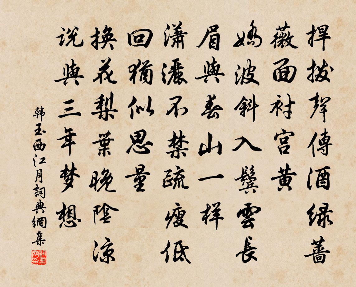 詩詞名句歷史字典書法欣賞書法字典國語詞典說文解字康熙字典古漢語字典標 題 作 者 詩 句 西江月作者:韓玉 朝代:宋代西江月原文捍撥聲傳酒綠,薔薇面襯宮黃。嬌波斜入鬢雲長。眉與春山一樣。瀟灑不禁疏瘦,低回猶似思量。換花梨葉晚陰涼。說與三年夢想。詩詞問答問:西江月的作者是誰?答:韓玉問:西江月寫於哪個朝代?答:宋代問:西江月是什麼體裁?答:詞韓玉西江月書法欣賞西江月書法作品詩詞推薦聞師文過錢塘二首陳造〔宋代〕行役兒無慮,衰懷自不忘。待潮何處泊,聽雨共更長。指俟烏供哺,先容雁著行。更寬三日計,茫蒼下歸艎。歙州道中仆逃趙嘏〔唐代〕去跳風雨幾奔波,曾共辛勤奈若何。莫遣窮歸不知處,秋山重疊戍旗多。題李伯時赤腳仙方回〔宋代〕可是驢蹄復馬蹄,忍將玉雪污污泥。世情{左血右戲}險君知否,滿地人間鐵蒺藜。送江季恭陳師道〔宋代〕正學元非世,能詩新有聲。諸公交鄭季,多士閉何生。泛愛經過數,移書底里傾。又為淮海別,病眼向誰明。和韓司諫叔夏樂谷五吟布被胡寅〔宋代〕昔年司馬公,清德如伯夷。簞瓢不改樂,又似吾先師。平生一布被,天地乃吾知。豈比平津侯,挾詐坐受嗤。公今祫饗禮成宋庠〔宋代〕孝饗邦儀重,親祠祏室開。推尊二祧合,獻力九賓來。寶蔡前涓日,祥霙近弭災。鉤陳嚴法仗,綿蕝謹容台。祓坐採桑子 贈獲嘉王法師(原無調名茲據律補)譚處端〔元代〕譚風偏喜王三父,夙世良緣。休更推延。妻惡兒嫌出世*。修行外用無為作,囚馬擒猿。不返家園。定做逍遙物外養家苦馬鈺〔元代〕養家苦,似蜂虔。採花成蜜為誰甜。肯堤防,蛛網粘。修行好,做風虔。舌生津液玉漿甜。溉黃芽,無惹粘。上浙西張帥十首廖行之〔宋代〕條教初頒洽里閭,米鹽靡密見紆餘。而今坐嘯鈴齋肅,雁鶩行空無簿書。東坡三絕句蘇籀〔宋代〕為文赤壁並黃坂,奇韻平生想像中。延目練江咨逝水,舉頭碧落看飛鴻。鷓鴣吟二首邵雍〔宋代〕人間重者是黃金,誰道黃金無處尋。不著閒辭文雅意,更將何事悅良心。遠山西面供清潤,幽鳥千般送好音。無限明堂侍祠十絕楊簡〔宋代〕千官移仗拱端門,一日雞竿萬里春。湯網本疏民自格,要知家法在深仁。續韋蟾句武昌妓〔唐代〕悲莫悲兮生別離,登山臨水送將歸。武昌無限新栽柳,不見楊花撲面飛。遣懷貢師泰〔元代〕日入柳風息,月上花露多。東軒頗幽敞,夜靜時一過。鳥散庭中樹,蟲鳴階下莎。北斗何低昂,疏星沒橫河。獨賞偈頌七十二首釋祖欽〔宋代〕東君有令不虛行,三頓烏藤大險生。龍得水時增意氣,虎逢山色長威獰。上知府大同王太尉六首魏野〔宋代〕健擁旌幢七十餘,苦吟還似在山居。腹中萬卷猶嫌少,更待鄰州借僻書。故太夫人章氏輓詞二首范成大〔宋代〕積慶今如許,生兒得寧馨。軻親躬授教,韋子世傳經。壽斝明卿月,安輿拱使星。市橋何處在?夢斷一溪青。對應致語口號李曾伯〔宋代〕相對封人共祝堯,玉觴瀲灩酒浮椒。千山佳氣供紅旆,一道仁聲賴翠軺。南極爺祈天上壽,東風不隔海濱遙。恩濃孟子博學反約陳普〔宋代〕事理紛紛未易窮。其間脈終要通融。能於博處知其約,漸次收功一貫中。楚翁別五年丙午四月來山中風雨數日因話舊作黎廷瑞〔宋代〕五載期君君不來,悠悠世路忽相猜。從今無事長相見,縱使百年能幾回。名句推薦登高壯觀天地間,大江茫茫去不還。李白《廬山謠寄盧侍御虛舟》 巧偽不如拙誠顏之推《顏氏家訓·名實篇》 一為遷客去長沙,西望長安不見家。李白《與史郎中欽聽黃鶴樓上吹笛 / 題北榭碑》 雨中山果落,燈下草蟲鳴。王維《秋夜獨坐 / 冬夜書懷》 中也者,天下之大本也。和也者,天下之達道也。子思《中庸·第一章》 粉身碎骨渾不怕, 要留清白在人間于謙《石灰吟》 又酒趁哀弦,燈照離席。梨花榆火催寒食。周邦彥《蘭陵王·柳》 松葉堪為酒,春來釀幾多。張九齡《答陸澧》 綠波春浪滿前陂,極目連雲稏肥。韋莊《稻田》 青紫雖被體,不如早還鄉。杜甫《夏夜嘆》