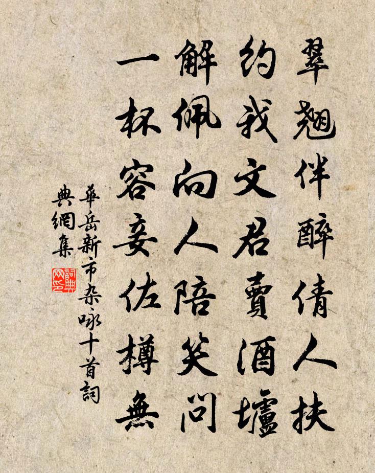 詩詞名句歷史字典書法欣賞書法字典國語詞典說文解字康熙字典古漢語字典標 題 作 者 詩 句 新市雜詠十首作者:華岳 朝代:宋代新市雜詠十首原文翠翹伴醉倩人扶,約我文君賣酒壚。解佩向人陪笑問,一杯容妾佐樽無。詩詞問答問:新市雜詠十首的作者是誰?答:華岳問:新市雜詠十首寫於哪個朝代?答:宋代華岳新市雜詠十首書法欣賞新市雜詠十首書法作品詩詞推薦夏日西湖閒居十首汪莘〔宋代〕清夜湖心把酒杯,花間風月共徘徊。金鐘何事催天曉,又恐遊人相逐來。句李燾〔宋代〕平蓋神仙院,武陽山水鄉。池邊梅花一株盛開王炎〔宋代〕老來裘褐怯風吹,難傍花邊把一卮。嚼蕊嗅香清興在,尚呵凍筆欲題詩。藍上茅茨期王維補闕儲光羲〔唐代〕山中人不見,雲去夕陽過。淺瀨寒魚少,叢蘭秋蝶多。老年疏世事,幽性樂天和。酒熟思才子,溪頭望玉珂。偈頌一百零一首釋慧性〔宋代〕離四句,絕百非。一言已出,駟馬難追。一任金鳥東出,徒教玉兔沈西。千鈞之弩,不為鼷鼠而發機。送撫州周使君(即侍中之婿)盧綸〔唐代〕周郎三十餘,天子賜魚書。龍節隨雲水,金鐃動里閭。松聲三楚遠,鄉思百花初。若轉弘農守,蕭鹹事不如。同孫子直和李參政東園韻十絕洪咨夔〔宋代〕狂蝶正便春從臾,好花猶怯冷禁持。從渠歌徹鐵如意,輸我興來金屈卮。題段氏中台趙嘏〔唐代〕看山台下水無塵,碧筱前頭曲水春。獨對一尊風雨夜,不知家有早朝人。題徐熙芍藥吳皇后〔宋代〕稼李夭桃掃地無,眼明驚見玉盤盂。揚州省識春風面,看盡群花總不如。滿江紅(二月廿四夜海棠花下作)劉克莊〔宋代〕老子年來,頗自許、心腸鐵石。尚一點、消磨未盡,愛花成癖。懊惱每嫌寒勒住,丁寧莫被晴烘坼。柰暄風烈日太題善權寺張祜〔唐代〕碧峰南一寺,最勝是仙源。峻坂依岩壁,清泉泄洞門。金函崇寶藏,玉樹閟靈根。寄謝香花叟,高蹤不可援。葉上題詩從苑中流出顧況〔唐代〕花落深宮鶯亦悲,上陽宮女斷腸時。君恩不閉東流水,葉上題詩寄與誰。惠首座寫師像求贊釋正覺〔宋代〕衰颯儀容,僶俛頹慵。玲瓏岩寺,夭矯雲松。艷冷晚秋菊,韻清霜曉鍾。剎剎塵塵三昧事,知音何處不相逢。李固道中懷寄杜邯鄲賀鑄〔宋代〕西望叢台百尺間,車輪無角不知還。大夫庭下長無訟,誰伴青堂整日閒。奉和別魯王李敬玄〔唐代〕綠車旋楚服,丹蹕佇秦川。珠皋轉歸騎,金岸引行旃。一朝限原隰,千裡間風煙。鶯喧上林谷,鳧響御溝泉。斷雲余處恭少師左相郇公輓辭三首其楊萬里〔宋代〕天下非無士,胸中自有人。如何初拜相,首薦一遺民。恩我丘山小,懷公骨肉親。白頭哭知已,東望獨傷神。發邛州寄友人唐求〔唐代〕茫茫驅一馬,自嘆又何之。出郭見山處,待船逢雨時。曉雞鳴野店,寒葉墮秋枝。寂寞前程去,閒吟欲共誰。水調歌頭(游武夷)覃懷高〔宋代〕翠蕤插雲表,初意隔仙凡。臨風據案一見,邂逅似開顏。幾欲拿舟九曲,便擬捫參絕頂,直下俯塵寰。聊此稅吾駕八駿圖杜荀鶴〔唐代〕丹雘傳真未得真,那知筋骨與精神。只今恃駿憑毛色,綠耳驊騮賺 * 。與錢端修諸公飲興福朱翌〔宋代〕積陰解盡可信眉,梵宇仍容款扣扉。山淨且無塵一點,湖平惟有鷺雙飛。杯行客惡思傳令,劫急棋爭看解圍。招隱名句推薦楊柳千條拂面絲,綠煙金穗不勝吹。溫庭筠《題柳》 漆燕黃鸝夸舌健,柳花榆莢斗身輕。王禹偁《清明日獨酌》 黃河落天走東海,萬里寫入胸懷間。李白《贈裴十四》 愛多者則法不立,威寡者則下侵上。韓非及後人《韓非子·內儲說上七術》 與朋友交,言而有信。孔子弟子《論語·學而篇》 惡無定議,莫以惡為惡者顯;善無定評,勿以善為善者安。來俊臣《羅織經·保身卷第七》 人不通今古,馬牛如襟裾。佚名《增廣賢文·上集》 蘭舟斜纜垂揚下,只宜輔枕簟向涼亭披襟散發。白樸《得勝樂·夏》 送子軍中飲,家書醉里題。岑參《磧西頭送李判官入京》 江上小堂巢翡翠,苑邊高冢臥麒麟。杜甫《曲江二首》