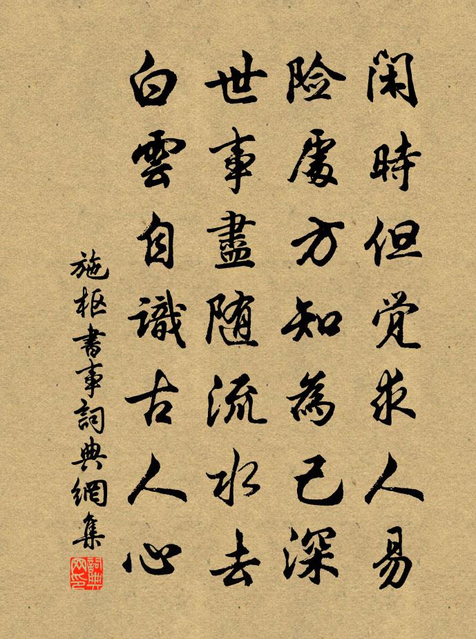 詩詞名句歷史字典書法欣賞書法字典國語詞典說文解字康熙字典古漢語字典標 題 作 者 詩 句 書事作者:施樞 朝代:宋代書事原文閒時但覺求人易,險處方知為己深。世事盡隨流水去,白雲自識古人心。詩詞問答問:書事的作者是誰?答:施樞問:書事寫於哪個朝代?答:宋代施樞書事書法欣賞書事書法作品詩詞推薦送德珉山主釋重顯〔宋代〕溪山春色映雲袍,愛住隍城意轉高。翻笑忘機自安者,不能垂手入塵勞。致政宋君輓詩魏了翁〔宋代〕窗寒研冷一生酸,坎止流行百念寬。劍騎已荒江北草,簡編歸伴室中蘭。孰痴孰覺從渠看,真是真非只我觀。掩淚泛舟觀雨張嵲〔宋代〕雲氣交流晝窈冥,疾風吹雨雜荷聲。山隨明晦姿橫出,舟入渺茫詩漸成。托跡江湖三畝足,放懷天地一身輕。銜杯題畫十首唐寅〔明代〕山意蔥蘢釀早寒,數家茅屋是漁灘。分明苕霅溪頭路,何日歸家買木蘭。三月初晚晴寄高縉之三首陳造〔宋代〕曲欄倚青冥,萬井入指顧。湖光漾明霞,照我憑欄處。森木倦鳥歸,遙空征鴻度。定知待月人,破竹有奇句。題鄜州相思鋪 / 令狐楚詩令狐挺〔宋代〕誰把相思號此河,塞垣車馬往來多。祇應自古征人淚,灑向空川作浪波。寒食哭承甫兄暮項安世〔宋代〕半世驅馳未白頭,無窮心事等閒休。生前可是門闌盛,身後寧知禍患稠。雄鳳已將凰共隱,靈椿仍與桂同秋。茫茫酬夢得窮秋夜坐即事見寄白居易〔唐代〕焰細燈將盡,聲遙漏正長。老人秋向火,小女夜縫裳。菊悴籬經雨,萍銷水得霜。今冬暖寒酒,先擬共君嘗。小築陸游〔宋代〕小築湖邊避俗囂,幾年於此寓簞瓢。雖非隱士子午谷,寧媿詩人丁卯橋?羅雀門庭無俗駕,緣雲磴路有歸樵。詩情龍眠墨梅張元乾〔宋代〕江南一枝春,歲久暗香滅。怪得深夜寒,荒村映殘雪。自羅浮行田宿華嚴寺葉適〔宋代〕浮山昔飛至,與羅合其巔。嚴冬樹色改,青松耀紅鵑。不種自生植,屢伐常蒼然。我病不暇耕,行復觀我田。呼扶賦枸杞蒲壽宬〔宋代〕神草如蓬世不知,壁間牆角自離離。辛盤空芼仙人杖,藥斧惟尋地骨皮。千歲未逢朱孺子,四時堪供陸天隨。霜晨姜總管輓詞樓鑰〔宋代〕及見開元盛,曾聞正始音。雕蟲徒壯歲,冠鶡豈初心。論事風生席,疏恩帶錫金。精神空滿腹,愁絕病沈沈。獨酌偶作梅堯臣〔宋代〕東路歸梁懶,黃流下汴深。眼穿南去翼,耳冷北來音。風雨昏斜日,乾坤入醉吟。不憂貧且老,自有伯鸞心。題淨因壁蘇軾〔宋代〕瞑倚 * 臥缽囊,半窗疏箔度微涼。蕉心不展待時雨,葵葉為誰傾夕陽。斃驢李洞〔唐代〕蹇驢秋斃瘞荒田,忍把敲吟舊竹鞭。三尺焦桐背殘月,一條藜杖卓寒煙。通吳白浪寬圍國,倚蜀青山峭入天。如畫洞橋范端臣〔宋代〕橋邊十丈水,折乾餘風霆。橋下一泓水,冷然照吾纓。世故暫如失,茲山得深行。賦得芙蓉出水賈謨〔唐代〕的皪舒芳艷,紅姿映綠蘋。搖風開細浪,出沼媚清晨。翻影初迎日,流香暗襲人。獨披千葉淺,不競百花春。魚戲秋居趙汝鐩〔宋代〕入得秋來爽,何煩宋玉悲。推窗對修竹,開卷裹諸兒。世事放輕著,人生無足時。年多自當老,不用染吟髭。南陽道中作竇鞏〔唐代〕東風雨洗順陽川,蜀錦花開綠草田。彩雉斗時頻駐馬,酒旗翻處亦留錢。新晴日照山頭雪,薄暮人爭渡口船。早晚名句推薦知音如不賞,歸臥故山秋。賈島《題詩後》 不怕慢,只怕站。佚名《增廣賢文·下集》 堪怨王孫,不記歸期早。梅堯臣《蘇幕遮·草》 梅以曲為美,直則無姿;龔自珍《病梅館記》 上有流思人,懷舊望歸客。謝朓《送江水曹還遠館》 吳洲如見月,千里幸相思。李白《送張舍人之江東》 止凡人之斗鬩,則堯舜之道,不如寡妻之誨諭。顏之推《顏氏家訓·序致篇》 白頭搔更短,渾欲不勝簪。杜甫《春望》 那裡有鬧紅塵香車寶馬?祗不過送黃昏古木寒鴉。王磐《古蟾宮·元宵》 夜長爭得薄情知,春初早被相思染。姜夔《踏莎行·自沔東來》