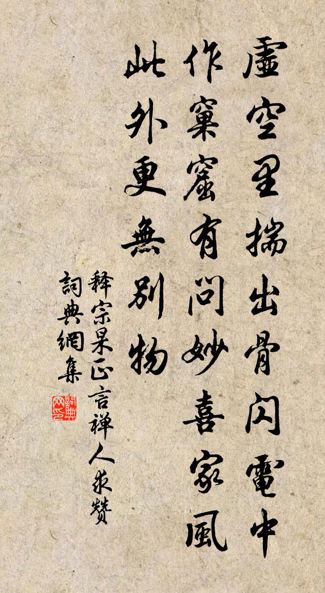 詩詞名句歷史字典書法欣賞書法字典國語詞典說文解字康熙字典古漢語字典標 題 作 者 詩 句 正言禪人求贊作者:釋宗杲 朝代:宋代正言禪人求贊原文虛空里揣出骨,閃電中作窠窟。有問妙喜家風,此外更無別物。詩詞問答問:正言禪人求贊的作者是誰?答:釋宗杲問:正言禪人求贊寫於哪個朝代?答:宋代釋宗杲正言禪人求贊書法欣賞正言禪人求贊書法作品詩詞推薦遺詩朱宮人〔宋代〕既不辱國,倖免辱身。世食宋祿,羞為北臣。妾輩之死,守於一貞。忠臣孝子,期以自新。自始興溪夜上赴嶺張九齡〔唐代〕嘗蓄名山意,茲為世網牽。征途屢及此,初服已非然。日落青岩際,溪行綠筱邊。去舟乘月後,歸鳥息人前。數曲寄王褒伯和明舉韻二首郭印〔宋代〕天涯初得子,氣味巧相如。地遠頻勞夢,心通少寄書。月亭空想像,風閣屢踟躕。別後無窮意,相逢只挽裾。朝中措趙彥端〔宋代〕新涼溪閣暮山重。水月共空濛。九轉不須塵外,三峰只在壺中。他年盛業,雲間可望,林下難逢。記取薌林岩洞,書南堂壁陸游〔宋代〕荒寒淺村步,隱翳小茅茨。偶逐漁樵住,都忘歲月移。閒惟接僧話,老始愛陶詩。耆齒猶須幾,羸然敢自期!石棧河在洪閘李廌〔宋代〕奔騰龍嶠麓,深壑斷如截。石棧架寒溪,盤陀臥精鐵。從衡布方楚,片段發文裂。平如中唐甓,罅密不容泄。南岩京師逢徐良溫叟明府強至〔宋代〕弱冠相逢今四十,當年壯氣虬龍蟄。交情獨在酒盞深,人事細論衣袖濕。詩書誤身浪自憐,公相滿眼誰可揖。蒼顏賦清映閣鄧深〔宋代〕數椽茅屋小橋頭,地段無多景自幽。為愛平池三尺水,最宜明月一輪秋。靜留人影搖歌扇,輕動風漣下釣鉤。相去緗梅陸游〔宋代〕疏影橫斜事已非,小園日暮鎖芳菲。素綃應怯東風思,故著重重淺色衣。簡斯遠兄趙蕃〔宋代〕已辦入城府,尚留緣雨陰。相期著屐過,空想掉頭吟。子故因貧出,余寧嘆老侵。鵷鸞滿台閣,麋鹿自山林。留題徐真君祠堂東西二室許將〔宋代〕上得山來過石門,謁靈特地乞真言。再三許我前程事,敢不留詩荷聖恩。楊柳枝 贈雲中子蘇鉉馬鈺〔元代〕猛棄榮華兒女妻。悟玄機。騰騰兀兀任無為。做憨痴。雲水不游芳草徑,內行持。功成行滿獨何之。赴瑤池。漁村遠望因思槐逕弟同游之樂薛嵎〔宋代〕滿山殘雪滿溪雲,唯有沙鷗獨見親。往事不堪頻入夢,吟篇無數更愁人。扁舟欲流同誰載,破衲蒙頭近六旬。尚擬與謬栓法同行口占分水嶺詩駱羅憲〔宋代〕盡道今年雨意稠,踏歌芒時偏東疇。微官祗有半豐願,一飽高眠萬事休。與所盤行溪邊有一小屋可愛問之乃為南山主人丘葵〔宋代〕相逢海上不須歸,兩鳥天教一處飛。何必盤中為子所,苟堪釣處是吾磯。主人合讓泉邊屋,吟友來敲月下扉。聞道雜詩黃庭堅〔宋代〕 * 淡盪不知津,老卻平生夢幻身。滿眼紛華心寂寞,長安市上酒家人。答問詩十二篇寄呈滿子權其二耒答鎛三首王令〔宋代〕我用於主人,良田無虛種。主人不我以,我適為無用。不知主人飢,歲卒安自奉。由來我求人,孰與求我重。用蜀行送徐隆慶守金州洪咨夔〔宋代〕兵家如弈棋,局局勢不同。漢王引兵故道出襲雍,武侯率師祁山搖關中。何曾踏陳跡,乃欲收新功。中興用蜀九十邊將張蠙〔唐代〕上馬乘秋欲建勛,飛弧夜闕出師頻。若無紫塞煙塵事,誰識青樓歌舞人。戰骨沙中金鏃在,賀筵花畔玉蟬新。由來竹枝歌十首汪元量〔宋代〕快風吹我入三巴,桂櫂蘭橈倚暮花。一道月明天似水,湘靈鼓瑟下長沙。名句推薦馬嘶芳草遠,高摟簾半掩。顧敻《醉公子·岸柳垂金線》 望千門如晝,嬉笑遊冶。周邦彥《解語花·上元》 致治之本,惟在於審。量才授職,務省官員。吳兢《貞觀政要·卷三·論擇官》 金剛則折,革剛則裂。劉向《說苑·敬慎》 錦里開芳宴,蘭缸艷早年。盧照鄰《十五夜觀燈》 君子之於子,愛之而勿面,使之而勿視,道之以道而勿強。荀子《荀子·大略》 江寒水不流,魚嚼梅花影。釋敬安《題寒江釣雪圖》 細讀離騷還痛飲,飽看修竹何妨肉。辛棄疾《滿江紅·山居即事》 分手脫相贈,平生一片心。孟浩然《送朱大入秦》 秋到長門秋草黃。畫梁雙燕去,出宮牆。薛昭蘊《小重山·秋到長門秋草黃》