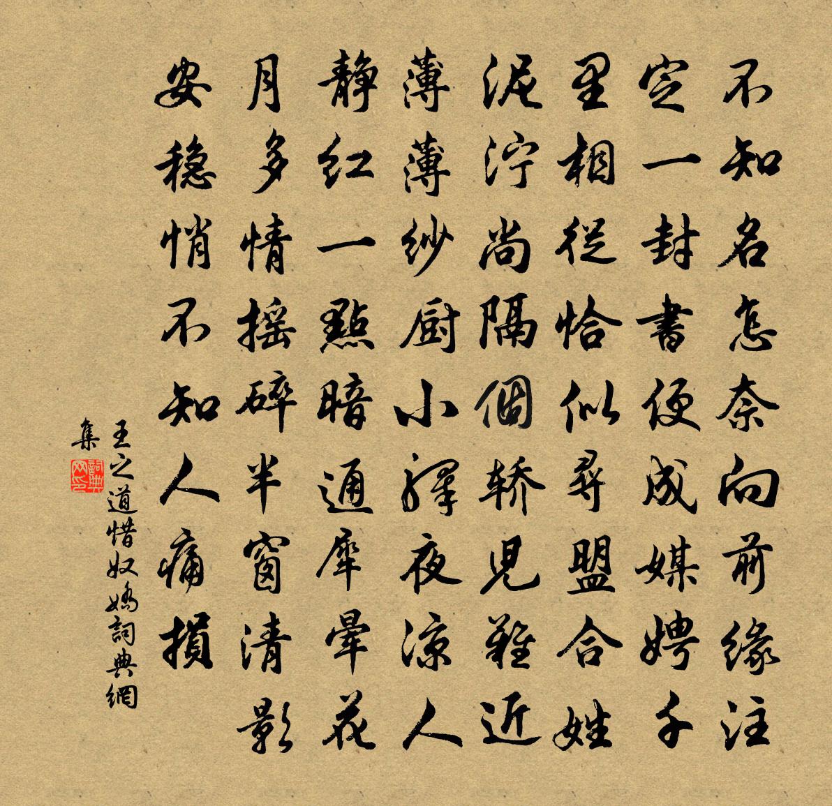 詩詞名句歷史字典書法欣賞書法字典國語詞典說文解字康熙字典古漢語字典標 題 作 者 詩 句 惜奴嬌作者:王之道 朝代:宋代惜奴嬌原文不D8CB知名,怎奈向、前緣注定。一封書、便成媒娉。千里相從,恰似尋盟合姓。泥濘。尚隔個、轎兒難近。薄薄紗廚,小驛夜涼人靜。紅一點、暗通犀暈。花月多情,搖碎半窗清影。安穩。悄不知、人痛損。詩詞問答問:惜奴嬌的作者是誰?答:王之道問:惜奴嬌寫於哪個朝代?答:宋代王之道惜奴嬌書法欣賞惜奴嬌書法作品詩詞推薦減字木蘭花呂勝己〔宋代〕煙雲變化。面面青山如展畫。俯對平川。野水煙村遠接天。有時縱目。景物繁華觀不足。月下風頭。一曲清謳博見玉樓春令康與之〔宋代〕青箋後約無憑據。誤我碧桃花下語。誰將訊息問劉郎,悵望玉溪溪上路。春來無限傷情緒。擬欲題紅都寄與。東風逗春海棠楊公遠〔宋代〕蜀地名花迥出奇,玉環卯未醉時。只開春暖二三月,偶冒冬寒四五枝。曉帶清霜濃傳粉,晚迎紅日淡勻脂。惜渠未傷馮秀才許渾〔唐代〕旅葬不可問,茫茫西隴頭。水雲青草濕,山月白楊愁。琴信有時罷,劍傷無處留。淮南舊煙月,孤棹更逢秋。婺源邑中方回〔宋代〕天地初開孰結融,一溪千折萬山重。縣城似繞流觴水,郡路多由對鏡峰。祠廟駿奔乾竺會,鄉邦鴻碩兗鄒封。版圖君疇仰晦茂功蒙仲和余差須韻二詩再答二首劉克莊〔宋代〕衡與修皆捋虎鬚,不 * 乾與元瑜。譏彈山寺詩為謗,指點滄洲疏似諛。毛垢人將吹洗汝,涅磨渠不磷緇乎。勸君送望聖監南嶽廟孔武仲〔宋代〕還鄉同赴紫宸朝,笑語從容慰寂寥。白髮侵凌今滿鑒,青春羈旅舊連鑣。易江小隱西園在,湘浦新除道路遙。老境都梁北鄉士多好學有向君敏衡者一日訪予語甚牟巘五〔宋代〕廉崖千仞孰能幹,一見令人毛髮寒。可以人而不如石,我當為石共衣冠。讀江西詩呈游光化料院蔡沈〔宋代〕江西多秀士,卓躒相後先。其中最翹楚,無出黃陳前。森然插天干,琢削草舍椽。羌童扣金石,越女調管弦。非無詠項羽於季子〔唐代〕北伐雖全趙,東歸不王秦。空歌拔山力,羞作渡江人。詠史詩濡須橋胡曾〔唐代〕徒向濡須欲受降,英雄才略獨無雙。天心不與金陵便,高步何由得渡江。和鮮于晉伯游臥龍馮時行〔宋代〕四十發已白,百謀無一成。林泉有夙志,芝朮寄晚程。人間好山水,往往盡經行。輒忌墮圭組,所至欲有營。臥龍元日鴻慶宮朝拜二十韻蘇頌〔宋代〕上國房心次,仙都太紫微。璧門開倣雉,金闕立如翬。昔聖躬三祀,乘時動六飛。奠圭渦曲已,鳴蹕渙陽歸。孚號奉使契丹二十八首其九會仙館二絕句之二蘇轍〔宋代〕嶺上西行雙石人,臨溪照水久逡巡。低頭似愧南來使,居處雖高已失身。題畫廿四首唐寅〔明代〕班荊相對語勞勞,麻已漚成繭未繅。又是一番春計了,瓦盆兒女共村醪。覽蜀宮故城作宋祁〔宋代〕國破江山老,人亡岸谷摧。鴛飛今日瓦,鹿聚向時台。故苑猶霏雪,荒池但劫灰。赬遺糊處壤,闔記數殘枚。恨月又和感舊四首劉克莊〔宋代〕老馬虺隤不服驂,累然病起泛溪南。失侯我尚堪耘豆,出牧公方自種酣。畏壘屢豐愧桑楚,漢喜雖小屈岑參。新年挽方德潤寶學三首劉克莊〔宋代〕龔勝乘車晚,陽城伏合初。自雲臣語戇,不是上恩疏。黃壤全名節,青編載諫書。始知年與德,造物有乘除。挽俞景梁洪咨夔〔宋代〕億計橋門士,輸君第一籌。文為天下樣,行與古人謀。磨鐵素心在,注金蒼鬢休。梅邊清絕夢,誰更酒扶頭。徐得之閒軒秦觀〔宋代〕建安自古多俊髦,徐子磊落尤其豪。論兵說劍走湖海,身勤事左無所遭。綠林五校已屠膾,黑衣三衛羞徒勞。歸來名句推薦忽然更作漁陽摻,黃雲蕭條白日暗。李頎《聽安萬善吹觱篥歌》 門有車馬客,駕言發故鄉。陸機《門有車馬客行》 巴山重疊相逢處。燕子占巢花脫樹。張先《漁家傲·和程公辟贈》 惠遠祠前晉溪水,翠葉銀花清見底。元好問《過晉陽故城書事》 雪洗虜塵靜,風約楚雲留張孝祥《水調歌頭·和龐佑父》 積土成山,風雨興焉;積水成淵,蛟龍生焉;荀子《勸學》 清風明月苦相思,盪子從戎十載餘。王維《伊州歌》 吳洲春草蘭杜芳,感物思歸懷故鄉。宋之問《寒食江州滿塘驛》 明月出天山,蒼茫雲海間。李白《關山月》 只向從前悔薄情,憑仗丹青重省識,盈盈,一片傷心畫不成。納蘭性德《南鄉子·為亡婦題照》