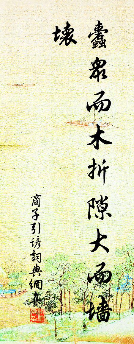 詩詞名句歷史字典書法欣賞書法字典國語詞典說文解字康熙字典古漢語字典標 題 作 者 詩 句 商子引諺作者:佚名 朝代:先秦商子引諺原文蠹眾而木折。隙大而牆壞。詩詞問答問:商子引諺的作者是誰?答:佚名問:商子引諺寫於哪個朝代?答:先秦問:佚名的名句有哪些?答:佚名名句大全佚名商子引諺書法欣賞商子引諺書法作品詩詞推薦雜曲歌辭生別離白居易〔唐代〕食檗不易食梅難,檗能苦兮梅能酸。未如生別之為難,苦在心兮酸在肝。晨雞載鳴殘月沒,征馬重嘶行人出。回看頌古十首釋普岩〔宋代〕洗缽家家事一同,新羅不在海門東。因行掉臂趙州老,身在煙蘿第幾重。題應聖觀儲光羲〔唐代〕空中望小山,山下見餘雪。皎皎河漢女,在茲養真骨。登門駭天書,啟籥問仙訣。池光搖水霧,燈色連松月。合磚瑪瑙院居戲題三首釋智圓〔宋代〕白傅湖西瑪瑙坡,軒窗蕭酒瀁煙波。講餘終日焚香坐,毀譽榮枯奈我何。青玉案 戊戌元元宵客京師賦張野〔元代〕千門夜色霏香霧。又春滿、朝天路。回首舊遊誰與語。金波影里,水晶簾下,總是關心處。征衫著破愁成縷。留滯游郭希呂石洞二十詠傾月劉過〔宋代〕去去山轉深,樹下益淒冷。時有月烏飛,間碎梧桐影。庚子三月二十七日又易守當塗四月十一日發辭岳珂〔宋代〕九重旒冕真知己,幾度弓旌憶款門。素志不為溫飽計,赤心未報聖明恩。鶴汀雲雨暮應卷,牛渚風煙秋欲昏。休向奪錦標 七夕張野〔元代〕涼月橫舟,銀橫浸練,萬里秋容如拭。冉冉鸞驂鶴馭,橋倚高寒,鵲飛空碧。問歡情幾許,早收拾、新愁重織。悵杏花王禹偁〔宋代〕登龍曾入少年場,錫宴瓊林醉御觴。爭戴滿頭紅爛熳,至今猶雜桂枝香。句尉遲匡〔唐代〕明月飛出海,黃河流上天。(《暮行潼關》)芙蓉初出水,桃李忽無言。(《觀內人樓上踏歌》)夜夜月為青冢鏡呈明叔七首趙蕃〔宋代〕手種竹邊梅一株,地幽終覺病而癯。不然我爾要相似,異日重看瘠解腴。句晃逈〔宋代〕可能宴坐即宴坐,待全靜無全靜時。次韻袁升之游雲寺鴻慶院山茶之什蒲瀛〔宋代〕年年花葉炫虛空,歲月循環十二宮。對植霜天無賴碧,特開金地可耿紅。長春此閏何妨別,密雪交加有底同。不必關參議劉仲洪就京制置辟入蜀二首曾豐〔宋代〕江西清絕處,頻賞厭還休。快作坤維去,閒為丙穴游。百牢山倒拔,三峽水橫流。未有人收拾,公其與筆謀。送馮夢授試禮部李新〔宋代〕殷樹蔥籠繡曉暾,馬蹄東去亂冰痕。世收徵詔藏商谷,家有新功刻禹門。太白夜郎初辱顧,馮唐漢殿欲承恩。南山即事樓鑰〔宋代〕行盡窮邊歲亦殫,倚門應是念衣單。寧知今日幕南地,不似去年江上寒。乘馬惟欣日可愛,逢人長說雪初乾。三衾和同年春日韻五首袁說友〔宋代〕傷心客里子規啼,自笑情懷更小兒。短策強隨楊柳去,歸來卻喜燕銜泥。文帝議佐百姓詔劉恆〔兩漢〕間者數年比不登,又有水旱疾疫之災,朕甚憂之。愚而不明,未達其咎。意者朕之政有所失、而行有過與?乃天道秋風三首張耒〔宋代〕秋風蕭蕭吹野桑,田家黍稷初登場。雉肥兔飽鷹隼健,水落沙冷魚龍藏。長淮煙波渺千里,悵望搔首山川長。二年王伯厚以詩招伯渾次韻同往邀之晁公溯〔宋代〕憶昨歸來萬里遙,不能對策未央朝。山林得計成長往,松石為朋是久要。痛飲肯來同榼挈,小詩聊遣當弓招。請君名句推薦我非生而知之者,好古,敏以求之者也。孔子弟子《論語·述而篇》 萬兩黃金容易得,知心一個也難求曹雪芹《紅樓夢·第五十七回》 當年萬里覓封侯。匹馬戍梁州。陸游《訴衷情·當年萬里覓封侯》 涼月如眉掛柳灣,越中山色鏡中看。戴叔倫《蘭溪棹歌》 鼎湖流水清且閒,軒轅去時有弓劍,古人傳道留其間李白《飛龍引二首·其二》 此身合是詩人未?細雨騎驢入劍門。陸游《劍門道中遇微雨》 碧野朱橋當日事,人不見,水空流。秦觀《江城子·西城楊柳弄春柔》 事不三思終有悔,人能百忍自無憂。馮夢龍《醒世恆言·卷三十四》 寄相思,寒雨燈窗,芙蓉舊院。吳文英《宴清都·秋感》 路漫漫其修遠兮,吾將上下而求索。屈原《離騷》