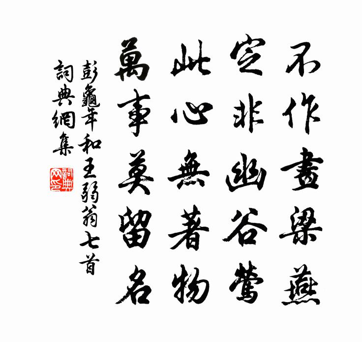 詩詞名句歷史字典書法欣賞書法字典國語詞典說文解字康熙字典古漢語字典標 題 作 者 詩 句 和王弱翁七首作者:彭龜年 朝代:宋代和王弱翁七首原文不作畫梁燕,定非幽谷鶯。此心無著物,萬事莫留名。詩詞問答問:和王弱翁七首的作者是誰?答:彭龜年問:和王弱翁七首寫於哪個朝代?答:宋代彭龜年和王弱翁七首書法欣賞和王弱翁七首書法作品詩詞推薦題仙人洞並謝草堂方公所贈石匣二首葛慶龍〔宋代〕雲長鎮洞有時開,石匣終藏化鶴胎。千歲不須華表柱,飛鳴南向洞山來。客安南見進奉使回口占曾淵子〔宋代〕安南莫道是天涯,歲歲人從薊北回。江北江南親故滿,三年不寄一書來。偈三十五首釋祖珍〔宋代〕自慚疏拙百無能,下板長行粥飯僧。豈謂因緣有僥倖,千斤擔子若為勝。又贈筠仙一幅曾國藩〔清代〕人生有乖隔,咫尺成關山。我心田百轉,從來輸石頑。日吞語戴侯,君在張李間。為君畫新竹,幽淡不容攀。我家赤城病起釋文珦〔宋代〕客里厭厭病過秋,重陽失作雁山游。起來忽見丹楓樹,又是思歸一種愁。次友人韻蘇泂〔宋代〕時事紛紛一笑中,臥看牆外石榴紅。誰憐楚客當年意,與把離騷繼國風。趙忠簡孫璧見過有詩用韻洪咨夔〔宋代〕薄命窘震凌,餘生颯糞朽。閒閒飽款竹,寂寂老鍛柳。溪空漁爭隈,野熟飲被肘。有鄰晨致薤,無客夜剪韭。忽來故人亭皇甫□〔宋代〕倚棹短亭西,吹塵認舊題。水添春岸闊,雲壓暮山低。沙觜鷺初宿,樹頭烏自啼。故人今不見,惟有草萋萋。秦州雜詩二十首·其九杜甫〔唐代〕今日明人眼,臨池好驛亭。叢篁低地碧,高柳半天青。稠疊多幽事,喧呼閱使星。老夫如有此,不異在郊坰。挽范氏孺人二首劉宰〔宋代〕蘭砌秋風早,萊衣晚歲孤。天乎畛劬瘁,季也足歡娛。得算幾中壽,生孫競遠圖。平生尤喜事,落日澹平蕪。聞慎思說豪塘居晁補之〔宋代〕聞在豪塘飲,松林日百回。當年鹿何往,異世鶴歸來。未許茅齋並,終期蠟屐陪。丹留杉不死,夜氣看星魁。句釋延壽〔宋代〕牛胎生象子,碧海起紅塵。故諫議大夫鮮于公欲作新堂以傳世譜名曰卓絕李廌〔宋代〕隱居嗣徽猷,超世得古學。行藏合用舍,聞見守約卓。清風激頹波,精義興後覺。天子不得臣,鴻飛敻何邈。福建士子福建士子〔宋代〕月上小樓西,雞唱霜天曉。淚眼相看話別時,把定纖縴手。伊道不忘人,伊卻都忘了。我若無情似你時,瞞不得、已亥雜詩 176龔自珍〔清代〕俎膾飛沉竹肉喧,侍郎十日敞清尊。東南不可無斯樂,濡筆親題第四園。上趙漕華岳〔宋代〕太山之巔有喬松,凜凜千丈摩蒼空。風雲有會直相際,轟雷制電蟠蛟龍。盤根錯節真天種,卿月郎星伴辰拱。高風題遺直軒余淳禮〔宋代〕二蘇床翰墨仙,床同謫百蠻床里。時有田舍翁,結茅住行李。爾來三十年,聞名輒掩耳。天定能勝入,稍復蒙料理在伯考試未歸有懷趙蕃〔宋代〕木落山空君未歸,我行江山幾依依。山空木落有佳處,政爾待君相發揮。滿江紅劉克莊〔宋代〕糝徑紅裀,莫要放、兒童拋礫。知渠是、仙家變幻,佛家空色。青女無端工翦彩,紫姑有崇曾迷赤。但雙雙、戲蝶同張明府碧溪贈答孟浩然〔唐代〕別業聞新制,同聲和者多。還看碧溪答,不羨綠珠歌。自有陽台女,朝朝拾翠過。舞庭鋪錦繡,妝牖閉藤蘿。秩滿名句推薦三年不上門,當親也不親。吳承恩《西遊記·第四十回》 事非宜,勿輕諾。苟輕諾,進退錯。李毓秀《弟子規·信》 奢侈足以敗家;慳吝亦足以敗家。王永彬《圍爐夜話·第五九則》 過眼年華,動人幽意,相逢幾番春換。王沂孫《法曲獻仙音·聚景亭梅次草窗韻》 欲系青春,少住春還去。朱淑真《蝶戀花·送春》 蓬生麻中,不扶而直;白沙在涅,與之俱黑。荀子《荀子·勸學》 糝徑楊花鋪白氈,點溪荷葉疊青錢。杜甫《絕句漫興九首·其七》 水漲魚天拍柳橋。雲鳩拖雨過江皋。周邦彥《浣溪沙·水漲魚天拍柳橋》 誰憐旅愁荏苒。謾長門夜悄,錦箏彈怨。張炎《解連環·孤雁》 提出西方白帝驚,嗷嗷鬼母秋郊哭。李賀《春坊正字劍子歌》