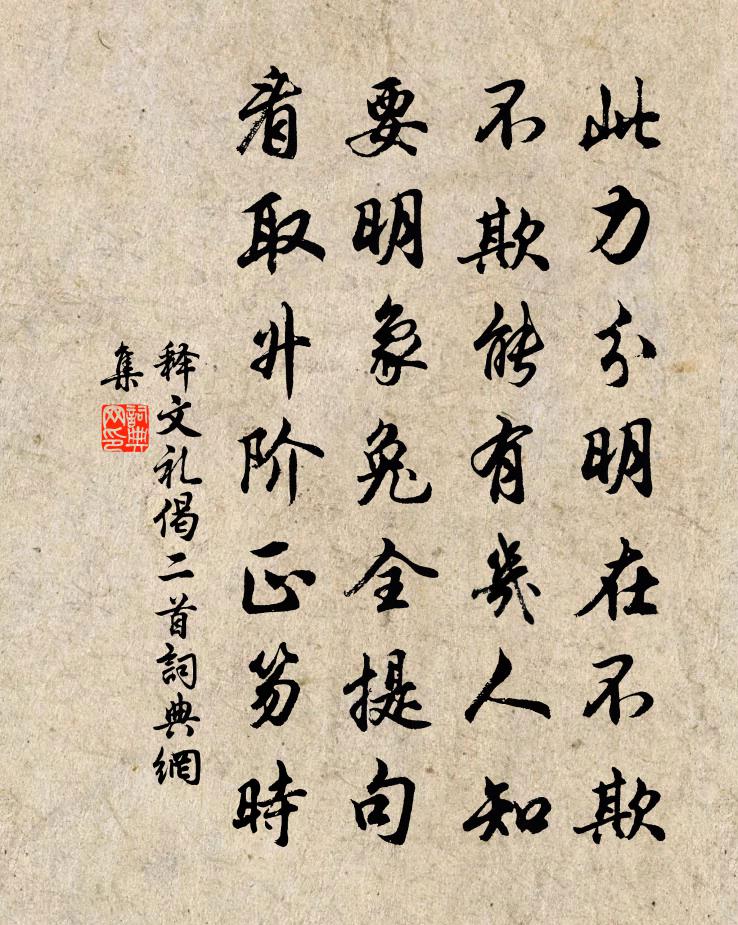 詩詞名句歷史字典書法欣賞書法字典國語詞典說文解字康熙字典古漢語字典標 題 作 者 詩 句 偈二首作者:釋文禮 朝代:宋代偈二首原文此力分明在不欺,不欺能有幾人知。要明象兔全提句,看取升階正笏時。詩詞問答問:偈二首的作者是誰?答:釋文禮問:偈二首寫於哪個朝代?答:宋代釋文禮偈二首書法欣賞偈二首書法作品詩詞推薦自惜身薄祜行曹叡〔魏晉〕出身秦川。爰居伊洛。次韻竹窗兄松詩為其病也陳著〔宋代〕獨立南立嶺,傲視氛翳表。虬枝結成蓋,寄託紛蔓蔦。風霜受變足,萬古為一曉。日日當戶門,蒼翠濃可抱。題慎言法師故房儲光羲〔唐代〕精廬不住子,自有無生鄉。過客知何道,裴回雁子堂。浮雲歸故嶺,落月還西方。日夕虛空里,時時聞異香。偶題張良臣〔宋代〕誰家池館靜蕭蕭,斜倚朱門不敢敲。一段好春藏不盡,粉牆斜露杏花梢。詩癖楊公遠〔宋代〕生來性癖耽佳句,吟得詩成似有神。險語豈惟驚鬼膽,直須字字要驚人。鳳棲梧(會於秋香閣,適令丞有違言,賦此詞勸之)曹冠〔宋代〕昨夜西疇新足雨。玉露金飆,著意鏖殘暑。畫閣登臨凝望處。餘霞晚照明煙浦。閒是閒非知幾許。物換星移,風景南柯子劉志淵〔元代〕體若虛空淨,心如泰華安。萬緣妄想不相干。正住無思,觸處得安閒。覺海神珠瑩,禪天性月寒。圓明不昧顯**雨不成雪方回〔宋代〕一雨疑當冷,旋為暖所勝。南方難得雪,冬半尚無冰。余菊香深釅,群蔬意似矜。林疏石路細,遙見隔溪僧。留衢州王彥博周欽止徐審知趙蕃〔宋代〕漫道詩能陶冶,絕知酒可浮沉。行值田間積淖,住逢溪上愁陰。歲晚陸游〔宋代〕歲晚霜風正怒號,荒村敗屋擁藜蒿。窮猶可勉聖賢事,老豈遽忘鉛槧勞。從宦雖如棋已決,治經竊比繭初繅。閉門次韻答杜友鄧深〔宋代〕小軒名大隱,粗可供趺坐。遮眼時翻書,靜願結香火。似介還似痴,所向與時左。不踐名利途,竊謂志亦果。人生游長安諸寺聯句永安坊永壽寺閒中好段成式〔唐代〕閒中好,盡日松為侶。此趣人不知,輕風度僧語。 ——鄭符閒中好,塵務不縈心。坐對山鄉洪咨夔〔宋代〕石田磽确萬山隈,逢春荒年更可哀。盡日幾人擔米上,長年何處得錢來。扣門強貸刑難逭,閉戶清飢死又催。不是出山項安世〔宋代〕又隨寒日下平林,黃葉山頭紫霧生。六代興亡祗此是,吾儕閒健且長吟。吳仲恭翠微樓九日落成和謝皋羽方鳳〔宋代〕樓成楚菊芳菲候,客湊齊山酩酊期。與俗相追何日了,登高一嘯洗秋悲。望窮碧落鴻飛外,歸戀清樽月到時。野服歸字謠袁去華〔宋代〕歸。目斷吾廬小翠微。斜陽外,白鳥傍山飛。寄天台王鍊師兼呈邑宰張日損〔宋代〕百里淒清古縣城,阮郎陶令自相應。非無柳影含彭澤,別有花光勝武陵。間醉想同莎外石,冷吟知共夜深燈。紅塵十七十八日猶雨方回〔宋代〕浮雲幾萬里,白日悶晴暉。稍覺波濤縮,猶聞點滴微。兩旬捐破扇,五月著寒衣。老病憂時事,高門馬自肥。乞出過傳法聞伯齊歸姚江樓鑰〔宋代〕扶病還朝一禿翁,重來寧免笑何公。夢魂長是尋雲北,歸路何時向浙東。深願聳身隨畫鷁,空勞舉目送飛鴻。主人夜登白帝城樓懷少陵先生陸游〔宋代〕拾遺白髮有誰憐,零落歌詩遍兩川。人立飛樓今已矣,浪翻孤月尚依然。升沉自古無窮事,愚智同歸有限年。此意名句推薦心即理也。天下又有心外之事,心外之理乎王陽明《傳習錄·卷上·徐愛錄》 東風靜、細柳垂金縷。万俟詠《三台·清明應制》 古宮閒地少,水港小橋多。杜荀鶴《送人游吳》 青鳥不傳雲外信,丁香空結雨中愁。李璟《攤破浣溪沙·手卷真珠上玉鉤》 千門開鎖萬燈明,正月中旬動帝京。張祜《正月十五夜燈》 極目離離,遍地濛濛,官橋野塘。陳維崧《沁園春·詠菜花》 三月休聽夜雨,如今不是催花。張炎《清平樂·采芳人杳》 金風飄菊蕊,玉露泫萸枝。韋安石《奉和九日幸臨渭亭登高應制得枝字》 水滿田疇稻葉齊,日光穿樹曉煙低。徐璣《新涼》 文死諫,武死戰。曹雪芹《紅樓夢·第三十六回》