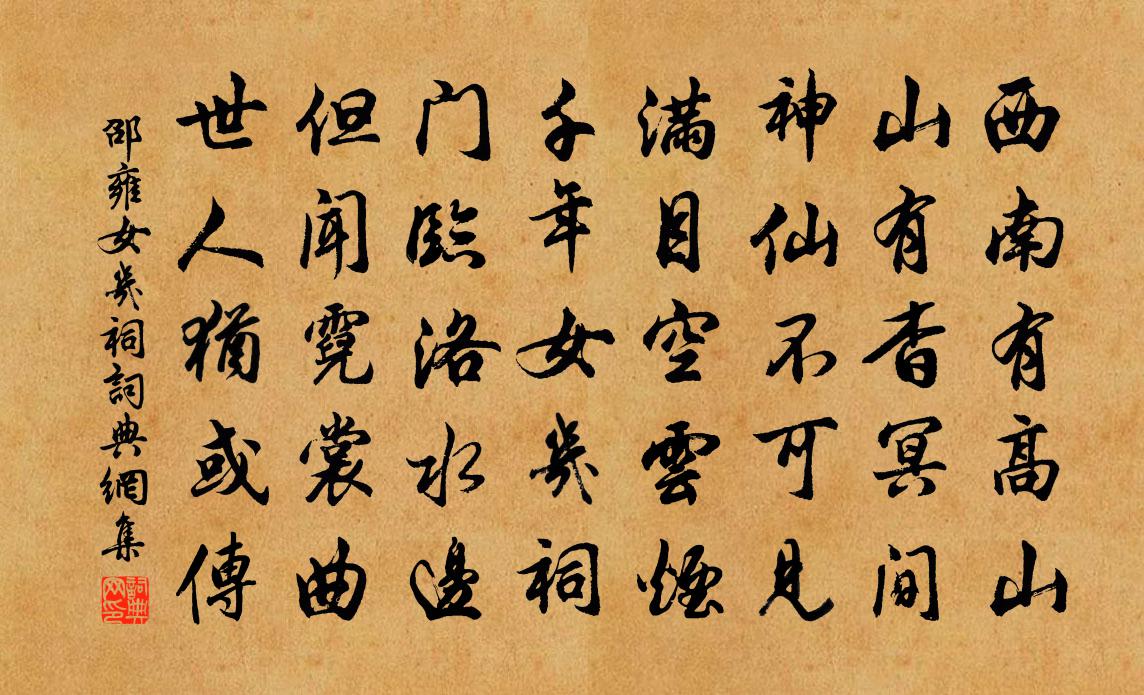 詩詞名句歷史字典書法欣賞書法字典國語詞典說文解字康熙字典古漢語字典標 題 作 者 詩 句 女幾祠作者:邵雍 朝代:宋代女幾祠原文西南有高山,山有杳冥間。神仙不可見,滿目空雲煙。千年女幾祠,門臨洛水邊。但聞霓裳曲,世人猶或傳。詩詞問答問:女幾祠的作者是誰?答:邵雍問:女幾祠寫於哪個朝代?答:宋代邵雍女幾祠書法欣賞女幾祠書法作品詩詞推薦雪詩八首蘇軾〔宋代〕海風吹浪去無邊,倏忽凝為萬頃田。五月涼塵渴入肺,不知價值幾多錢。真際道人請贊釋鹹傑〔宋代〕一句全提,了無向背。臨濟正宗,恣意破碎。彌天過犯,不容懺悔。丹青畫出向人前,他家自有通人愛。感舊詩蘇軾〔宋代〕床頭枕馳道,雙闕夜未央。車轂鳴枕中,客夢安得長。新秋入梧葉,風雨驚洞房。獨行殘月影,悵焉感初涼。筮仕寄題陳肩夔雲錦窗姚勉〔宋代〕八窗面面受新涼,萬蓋盈盈擁靚妝。倩得天孫雲杼軸,織成騷客錦衣裳。雨翻綠淨盤中玉,風攪紅嬌鏡底香。個裡小重山·花院深疑無路通賀鑄〔宋代〕花院深疑無路通。碧紗窗影下,玉芙蓉。當時偏恨五更鐘。分攜處,斜月小簾櫳。楚夢冷沈蹤。一雙金縷枕,半床再上閭丘通牧少卿李廌〔宋代〕東邦濱海帝憂勞,慎迪名卿禮意褒。板簡拜旌前憲掾,雲駢驂馭舊仙曹。庭柯露下回春色,夜浦珠還息海濤。陰惠太廟樂章皇帝還伴乾安之曲周麟之〔宋代〕於穆清廟,明禋是躬。卿士駿奔,助我肅雝。灌鬯已事,精誠交通。卻立以思,僾然其恭。寄隨州周員外韓愈〔唐代〕陸孟丘楊久作塵,同時存者更誰人。金丹別後知傳得,乞取刀圭救病身。貴妃閣春帖子許應龍〔宋代〕月射璇題爛,風傳玉漏清。仰瞻雲漢表,輝潤四星明。雪中作陸游〔宋代〕竹折松僵鳥雀愁,閉門我亦擁貂裘。已忘作賦游梁苑,但憶銜枚入蔡州。屬國餐氈真強項,翰林煮茗自風流。明朝登東山懷朱靜佳張至龍〔宋代〕布石行山磵,雲封竹洞名。照池傳古貌,借箸數同庚。禽斗巢幾覆,蛛閒綱半成。冬深猶見菊,還憶晉淵明。和正仲再和罷飲梅堯臣〔宋代〕吳味期君強飲開,楚醅因我破愁來。何言合美將虛館,卻憶爭妍就捧杯。夜霰已先庭雪集,單衣難與毳裘陪。踐盟立秋日作乾隆〔清代〕已識山中早晚涼,今朝況復立秋當。如何午熱為孤注,疑是金官讓末光。桐葉庭邊想影落,草蟲砌下覺聲楊。農占苦雨張耒〔宋代〕春淺天尚寒,雨多聲入夜。幽人不出門,坐惜梅花謝。庭竹未抽萌,酴醾將覆架。芳時喜病癒,淺酌供情話。趨世送朱喬年被舉薦監石井鎮蘇籀〔宋代〕石井鎮初騰一鶚,管城子健斡千鈞。已然自足雄吾黨,其進只應軼古人。衣被卉裳殊欲慣,解捐犢佩猾商馴。萬鍾川守大夫劉公早歲寓居敦行里肆有題壁十韻…輒獻此詩杜牧〔唐代〕旅館當年葺,公才此日論。林繁輕竹祖,樹暗惜桐孫。煉藥藏金鼎,疏泉陷石盆。散科松有節,深薙草無根。龍臥早睡蘇轍〔宋代〕老人如嬰兒,起晏睡常早。粗氈薄絮被,孤枕自媚好。倒床作龜息,逡巡輒復覺。隔門燈火明,仿佛聞語笑。杯棬和郭公甫王安石〔宋代〕且欲相邀臥看山,扁舟自可送君還。留連城郭今如此,知復何時伴我閒。春日二首朱松〔宋代〕一雷驚收籜龍兒,戢戢滿山人未知。急喚蒼頭斸煙雨,明朝吹作碧參差。金剛隨機無盡頌尊重正教分第十二釋印肅〔宋代〕隨說功尤博,何況精心覺。□□無學人,即是大圓覺。名句推薦寒山幾堵,風低削碎中原路,秋空一碧無今古。陳維崧《醉落魄·詠鷹》 乍暖還輕冷。張先《青門引·春思》 厚祿故人書斷絕,恆飢稚子色淒涼。杜甫《狂夫》 當年不肯嫁春風,無端卻被秋風誤。賀鑄《芳心苦·楊柳回塘》 甘露時雨,不私一物;萬民之主,不阿一人。呂不韋《呂氏春秋·紀·孟春紀》 鳥無聲兮山寂寂,夜正長兮風淅淅。李華《弔古戰場文》 學之乃知,不問不識。王充《論衡·卷二十六·實知篇》 女蘿發馨香,菟絲斷人腸。李白《古意》 花不語,水空流。年年拚得為花愁。晏幾道《鷓鴣天·守得蓮開結伴遊》 遊說萬乘苦不早,著鞭跨馬涉遠道。李白《南陵別兒童入京》