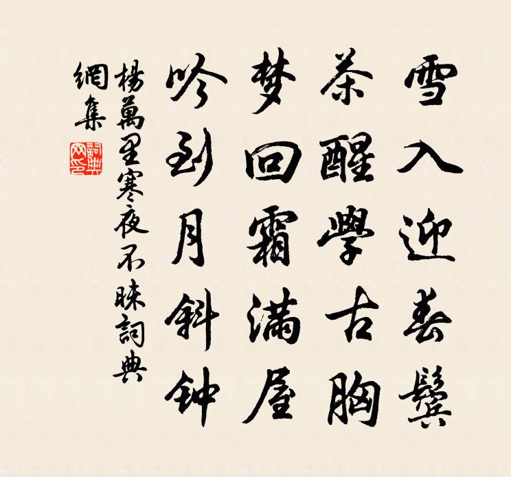 詩詞名句歷史字典書法欣賞書法字典國語詞典說文解字康熙字典古漢語字典標 題 作 者 詩 句 寒夜不昧作者:楊萬里 朝代:宋代寒夜不昧原文雪入迎春鬢,茶醒學古胸。夢回霜滿屋,吟到月斜鍾。詩詞問答問:寒夜不昧的作者是誰?答:楊萬里問:寒夜不昧寫於哪個朝代?答:宋代問:楊萬里的名句有哪些?答:楊萬里名句大全楊萬里寒夜不昧書法欣賞寒夜不昧書法作品詩詞推薦秋日書懷寄河南王尹劉禹錫〔唐代〕公府想無事,西池秋水清。去年為狎客,永日奉高情。況有台上月,如聞雲外笙。不知桑落酒,今歲與誰傾。晝眠陸游〔宋代〕困睫瞢騰老孝先,麤氈布被早霜天。珥貂碧落應無分,且向人間作睡仙。句曹筠〔宋代〕浩浩秦淮千萬頃,好將余浪到灘頭。題陸子泉上祠堂楊萬里〔宋代〕先生吃茶不吃肉,先生飲泉不飲酒。饑寒秪忍七十年,萬歲千秋名不朽。惠泉遂名陸子泉,泉與陸子名俱傳。一辨點絳唇晁補之〔宋代〕檀口星眸,艷如桃李情柔惠。據我心裡。不肯相拋棄。哭怕人猜,笑又無滋味。忡忡地。系人心裡。一句臨歧誓。山居雜詩九十首曹勛〔宋代〕真隱古招提,長林如磔蝟。雖有群山峰,所欠一支水。草木乏秀潤,岩竇燥肌理。安能借僧錫,卓處泉涌沸。南鄉子周邦彥〔宋代〕寒夜夢初醒。行盡江南萬里程。早是愁來無會處,時聽。敗葉相傳細雨聲。書信也無憑。萬事由他別後情。誰信歸次韻王少清告歸七首項安世〔宋代〕江陵雖未慣,已作一年留。料得到錦里,剩須談橘洲。楓櫧夾堤岸,荷芰匝城溝。南入湖潮櫓,北通襄漢舟。逢人滕王閣吳芾〔宋代〕盡道滕王閣太卑,合新舊觀復雄規。我來興葺非難事,卻恐俱為識者嗤。和李致政花石山詩魏了翁〔宋代〕春風挽征衣,淑景薦蓮實。山中之奇觀,變態紛襞積。或劃然以舒,或蒙然以密。或嫵如修眉,或突如巨跡。或鷙送公期得假歸絳歐陽修〔宋代〕風吹積雨銷太行,水暖河橋楊柳芳。少年初仕即京國,故里幾歸成鬢霜。山行馬瘦春泥滑,野飯天寒餳粥香。留連東歸留別幕中同舍孫應時〔宋代〕參謀蜀耆英,棠陰滿三郡。開懷接兒輩,色不見喜慍。清朝貴老成,故家多黃訓。佳氣引春帆,長安天日近。浣溪沙·春情蘇軾〔宋代〕道字嬌訛語未成。未應春閣夢多情。朝來何事綠鬟傾。 彩索身輕長趁燕,紅窗睡重不聞鶯。困人天氣近清明。送宋朝散知彭州迎侍二親蘇軾〔宋代〕東來誰迎使君車,知是丈人屋上烏。丈人今年二毛初,登樓上馬不用扶。使君負弩為前驅,蜀人不復談相如。老幼七步詩曹植〔魏晉〕煮豆持作羹。漉豉以為汁。萁在釜下然。豆在釜中泣。本自同根生。相煎何太急。題五曲溪傅壅〔宋代〕五曲溪流深復深,數椽茅屋舊書林。市朝山澤皆堪隱,誰識先生出處心。題故李秀才居(一作傷李秀才)許渾〔唐代〕曾醉笙歌日正遲,醉中相送易前期。橘花滿地人亡後,菰葉連天雁過時。琴倚舊窗塵漠漠,劍埋新冢草離離。河橋賢者之孝二百四十首王延林同〔宋代〕酷矣杖流備,奇哉魚躍冰。能令母心司,不異已親生。寄徐雪江溫日觀老友顧逢〔宋代〕詩畫琴三絕,乾坤只一身。生前長聚首,死後更無人。材大身猶壽,名高分合貧。自憐傳五字,造物亦相嗔。嵩山老人告行作六偈送之釋正覺〔宋代〕未能老養臥林麓,要乞優恩除發須。濯足滄浪歲寒事,終來清友石菖蒲。名句推薦雁足無書古塞幽。一程菸草一程愁。史達祖《鷓鴣天·衛縣道中有懷其人》 見碧水丹山,黃蘆苦竹。宋江《滿江紅·喜遇重陽》 若待上林花似錦,出門俱是看花人。楊巨源《城東早春》 秋靜見旄頭,沙遠席羈愁李賀《塞下曲》 凍雲宵遍嶺,素雪曉凝華。李世民《望雪》 雞鳴紫陌曙光寒,鶯囀皇州春色闌。岑參《奉和中書舍人賈至早朝大明宮》 孤花片葉,斷送清秋節。納蘭性德《清平樂·孤花片葉》 審知四度,可以定天下,可安一國。佚名《黃帝四經·經法·四度》 芙蓉如面柳如眉,對此如何不淚垂。白居易《長恨歌》 自別西風憔悴甚,凍雲流水平橋。陳維崧《臨江仙·寒柳》