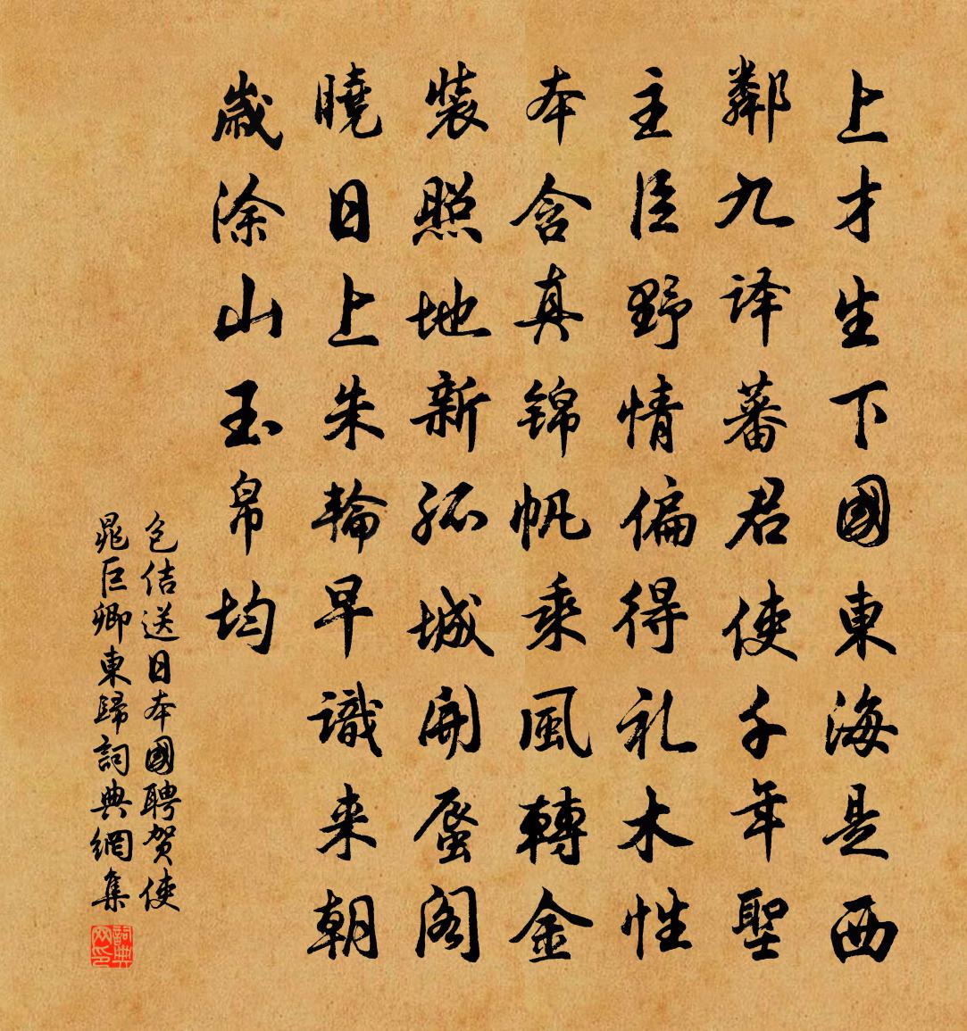 詩詞名句歷史字典書法欣賞書法字典國語詞典說文解字康熙字典古漢語字典標 題 作 者 詩 句 送日本國聘賀使晁巨卿東歸作者:包佶 朝代:唐代送日本國聘賀使晁巨卿東歸原文上才生下國,東海是西鄰。九譯蕃君使,千年聖主臣。野情偏得禮,木性本含真。錦帆乘風轉,金裝照地新。孤城開蜃閣,曉日上朱輪。早識來朝歲,塗山玉帛均。詩詞問答問:送日本國聘賀使晁巨卿東歸的作者是誰?答:包佶問:送日本國聘賀使晁巨卿東歸寫於哪個朝代?答:唐代包佶送日本國聘賀使晁巨卿東歸書法欣賞送日本國聘賀使晁巨卿東歸書法作品詩詞推薦魏漕彥成昔宰弋陽政績上聞召對改秩予適當詞胡寅〔宋代〕滁萊千頃變嘉禾,兩歲之中績效多。賞格雖懸初不用,柄臣何事有偏頗。少年游(西湖)周端臣〔宋代〕四山煙靄未分明。宿雨破新晴。萬頃湖光,一堤柳色,人在畫圖行。清明過了春無幾,花事已飄零。莫待斜陽,便遇旅鶴孫昌胤〔唐代〕靈鶴產絕境,昂昂無與儔。群飛滄海曙,一叫雲山秋。野性方自得,人寰何所求。時因戲祥風,偶爾來中州。中州和邵不疑校理蒲州十詩芙蕖軒司馬光〔宋代〕荷花爛熳紅,不見方塘水。岧嶢結飛閣,苒惹清香里。露重忽欹側,翩然翠禽起。晉元帝廟黎廷瑞〔宋代〕不知牛繼馬,卻道馬為龍。得士能成帝,生兒不亢宗。荒祠煙樹晚,殘碣雨苔封。往事憑誰問,春城起暮鍾。登殊亭作元結〔唐代〕時節方大暑,試來登殊亭。憑軒未及息,忽若秋氣生。主人既多閒,有酒共我傾。坐中不相異,豈恨醉與醒。漫歌題浯溪白玉蟾〔宋代〕芙蓉睡足西風冷,漁陽捲入來無影。不思夜火笑驪山,甘欲庭花唱宮井。馬嵬山下杜鵑聲,羅襪空淒花草馨。誰謂劉荊山過惟揚再謁賈秋壑薛嵎〔宋代〕扉屨踐淮雪,故人師帥歡。燈前話疇昔,時事又艱難。陪宴平山曉,尋梅古署寒,卻歸訪泉石,珍重慰團欒。留飲筱塢承隱君山莊仇遠〔宋代〕夾山崢嶸相對起,貫以盈盈衣帶水。白雲深塢碧筱合,華屋盤紆蒼樹里。二三隱者古衣冠,魚酒招邀極歡喜。維舟道中方岳〔宋代〕山寒苦厭連宵雨,溪滑頓添兼尺水。輿行兩驛費十程,篷臥一篙余百里。世事乘除類如此,人生俯仰知何似。紫螯次韻方蒙仲高人亭方岳〔宋代〕苔寒兩不借,對面寧爾勞。欲語二三子,卑之毋甚高。辨畢方鄭剛中〔宋代〕比屋皆良民,為盜豈無以。富足義所生,貧窮盜之始。凍餓家無儲,追呼官不已。妖幻隨鼓之,安得不群起。縱火依韻寄呈林城山蒲壽宬〔宋代〕鄰蛩深夜語幽幽,猶此塵埃一敝裘。甘菊已荒歸栗里,蒲萄堪醉勝涼州。知心海上千年鶴,極目雲間五色樓。白髮浮湘行范成大〔宋代〕湘山中間湘水橫,綠苹葉齊春漲生,盤渦沄沄去無聲。吾乘桂舟泝中濡,揚波擊汰雙櫓獰,轆轤引笮如牛鳴。篙師山泉為惠君疇賦仇遠〔宋代〕空青穿秋旻,瘦白噴夏雪。若非林下士,誰識此高潔。山中非無雲,蒼狗隨變滅。山中非無月,陰晴易圓缺。不如猗蘭秋思三首方回〔宋代〕猗蘭奕葉曉疏晴,栩栩秋光小蝶輕。皂翅繡花三五點,庾郎無句畫難成。詩一首徐氏〔唐代〕絮如柳陌三春雨,花落梨園一笛風。百尺玉樓簾半卷,夜深人在水晶宮。酹江月 過淮陰薩都剌〔元代〕短衣酒瘦馬,望酒楚天空闊酒,碧雲林酒杪。野水孤城斜日裡,猶憶那回曾到。古木鴉啼,紙灰風起,飛入淮陰廟和虞使君賦山茶花二首程公許〔宋代〕眼明絕 * 凋年,傲雪凌霜分外妍。鶴頂染砂那得似,犀棱削角自蒼然。若為白瑞三科里,獨抱丹心一節堅。歲晚寄家人晁補之〔宋代〕孟光家世自清芬,鴻亦幽情慕隴雲。汲水輓車歸去好,茯苓日日長松根。名句推薦梅花雪,梨花月,總相思。張惠言《相見歡·年年負卻花期》 兒孫自有兒孫福,莫為兒孫做馬牛。佚名《增廣賢文·上集》 鄉村四月閒人少,才了蠶桑又插田。翁卷《鄉村四月》 東風惡,歡情薄。陸游《釵頭鳳·紅酥手》 婦姑相喚浴蠶去,閒看中庭梔子花。王建《雨過山村》 我見君來,頓覺吾廬,溪山美哉。辛棄疾《沁園春·和吳尉子似》 邊月隨弓影,胡霜拂劍花。李白《塞下曲六首》 勿貪意外之財,勿飲過量之酒。朱柏廬《朱子家訓·全文》 今春看又過,何日是歸年。杜甫《絕句二首》 天長地久有時盡,此恨綿綿無絕期。白居易《長恨歌》