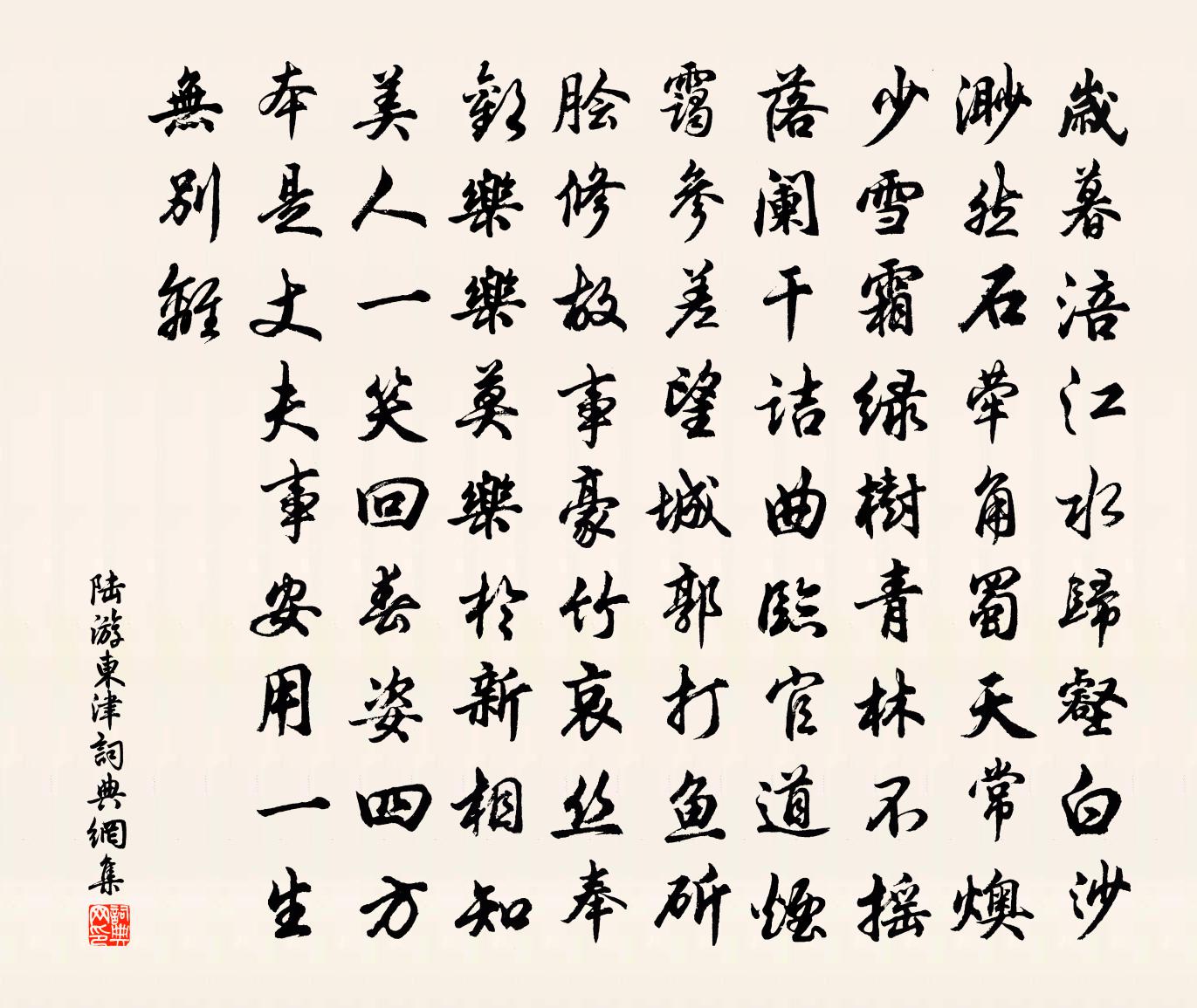 詩詞名句歷史字典書法欣賞書法字典國語詞典說文解字康熙字典古漢語字典標 題 作 者 詩 句 東津作者:陸游 朝代:宋代東津原文歲暮涪江水歸壑,白沙渺然石犖角。蜀天常燠少雪霜,綠樹青林不搖落。闌乾詰曲臨官道,煙靄參差望城郭。打魚斫膾修故事,豪竹哀絲奉歡樂。樂莫樂於新相知,美人一笑回春姿。四方本是丈夫事,安用一生無別離。詩詞問答問:東津的作者是誰?答:陸游問:東津寫於哪個朝代?答:宋代問:陸游的名句有哪些?答:陸游名句大全陸游東津書法欣賞東津書法作品詩詞推薦中書宿齋有寄權德輿〔唐代〕銅壺漏滴斗闌乾,泛灩金波照露盤。遙想洞房眠正熟,不堪深夜鳳池寒。鴛鴦語(同前)賀鑄〔宋代〕京江抵、海邊吳楚。鐵瓮城、形勝無今古。北固陵高,西津橫渡。幾人摧手分襟處。淒涼淥水橋南路。奈玉壺、難次韻李公擇九日見約以疾不赴蘇轍〔宋代〕它年逢九日,杯酒逐英豪。漸老經秋病,獨醒何處高。床頭添藥里,坐上減牛毛。寂寞知誰問,煩公置濁醪。送鞠十少府李白〔唐代〕試發清秋興,因為吳會吟。碧雲斂海色,流水折江心。我有延陵劍,君無陸賈金。艱難此為別,惆悵一何深。入壬辰新歲宋祁〔宋代〕五十為衰始,仍餘五歲衰。雙眸不明鑑,殘鬢已紛絲。銅虎雖頻剖,荷囊信濫持。何須依老格,先作故山期。□□長老住寧國光孝寺並題雪磯三絕劉克莊〔宋代〕去春蒙尹召,曾一泛湖光。和靖應相笑,君房有許忙。次韻送劉左史去國項安世〔宋代〕手把東溪處士書,欹眠湖上小僧廬。生僧人作侍臣看,自喜身今客子如。去國祗堪千古重,看囊那得一錢餘。二年句王遇〔宋代〕不知何處雨,已覺此間涼。頌古一百則釋正覺〔宋代〕絲綸降,號令分,寰中天子,塞外將軍。不待雷驚出蟄,那知風遏行雲。機底聯綿兮,自有金針玉線。印前恢廊兮太陽嶺強至〔宋代〕高侵寥廓勢盤紆,倦足登時每一吁。方寸人心猶有險,況教廣地盡平塗。復吳秘正五詩陳造〔宋代〕我如不材材,自誑無用用。向來風月前,詩筆頗吟弄。低摧發皓白,無與世輕重。枯株欲丹黃,因君彌自訟。延福宮雙頭牡丹夏竦〔宋代〕禁蓹陽和異,華叢造化殊。兩宮方共治,雙花故聯跗。向日檀心並,承煙翠乾孤。游蜂須並翼,凝露亦駢珠。曉檻定風波(一·瓮城)仲殊〔宋代〕南徐好,鼓角亂雲中。金地浮山星雨點,鐵城橫鎖瓮三重。開國舊夸雄。春過後,佳氣盪晴空。淥水畫橋沽酒市,賢者之孝二百四十首顏真卿林同〔宋代〕只是見忠節,何曾省孝誠。唐宗休嘆息,猶未識真卿。浣溪沙(雨中荷花)沈瀛〔宋代〕雨點真珠水上鳴。更將青蓋一時傾。總是江妃來墜珥,訪娉婷。不為含愁啼粉淚,只因貪愛濕行雲。惟有游魚偏得臨江仙韓玉〔宋代〕月是銀釭溪是鏡,雲霓與作衣裳。夜寒獨立竹籬傍。妝成那待粉,笑罷自生香。自古佳人多薄命,枉教傲雪凌霜。催發諸邑民兵至朝邑縣官未至遂宿其驛李復〔宋代〕羸馬趨程晚,衝風雪滿衣。城荒更鼓暗,市冷吏民稀。烏壘兵初起,河橋客未歸。北行殊未已,拜檄寸心違。送徐守寺正二首劉克莊〔宋代〕楳埜先生子象賢,向來心印得單傳。諺雲蠟燭真明矣,罰止蒲鞭亦肅然。執贄客多樽有酒,詬租吏少篋無錢。璽書苦旱六首陳造〔宋代〕我雖甓社居,有田不瀕湖。漫漫湖水長,奈此田中佑。攜文客邊侯,劣可輸殘租。黧瘁不識飽,愧爾耕田夫。中秋望月呈諸友胡仲弓〔宋代〕長空萬里琉璃滑,冰輪碾上黃金闕,清光爍盡滿天星,桂枝搖落蟾蜍活。故雷鋒此盡翹首,望殺 * 眼瀝血。烏鵲名句推薦圓荷浮小葉,細麥落輕花。杜甫《為農》 離心何以贈,自有玉壺冰。駱賓王《送別》 浮雲一別後,流水十年間。韋應物《淮上喜會梁川故人 / 淮上喜會梁州故人》 年年越溪女,相憶采芙蓉。杜荀鶴《 * 怨》 抽刀斷水水更流,舉杯銷愁愁更愁。李白《宣州謝朓樓餞別校書叔雲 / 陪侍御叔華登樓歌》 別離在今晨,見爾當何秋。韋應物《送楊氏女》 鳳凰台上鳳凰游,鳳去台空江自流。李白《登金陵鳳凰台》 無花無酒過清明,興味蕭然似野僧。王禹偁《清明》 知屋漏者在宇下,知政失者在草野。王充《論衡·卷二十八·書解篇》 已恨碧山相阻隔,碧山還被暮雲遮。李覯《鄉思》