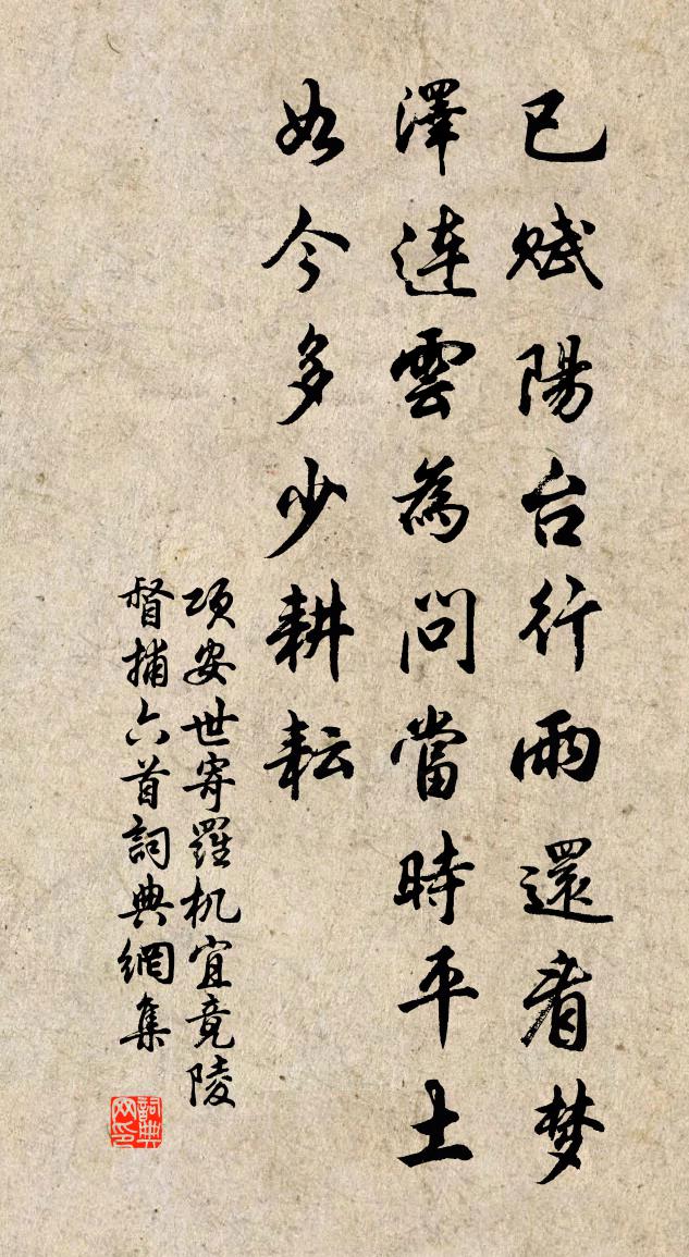 詩詞名句歷史字典書法欣賞書法字典國語詞典說文解字康熙字典古漢語字典標 題 作 者 詩 句 寄羅機宜竟陵督捕六首作者:項安世 朝代:宋代寄羅機宜竟陵督捕六首原文已賦陽台行雨,還看夢澤連雲。為問當時平土,如今多少耕耘。詩詞問答問:寄羅機宜竟陵督捕六首的作者是誰?答:項安世問:寄羅機宜竟陵督捕六首寫於哪個朝代?答:宋代項安世寄羅機宜竟陵督捕六首書法欣賞寄羅機宜竟陵督捕六首書法作品詩詞推薦題吳子隆兼隱二首陳造〔宋代〕元亮官居亦松菊,次山生事有笭箵。酒如欸乃聲中醉,目向平反笑處長。朝中措(和張文伯清明日開霽)王之道〔宋代〕朝陽淡淡宿雲輕。風入管弦聲。十里碧蕪幽步,一枝丹杏柔情。佳人何處,酒紅沁眼,秋水盈盈。詩曲羨君三絕,迷神引·貶玉溪對江山作晁補之〔宋代〕黯黯青山紅日暮,浩浩大江東注。餘霞散綺,向煙波路。使人愁,長安遠,在何處。幾點漁燈小,迷近塢。一片客次韻朱萬卿五首陳造〔宋代〕平時歌酒伴,雲散與風流。白髮潘懷縣,青衫許散愁。生憐自謀拙,人謂不堪憂。只擬江湖去,狂吟和棹謳。終南東谿中作岑參〔唐代〕谿水碧於草,潺潺花底流。沙平堪濯足,石淺不勝舟。洗藥朝與暮,釣魚春復秋。興來從所適,還欲向滄洲。水調歌頭(七夕)姚述堯〔宋代〕三五半圓夜,二七素秋天。銀河耿耿,中渡絳節會星軿。寶鵲喜傳佳信,丹鳳歡迎仙仗,瑞彩映珠躔。此意天長久贈楊樵隱應炎談命文天祥〔宋代〕莘郊一介,堯舜君民。薇山二難,百世忠清。富春耕叟,涕洟雲台。終南遁士,仕宦梯媒。是數公者,俱以隱名。示郡南二孫李石〔宋代〕虞初秘府六百本,老子柱下五千言。吾家道學天生種,端有斯文示子孫。還過郢城項安世〔宋代〕頭白初行郢水邊,故城千載尚依然。豈無戌卒持鉦鼓,應有居人沸管弦。今日桑麻成沃野,幾家茅竹散平川。停車初夏野興陸游〔宋代〕披衣清曉倚闌乾,龜屋裁成二寸冠。盆檜雨余抽嫩綠,研池風過起微瀾。愛書自笑心常在,去死懸知日尚寬。回視秋夜感遇十首以孤村一犬吠殘月幾人行為韻陸游〔宋代〕今日天氣佳,駕言適山村。種枳作短籬,疊石成高垣。牲酒賽秋社,簫鼓迎新婚。所願在仕者,努力蘇元元。句劉承弼〔宋代〕境靜人亦寂,觴至壺自傾。夜坐困甚周必大〔宋代〕馬通新熟夜爐深,拄膝承頦夢欲成。不記坐來湯沸鼎,卻疑蓬底聽灘聲。十八日潮陳師道〔宋代〕一年壯觀盡今朝,水伯何知故晚潮。海浪肯隨山俯仰,風帆長共客飄搖。懷伊川郊居李德裕〔唐代〕衰疾常懷土,郊園欲掩扉。雖知明目地,不及有身歸。鞏樹秋陰遍,伊原霽色微。此生看白首,良願已應違。跋徐蜚英四世祖神童事方回〔宋代〕□□□□□□□,□□□□□□□。□□□□□□□,□軍不復過前村。游城南雙塔寺韓維〔宋代〕軻峨郭南門,台殿壓長路。青林四回合,飛鳥不得度。房掩僧獨禪,庭喧鴉正哺。高蘿走蒼柏,丹花下垂布。中園詠史下陸機陳普〔宋代〕千里蓴羹七里戶,兩般滋味豈難知。建春不幸成繻葛,割盡流蘇定此時。木犀答二吳書王遂〔宋代〕過盡人間百草芳,尚留寒菊對風光。月華已下中天白,香樹初搖滿院涼。金粟遠看千盡影,犀皮近種百年香。聖朝再用韻三首裘萬頃〔宋代〕厭趨朝市元無夢,慣處山林似有情。圓覺楞嚴俱不解,維摩會下一書生。名句推薦雨余溪水掠堤平,閒看村童謝晚晴。陸游《觀村童戲溪上》 一苦一樂相磨練,練極而成福者,其福始久洪應明《菜根譚·概論》 人生易老天難老,歲歲重陽。 * 《採桑子·重陽》 相思已是不曾閒,又那得、工夫咒你。蜀妓《鵲橋仙·說盟說誓》 殘月臉邊明,別淚臨清曉牛希濟《生查子·春山煙欲收》 想邊鴻孤唳,砌蛩私語。王沂孫《掃花游·秋聲》 菩提本無樹,明鏡亦非台。惠能《菩提偈》 一一書來報故人,我欲因之壯心魄。李白《赤壁歌送別》 燕山雪花大如席,片片吹落軒轅台。李白《北風行》 驚風飄白日,忽然歸西山曹植《贈徐幹詩》