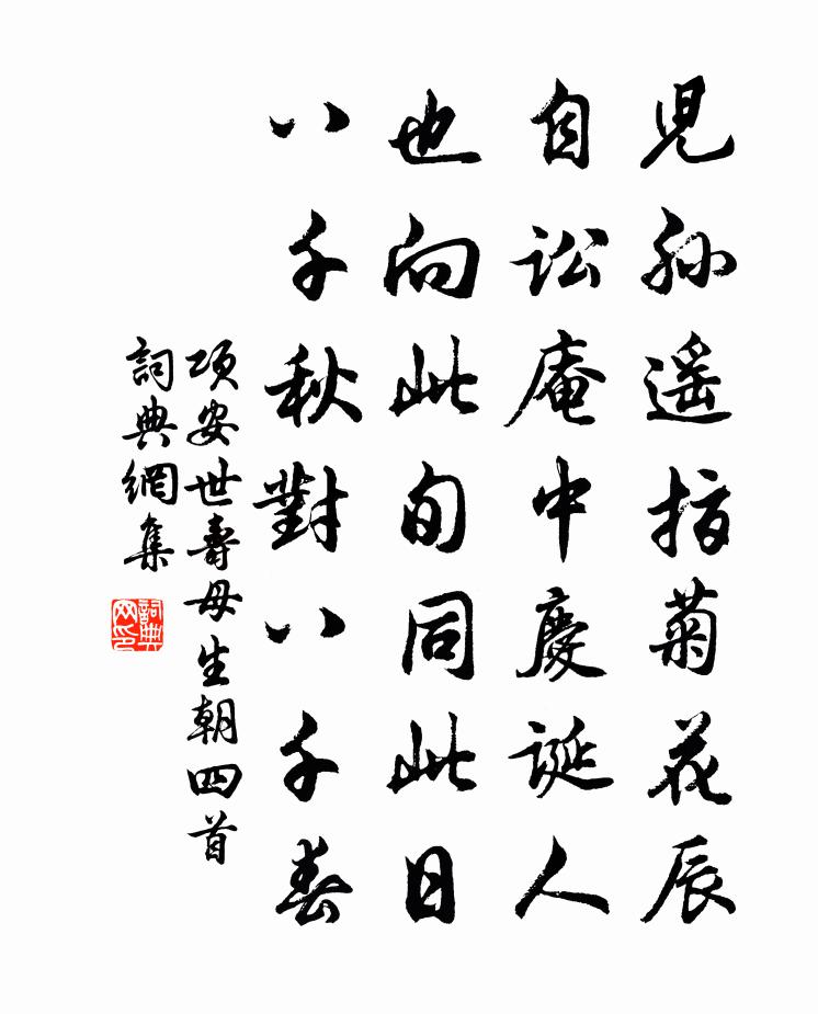 詩詞名句歷史字典書法欣賞書法字典國語詞典說文解字康熙字典古漢語字典標 題 作 者 詩 句 壽母生朝四首作者:項安世 朝代:宋代壽母生朝四首原文兒孫遙指菊花辰,自訟庵中慶誕人。也向此旬同此日,八千秋對八千春。詩詞問答問:壽母生朝四首的作者是誰?答:項安世問:壽母生朝四首寫於哪個朝代?答:宋代項安世壽母生朝四首書法欣賞壽母生朝四首書法作品詩詞推薦酬處才上人王禹偁〔宋代〕我聞三代淳且質,華華人熙熙信佛。茹蔬剃髮在西戎,胡法不敢幹華風。周家子孫何不肖,奢淫惛亂隳王道。秦皇贈孫何丁謂王禹偁〔宋代〕三百年來文不振,直從韓柳到孫丁。如今便可令修史,二子文章似六經。雙黃鵠歌送別(時為節度判官,在涼州作)王維〔唐代〕天路來兮雙黃鵠,雲上飛兮水上宿,撫翼和鳴整羽族。不得已,忽分飛,家在玉京朝紫微,主人臨水送將歸。悲笳用四明劉聘郡古風四韻賦唐律曹彥約〔宋代〕錯落珠璣滿袖傾,百年初見愧生平。人從伊傅平頭數,句似陰何徹骨清。惠我善鄰天有意,惜君橫道世無情。曲終清平樂周紫芝〔宋代〕蘆洲晚淨。雨罷江如鏡。屬玉雙飛棲不定。數點晚來煙艇。夢回滿眼淒涼。一成無奈思量。舟在綠楊堤下,蟬嘶欲奉和聖制夏日游石淙山武三思〔唐代〕此地岩壑數千重,吾君駕鶴□乘龍。掩映葉光含翡翠,參差石影帶芙蓉。白日將移沖疊巘,玄雲欲度礙高峰。對酒憶王孫譚處端〔元代〕塵寰財色苦相縈。著愛浮華役此身。好悟靈源一點真。絕貪嗔。便是下直出溪邊望答虞丹徒敬詩何遜〔南北朝〕夫君美章句。席丈珍梁楚。伊余忝攝官。含毫亦禁阻。直廬去咫尺。心期得宴語。休沐乃幽棲。別離未幾許。佇立和張文紀詠雪二首王之道〔宋代〕朝來經閣課楞嚴,撩亂飛花競撲簾。似是青腰夸黑帝,故教姑射混無鹽。地爐無奈貂裘薄,斗酒難供座客添。詩債滿江紅(劉左史光祖生日正月十日)魏了翁〔宋代〕見說新來,把閒事、都齊閣束。日用處、渾無凝滯,天機純熟。簾卷春風琴靜好,庭移曉日蘭芬馥。笑可曾,些子滿江紅·憂喜相尋蘇軾〔宋代〕董毅夫名鉞,自梓漕得罪,罷官東川,歸鄱陽,過東坡於齊安。怪其豐暇自得,余問之。曰:“吾再娶柳氏,三日贈燕陸游〔宋代〕燕來我何喜,感此中春時;燕去亦何有,無奈凋年悲。四序如循環,萬物更盛衰我亦寓斯世,如客會當歸;驪車已有懷山行釋寶曇〔宋代〕慣識春山筍蕨甜,只今病枕亦饞涎。杖藜夢入僧窗去,飯飽茶香最可憐。送高湘及第後東歸覲叔劉得仁〔唐代〕此去幾般榮,登科鼎足名。無慚入南巷,高價聳東京。窗對嵩山碧,庭來洛水聲。門前桃李樹,一徑已陰成。西園風雨雜花謝張耒〔宋代〕楚澤春殘雨又風,啼鶯芳草思無窮。蕪菁滿地黃金爛,不及薔薇一點紅。又贈一絕楊億〔宋代〕瑤水霓旌綺宴陳,漢宮渠怨露華新。誰然百炬金花燭,渡襪歌梁暗落塵。別程公辟給事秦觀〔宋代〕人物風流推鎮東,夕郎持節作元戎。樽前倦客劉師命,月下清砍盛小叢。裘弊黑貂霜正急,書傳黃犬歲將窮。買舟新昌道中林表民〔宋代〕殘村時有兩三家,繚繞清脂路更賒。客里不知春去盡,滿山風雨落桐花。同比部楊員外十五夜遊有懷靜者季王維〔唐代〕承明少休沐,建禮省文書。夜漏行人息,歸鞍落日餘。懸知三五夕,萬戶千門辟。夜出曙翻歸,傾城滿南陌。陌頭雉丁謂〔宋代〕雉操揚琴奏,名翬拂扇塵。其文伊洛地,厥貢越裳人。幾為郎官集,還因今邑馴。山樑時飲啄,媒翳莫朝親。名句推薦寒更承夜永,涼夕向秋澄。駱賓王《送別》 王母歡闌瓊宴罷,仙人淚滿金盤側。文天祥《滿江紅·代王夫人作》 將順其美,匡救其惡,故上下能噲親也司馬遷《史記·管晏列傳》 人生如寄,何事辛苦怨斜暉。朱熹《水調歌頭·隱括杜牧之齊山詩》 為淵驅魚者,獺也;為叢驅爵者,鸇也孟子《孟子·離婁章句上·第九節》 黃鶯百舌正相呼,玉樹後庭花帶雨。牛殳《琵琶行》 半床落月蛩聲病,萬里寒雲雁陣遲。曹雪芹《殘菊》 事以密成,語以泄敗。韓非及後人《韓非子·說難》 斑騅只系垂楊岸,何處西南任好風。李商隱《無題·鳳尾香羅薄幾重》 生當復來歸,死當長相思。蘇武《留別妻》