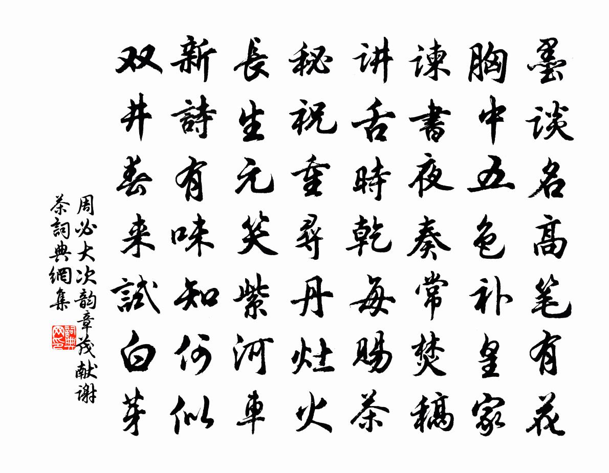 詩詞名句歷史字典書法欣賞書法字典國語詞典說文解字康熙字典古漢語字典標 題 作 者 詩 句 次韻章茂獻謝茶作者:周必大 朝代:宋代次韻章茂獻謝茶原文墨談名高筆有花,胸中五色補皇家。諫書夜奏常焚稿,講舌時乾每賜茶。秘祝重尋丹灶火,長生元笑紫河車。新詩有味知何似,雙井春來試白芽。詩詞問答問:次韻章茂獻謝茶的作者是誰?答:周必大問:次韻章茂獻謝茶寫於哪個朝代?答:宋代周必大次韻章茂獻謝茶書法欣賞次韻章茂獻謝茶書法作品詩詞推薦贈江南從事張侍郎陳陶〔唐代〕平南門館鳳凰毛,二十華軒立最高。幾處談天致雲雨,早時文海得鯨鰲。姻聯紫府蕭窗貴,職稱青錢繡服豪。江徼臨安謠臨安人〔宋代〕滿頭青,都是假。這回來,不作耍。過秀寄麋秘書項安世〔宋代〕圓嶠仙人厭久如,戲求何穎作周書。半生聞誼親無路,一日同僚分有餘。西子湖邊春載酒,征官亭上夜分裾。秋來禪師貫休〔唐代〕擊鼓求亡益是非,木中生火更何為。吾師別是醍醐味,不是知心人不知。菩薩蠻(重陽)毛滂〔宋代〕淡煙疏雨東籬曉。菊團淒露真珠小。青蕊抱寒枝。因誰特故遲。曾是騷人盼。羞做茱萸伴。揉破鬱金黃。與君些子上李太傅鄭獬〔宋代〕陳人嘗傳李太傅,雲作太守來此州。頃遭暴水拉堤出,設施畫略排橫流。大偷嘗欲穴堤腹,掩之即日斷其頭。至於寄題趙高士委順山房方回〔宋代〕紅塵回首即蓬萊,辛苦龍門枉曝鰓。道與時行誰不願,心為形役自堪哀。閒觀劉項臨棋局,笑挹羲農入酒杯。欲乞鷓鴣天(重九席上再賦)辛棄疾〔宋代〕有甚閒愁可皺眉。老懷無緒自傷悲。百年旋逐花陰轉,萬事長看鬢髮知。溪上枕,竹間棋。怕尋酒伴懶吟詩。十分雪中同鄰幾齣游韓維〔宋代〕絮糅瓊霏浩滿空,平明騎馬入春風。九重城闕寒光外,百萬人家喜氣中。不學閉門徒自潔,且欣攜酒與君同。柳梢八聲甘州李曾伯〔宋代〕有龐眉、扶杖峴山來,舉觴壽南山。道天憐赤子,相逢鈞播,久望氈還。幸際君王神武,上宰是甘盤。少運風霆手甲申大水二首滕岑〔宋代〕吾州背山面江流,一雨便有泛溢憂。況復梅霖倒江海,白晝光若龍移湫。眼看上流沒高樹,下流屋廬渺無處。君不和劉卿材十詠龍潭黃庶〔宋代〕寂寞真龍去,雩壇血不乾。世情多冷暖,對此鼻辛酸。新成安樂宮(一作新宮詞)陳子良〔唐代〕春色照蘭宮,秦女坐窗中。柳葉來眉上,桃花落臉紅。拂塵開扇匣,卷帳卻薰籠。衫薄偏憎日,裙輕更畏風。無題二首劉筠〔宋代〕曾許千金答浣紗,越溪浪淺不通槎。曉樓簾卷還凝霧,外院牆低卻映花。滿目離愁頻駐馬,一春幽夢祇驚鴉。柔桑觀史有感鄭清之〔宋代〕家令身危侯國計,洛陽讒擯涕流書。都門祖帳何功德,千古徽名說二疏。蜜蜂舒岳祥〔宋代〕官譚有嚴投急影,公衙未退沸繁聲。香材聚斂千家圃,兵衛森凝百雉城。額上粉輕春尚早,股間金重日初晴。百蟲寄懷江西僧達禪翁齊己〔唐代〕長憶舊山日,與君同聚沙。未能精貝葉,便學詠楊花。苦甚傷心骨,清還切齒牙。何妨繼余習,前世是詩家。句李師中〔宋代〕當年殿柱題名處。治圃雜書二十首方回〔宋代〕汲水洗青石,寘之盛酒樽。身閒宜獨坐,手冷喜時捫。曉露黏花片,春苔蝕浪痕。從吾已安穩,不復動雲根。浣溪沙·散步山前春草香張淑芳〔宋代〕散步山前春草香。朱闌綠水繞吟廊。花枝驚墮繡衣裳。或定或搖江上柳,為鶯為鳳月中篁。為誰掩抑鎖芸窗。名句推薦烈士暮年,壯心不已。曹操《龜雖壽》 還怕掩、深院梨花,又作故人清淚。吳文英《無悶·催雪》 龜言此地之寒,鶴訝今年之雪。庾信《小園賦》 休問梁園舊賓客,茂陵秋雨病相如。李商隱《寄令狐郎中》 落葉人何在,寒雲路幾層。李商隱《北青蘿》 惟有今宵,皓彩皆同普。郭應祥《醉落魄·丙寅中秋》 世之道,人不自害而人害也;人之道,人不恕己而自恕也。來俊臣《羅織經·保身卷第七》 疏影橫斜水清淺,暗香浮動月黃昏。林逋《山園小梅·其一》 死殃殘亡,非自至也,惑召之也。呂不韋《呂氏春秋·紀·孟春紀》 危樓高百尺,手可摘星辰。李白《夜宿山寺》