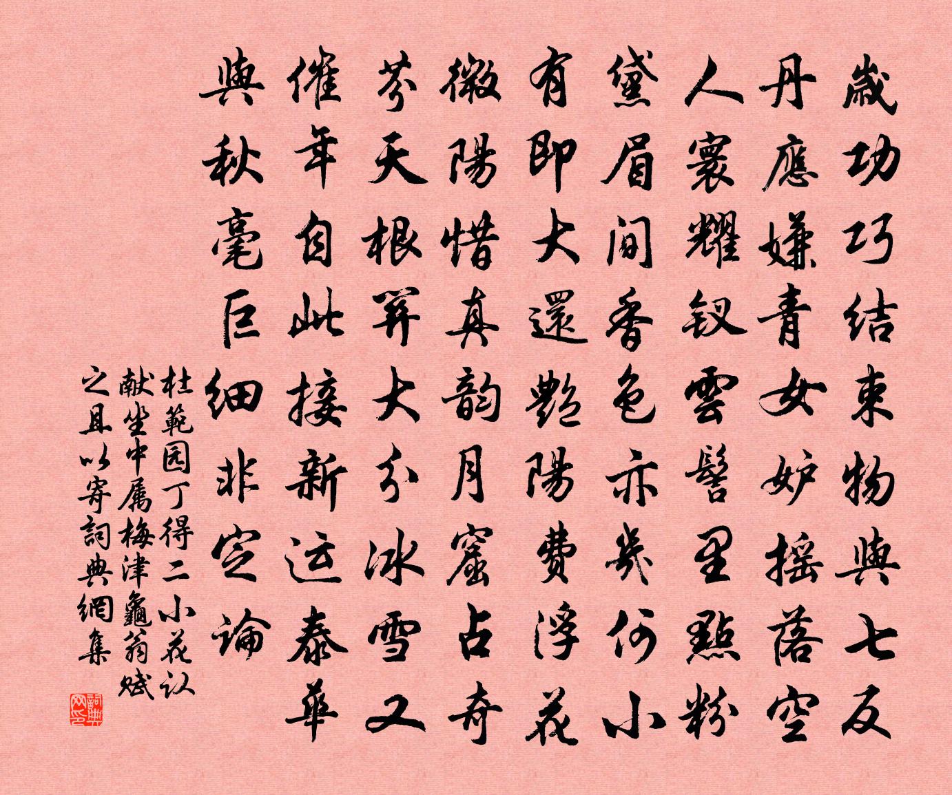 詩詞名句歷史字典書法欣賞書法字典國語詞典說文解字康熙字典古漢語字典標 題 作 者 詩 句 園丁得二小花認獻坐中屬梅津龜翁賦之且以寄作者:杜范 朝代:宋代原文歲功巧結束,物與七反丹。應嫌青女妒,搖落空人寰。耀釵雲髻里,點粉黛眉間。香色亦幾何,小有即大還。艷陽費浮花,微陽惜真韻。月窟占奇芬,天根關大分。冰雪又催年,自此接新運。泰華與秋毫,巨細非定論。詩詞問答問:《園丁得二小花認獻坐中屬梅津龜翁賦之且以寄》的作者是誰?答:杜范問:該詩寫於哪個朝代?答:宋代書法欣賞園丁得二小花認獻坐中屬梅津龜翁賦之且以寄書法作品詩文賞析【原題】:園丁得二小花認獻坐中屬梅津龜翁賦之且以寄處靜索詞仍有白戰寸鐵之禁自非不吃煙火誰解作比此架空生活處靜詞先至梅津詩繼之皆清絕可味輒用梅津韻奉呈諸丈殆類痴人強絕爛未免又吃漿也一笑詩詞推薦遲暮陸游〔宋代〕遲暮固多感,況此歲崢嶸。霜霰忽已集,夜聞絡緯鳴。青燈不解語,依依有餘情。銅瓶煮寒泉,中作笙簫聲。沈憂偈頌七十二首釋祖欽〔宋代〕雨散雲收月正明,無端平地鼓雷霆。慣曾坐斷乾坤客,喚作竅中蚯蚓聲。泛永康江詩沈約〔南北朝〕長枝萌紫葉。清源 * 苔。山光浮水至。春色犯寒來。臨睨信永矣。望美曖悠哉。寄言幽閨妾。羅袖勿空裁。遣興陸游〔宋代〕西州落魄九年余,濯錦江頭已結廬。誰遣徑歸朝鳳闕,不令小住奉魚書。塵埃眯目詩情盡,疾病侵人酒興疏。寄語劉吏部輓詞樓鑰〔宋代〕兄長與慈恩,相親色笑溫。公方持使節,余忝代王言。共約游三徑,俄悲作九原。佳城隔風浪,丹旐愴飛翻。題過所畫枯木竹石三首蘇軾〔宋代〕散木支離得自全,交柯蚴蟉欲相纏。不須更說能鳴雁,要以空中得盡年。行近湖州不果入城寄王成之使君張鎡〔宋代〕江左風流燕子家,有人襟度渺雲涯。謳歌馮翊今分竹,詞藻西垣舊判花。相望每居形跡外,投閒常動別離嗟。因行和黃教授山堂招飲呂聲之〔宋代〕鼎彝事業未渠休,鷗鷺尋盟暫與儔。路入芝岩真絕地,客延蓬島盡名流。不辭一洗陶巾醉,更擬雙飛謝屐游。誰賞金縷曲(和潭東勸飲壽觴)劉辰翁〔宋代〕拍瓮春醅動。洞庭霜、厭綠堆黃,林苞堪貢。況有老人潭邊菊,搖落賞心入夢。數百歲、半來許中俗語中半。兒女上耿泉生朝楊簡〔宋代〕是司九府,爰總數路。爰究爰度,阜豐化布,國用是裕。再用出郊韻三首吳潛〔宋代〕遠山空處斷雲收,一段秋光野思悠。鷹隼不妨侵碧落,魚島自覺得滄洲。桑榆晚景能多日,桂菊他鄉又一秋。聊把留題九龍巖陳某〔宋代〕里俗相傳有九龍,昔年棲隱此岩中。煙霄一去□□隔,石戶雙開舊徑通。月影日光東北近,泉聲山色古今同。何當送高郵周主簿兼呈陳君端薛師石〔宋代〕繞縣重湖色,難同說簿清。雖雲古郵置,不似近邊城。月落淮田闊,風晴隋柳輕。鄉人在曹職,相得為詩情。傷足邵雍〔宋代〕災由無妄得,為患固非深。乖已攝生理,貽親憂慮心。乍然艱步履,偶爾阻登臨。逾月方能出,難忘樂正箴。隱居危固〔宋代〕高士隱居處,迢迢綠水灣。數間玉川屋,七里子陵灘。出入是非外,醉醒文字間。千鍾天子祿,不肯換清閒。堪笑方岳〔宋代〕堪笑蕭生入受遺,八年師傅不相知。偶離廷尉痴如昨,直等朱游知藥罙。予自春夏屢病至立秋而愈作長句自賀陸游〔宋代〕良藥扶衰抵萬金,漸加糜粥輟呻吟。溪風拂簟有秋意,山影半庭生夕陰。薄俗只成驚老眼,幽居正得遂初心。岸巾甫里王令〔宋代〕甫里先生得古風,放身全入隱淪中。足磨漢榻星辰動,筆挫吳天物象空。往事欲尋人寂寂,舊田安在雨濛濛。當時過故城釋斯植〔宋代〕故城深巷長蒼苔,一度經過一度哀。尚有樓台攙雨出,豈無花柳向春開。十年心事今宵夢,千里家書昨日回。莫上三衢道中崔復初〔宋代〕一客在他鄉,行程一月強。雲寒山欲暗,日短道偏長。楓葉嫣如醉,梅花謝亦香。誰家砧杵急,回首感征裳。名句推薦綠陰不減來時路,添得黃鸝四五聲。曾幾《三衢道中》 過橋分野色,移石動雲根。賈島《題李凝幽居》 詩家清景在新春,綠柳才黃半未勻。楊巨源《城東早春》 樹挪死,人挪活。佚名《增廣賢文·下集》 春色將闌,鶯聲漸老。紅英落盡青梅小。寇準《踏莎行·春色將闌》 去日兒童皆長大,昔年親友半凋零。竇叔向《夏夜宿表兄話舊》 終然獨不見,流淚空自知。李白《獨不見》 荷盡已無擎雨蓋,菊殘猶有傲霜枝。蘇軾《贈劉景文 / 冬景》 長江巨浪征人淚,一夜西風共白頭。宋琬《江上阻風》 易漲易退山溪水,易反易覆小人心。佚名《增廣賢文·上集》
