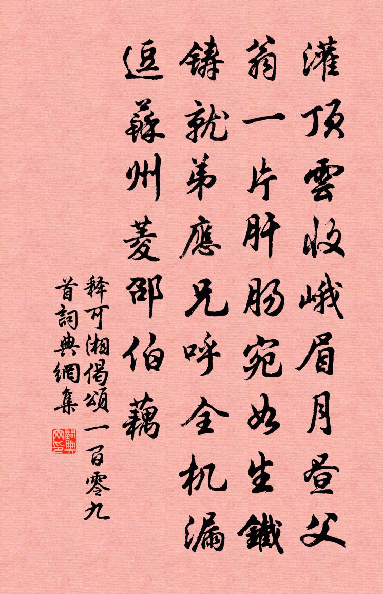 詩詞名句歷史字典書法欣賞書法字典國語詞典說文解字康熙字典古漢語字典標 題 作 者 詩 句 偈頌一百零九首作者:釋可湘 朝代:宋代偈頌一百零九首原文灌頂雲收,峨眉月晝。父翁一片肝腸,宛如生鐵鑄就。弟應兄呼,全機漏逗。蘇州菱,邵伯藕。詩詞問答問:偈頌一百零九首的作者是誰?答:釋可湘問:偈頌一百零九首寫於哪個朝代?答:宋代釋可湘偈頌一百零九首書法欣賞偈頌一百零九首書法作品詩詞推薦漫呈無咎一絕張耒〔宋代〕題扇燈前亦偶然,那知別後遠如天。去年醉舞看花處,獨聽琵琶卻惘然。十一月二十八日用後山詩韻虞儔〔宋代〕日暮江東天一涯,孤雲飛處路何賒。雪將入臘未破白,梅過先春競著花。過眼光陰渾是客,滿懷風雨政思家。何如雨舂柴隨亨〔宋代〕稻粱收盡水田空,閭舍翁嫗雨後舂。顆粒擬輸官府稅,只留糠覈冬。滿江紅(賀王宣子產湖南寇)辛棄疾〔宋代〕笳鼓歸來,舉鞭問、何如諸葛。人道是、匆匆五月,渡瀘深入。白羽風生貔虎噪,青溪路斷猩鼯泣。早紅塵、一騎望江南二首(送黃冕仲知福唐)廖剛〔宋代〕無諸好,方面鎮全閩。千騎泛雲歸洞府,三山明玉外風塵。依約是蓬瀛。賢刺史,龍虎擅香名。金花已傳當日夢,送黃司錄黃彥平〔宋代〕異縣傷流落,同官及老成。詩書尚家法,譜系更宗盟。歲暮一樽酒,陽春千里行。雙旌定何處,撫字振新聲。公齋四詠小松皮日休〔唐代〕婆娑只三尺,移來白雲徑。亭亭向空意,已解凌遼夐。葉健似虬須,枝脆如鶴脛。清音猶未成,紺彩空不定。陰圓游雁門山胡份〔宋代〕羲和前珥節,雲鎖已先開。仙鶴迎人至,山花拂酒來。問奇緣石室,伐陰出層台。人影半空落,歸鷂足下回。慶東原·泊羅陽驛趙善慶〔元代〕砧聲住,蛩韻切,靜寥寥門掩清秋夜。秋心鳳闕,秋愁雁堞,秋夢蝴蝶。十載故鄉心,一夜郵亭月。滿江紅蘇軾〔宋代〕憂喜相尋,風雨過、一江春綠。巫峽夢、至今空有,亂山屏簇。何似伯鸞攜德耀,簞瓢未足清歡足。漸粲然、光彩木蘭花慢 別西湖兩詩僧盧祖皋〔宋代〕嫩寒催客棹,載酒去、載詩歸。正紅葉漫山,清泉漱石,多少心期。三生溪橋話別,悵薜蘿、猶惹翠雲衣。不似今九月四日過增口道中洪咨夔〔宋代〕秋光拍塞小村墟,高下人家意自如。屋底四蠶抽蛹細,牆頭三桂著花疏。握兒早秫酒無限,杓子晚菘虀有餘。大似萬年歡蘇氏〔宋代〕日暖霜紅,畫戟門開,錦筵歌振梁塵。正是慈闈熙熙,慶誕佳辰。象服魚軒燦爛,喜高年、福祿長新。承顏處,朱金剛隨機無盡頌一合相理分第三十釋印肅〔宋代〕貪著是凡夫,不革是老盧。老盧今古在,迷背自塗糊。劉百十六兄送梅花大鯽新酒以詩將和其韻四首杜范〔宋代〕新篘盎盎瀉瓊晶,照我襟懷徹底清。多謝白衣相問勞,舉杯無語不勝情。京口遇薛野鶴戴復古〔宋代〕天下江山第一州,可能無地著詩流。黃金不愛買官職,白髮猶堪上酒樓。懊恨牡丹遭雨厄,叮嚀芍藥為春留。狂吟奉同六舅尚書詠茶碾煎烹三首黃庭堅〔宋代〕風爐小鼎不須催,魚眼長隨蟹眼來。深注寒泉收第一,亦防枵腹爆乾雷。和彥逢弟簡相山古上人二首王之道〔宋代〕蒿艾深迷古徑苔,荒涼菊塢與松栽。稻田正似人無幾,賴有高僧伴我來。徑坂左司使君惠和近詩為親而喜合天理之公得趙汝騰〔宋代〕扶杖來觀遍老農,清朝新禮采芝翁。德尊韋布封員外,恩重牙緋視治中。言悟千秋逢主聖,躬行萬石耀臣工。求與和侃法師三絕詩 三庾信〔南北朝〕回首河堤望。眷眷嗟離絕。誰言舊國人。到在他鄉別。名句推薦湘西一杯酒,渺渺紅葉換。趙蕃《次韻酬吳德夫去秋送行之作》 賈傅松醪酒,秋來美更香。杜牧《送薛種游湖南》 一去無訊息,那能惜馬蹄。薛道衡《昔昔鹽》 君子以同而異。佚名《易傳·象傳下·睽》 不是誠齋無月,隔一林修竹。楊萬里《好事近·七月十三日夜登萬花川谷望月作》 剪不斷,理還亂,是離愁。別是一般滋味在心頭。李煜《相見歡·無言獨上西樓》 不怕風狂雨驟,恰才稱,煮酒箋花。李清照《轉調滿庭芳·芳草池塘》 溪上桃花無數,花上有黃鸝。黃庭堅《水調歌頭·遊覽》 待人寬一分是福,利人實利己的根基。洪應明《菜根譚·概論》 明月如霜,好風如水,清景無限。蘇軾《永遇樂·彭城夜宿燕子樓》
