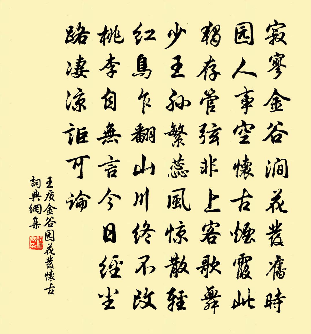 詩詞名句歷史字典書法欣賞書法字典國語詞典說文解字康熙字典古漢語字典標 題 作 者 詩 句 金谷園花發懷古作者:王質 朝代:宋代金谷園花發懷古原文寂寥金谷澗,花發舊時園。人事空懷古,煙霞此獨存。管弦非上客,歌舞少王孫。繁蕊風驚散,輕紅鳥乍翻。山川終不改,桃李自無言。今日經塵路,淒涼詎可論。詩詞問答問:金谷園花發懷古的作者是誰?答:王質問:金谷園花發懷古寫於哪個朝代?答:宋代問:金谷園花發懷古是什麼體裁?答:五排王質金谷園花發懷古書法欣賞金谷園花發懷古書法作品注釋全唐詩:卷488-11詩詞推薦殘句寒食清明都過了蘇軾〔宋代〕寒食清明都過了,石泉槐火一時新。贈相士方岳〔宋代〕老來學劍已無成,眼底邊塵猝未清。此輩束之高閣耳,且容黃犢伴春耕。驚雪陸暢〔唐代〕怪得北風急,前庭如月輝。天人寧許巧,剪水作花飛。謝圓機除祟賦晁說之〔宋代〕祟鬼當年曾蹔解,賦成今日永嘉祥。無煩鑄鼎圖群象,可笑時儺逐畢方。蕩滌辭源能澎濞,誅鋤筆陣更光鋩。此身郊廟歌辭。武后大享昊天樂章佚名〔唐代〕大陰凝至化,真耀蘊軒儀。德邁娥台敞,仁高姒幄披。捫天遂啟極,夢日乃升曦。瞻紫極,望玄穹。翹至懇,罄深感春三首張耒〔宋代〕梅梢柳眼弄春嬌,雲暖南山臘雪消。近郭樵漁成野市,遠村簫鼓隔溪橋。代別後夢別長孫佐輔〔唐代〕別中還夢別,悲後更生悲。覺夢俱千里,追隨難再期。翻思夢裡苦,卻恨覺來遲。縱是非真事,何妨夢會時。上元前一日陸游〔宋代〕異縣客游久,今年春事遲。峭寒增酒價,微雨惱燈欺。老態人未覺,孤愁心自知。停車呼病婦,強出伴諸兒。送人北上王冕〔元代〕早買北關門外船,載書應上九重天。風雲步武君可羨,世事乖違吾獨憐。黃閣大官歸厚祿,紅樓美酒不多錢。逢人減字木蘭花黃庭堅〔宋代〕新年何許春光漏。小院閉門風日透。酥花入坐頗欺梅,雪絮因風全是柳。使君落筆春詞就。應喚歌檀催舞袖。得開秋日山所見野花王炎〔宋代〕風流渾似內家妝,也想春風不分香。從得傾城與傾國,牡丹人道是花王。龍山野釋永頤〔宋代〕聞說西潘桑枯少,舊來多川紫櫻桃。龍山春晚聊舒望,雪白梨花一丈高。同宋參軍之問夢趙六贈盧陳二子之作陳子昂〔唐代〕曉霽望嵩丘。白雲半岩足。氛氳涵翠微。宛如嬴台曲。故人昔所尚。幽琴歌斷續。變化竟無常。人琴遂兩亡。白雲朝中措黃公度〔宋代〕幽香冷艷綴疏枝。橫影臥霜溪。清楚渾如南郭,孤高勝似東籬。歲寒風味,黃花盡處,密雪飛時。不比三春桃李,悼亡九首張耒〔宋代〕千行垂淚對風煙,萬事傷心兒女前。曉鏡不須催白髮,潘郎秋鬢久蕭然。和許侍郎游昆明池李百藥〔唐代〕神池望不極,滄波接遠天。儀星似河漢,落景類虞泉。年深平館宇,道泰偃戈船。差池下鳧雁,掩映生雲煙。浪花畫生李維寫予像今已十年對鑒觀之因題其側蔡襄〔宋代〕清眸綠髮十年前,樸野風神不易傳。今日青銅莫相照,白髭垂頷面雙顴。和厲玄侍御、無可上人會宿見寄姚合〔唐代〕九衢難會宿,況復是寒天。朝客清貧老,林僧默悟禪。眠遲消漏水,吟苦墮寒涎。異日來尋我,滄江有釣船。泛太湖羅處約〔宋代〕三萬六千頃,湖侵海內田。逢山方得地,見月始知天。南國吞將盡,東溟勢欲連。何當灑為雨,無處不豐年。菩薩蠻(曉行西湖邊)張炎〔宋代〕霜花鋪岸濃如雪。田間水淺冰初結。林密亂鴉啼。山深雁過稀。風恬湖似鏡。冷浸樓台影。梅不怕隆寒。疏葩正耐名句推薦人皆欲會說話,蘇秦乃因會說而殺身王永彬《圍爐夜話·第七則》 自從一閉風光後,幾度飛來不見人。李益《隋宮燕》 水際輕煙,沙邊微雨。荷花芳草垂楊渡。劉將孫《踏莎行·閒遊》 雌雄空中鳴,聲盡呼不歸。白居易《燕詩示劉叟》 不得乎親,不可以為人;不順乎親,不可以為子。孟子《孟子·離婁章句上·第二十八節》 利出者實及,怨往者害來。列子及其弟子《列子·說符》 江上小堂巢翡翠,花邊高冢臥麒麟。杜甫《曲江二首》 賈傅松醪酒,秋來美更香。杜牧《送薛種游湖南》 寧我負人,毋人負我。陳壽《三國志·魏書·武帝紀》 細數十年事,十處過中秋。范成大《水調歌頭·細數十年事》