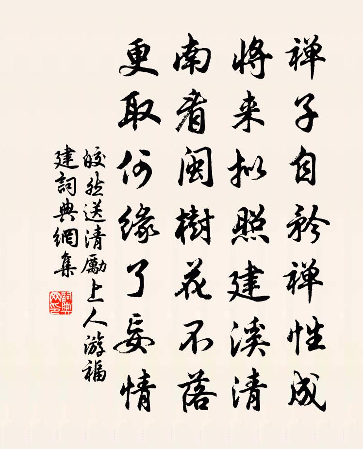 詩詞名句歷史字典書法欣賞書法字典國語詞典說文解字康熙字典古漢語字典標 題 作 者 詩 句 送清勵上人游福建作者:皎然 朝代:唐代送清勵上人游福建原文禪子自矜禪性成,將來擬照建溪清。南看閩樹花不落,更取何緣了妄情。詩詞問答問:送清勵上人游福建的作者是誰?答:皎然問:送清勵上人游福建寫於哪個朝代?答:唐代問:送清勵上人游福建是什麼體裁?答:七絕皎然送清勵上人游福建書法欣賞送清勵上人游福建書法作品注釋全唐詩:卷818-40詩詞推薦偈頌一百三十六首釋惟一〔宋代〕走盡四天下,只在一塵中。不離一塵中,周遍四天下。不是神通,亦非力假。有人知得著落,許你入妙喜世界,是挽戚虛中華岳〔宋代〕夢裹匡廬興未闌,轉頭世事已辛酸。肥家有術疑非藥,漉酒從人笑不冠。雁序向人群已失,鳳雛過眼影何單。不堪又用前韻賦夜坐方回〔宋代〕酒醒招得醉魂歸,深護爐熏鍵夕扉。渴舌惡甜勤漱茗,癯肩耐凍懶添衣。頗聞空暗無星出,小待更深定雪飛。一字送小劉解元赴試南宮王洋〔宋代〕衰年稅蕭寺,偶與鳳巢鄰。萬里刷鮮羽,一鳴驚眾人。寒催片騎急,春接賜袍新。折取如丹桂,歸榮鶴髮親。西山雨中獨宿寄粹之李彌遜〔宋代〕窈窕山房水樣清,定回燈影暗還明。對床不見逃禪晉,竹雨聲中夢不成。迎李近仁員外魚玄機〔唐代〕今日喜時聞喜鵲,昨宵燈下拜燈花。焚香出戶迎潘岳,不羨牽牛織女家。城上李商隱〔唐代〕有客虛投筆,無憀獨上城。沙禽失侶遠,江樹著陰輕。邊遽稽天討,軍須竭地征。賈生遊刃極,作賦又論兵。好事近(乘風亭作)趙彥端〔宋代〕君莫厭江鄉,也有茂林修竹。竹外有些亭榭,置酒尊棋局。棋神酒聖各成歡,歡長更燒燭。寄語故人鵬鷃,任傾金寄歸州馬判官齊己〔唐代〕郡帶女嬃名,民康境亦寧。晏梳秋鬢白,閒坐暮山青。贈客椒初熟,尋僧酒半醒。應懷舊居處,歌管隔牆聽。清平樂·春花秋草晏殊〔宋代〕春花秋草,只是催人老。總把千山眉黛掃。未抵別愁多少。勸君綠酒金杯,莫嫌絲管聲催。兔走烏飛不住,人生幾作夢陸游〔宋代〕作夢今逾七十年,平生懷抱尚依然。結茅杜曲桑麻地,覓句灞橋風雪天。驃騎向來求作佛,淮南末路望登仙。世間夜坐讀離騷張嵲〔宋代〕山風颯颯木蕭蕭,挑盡青燈夜正遙。但得誅茅臨澗水,長年飲酒詠離騷。勉學陸游〔宋代〕學力艱危見,精誠夢寐知。眾人雖莫察,吾道豈容欺?雷雨含元氣,蓍龜決大疑。為儒能體此,端不負先師。司空平章軍國事贈太師開國正獻呂公輓辭五首蘇頌〔宋代〕首建司空府,前臨魏闕門。特留黃髮老,對直紫微垣。故事傳台閣,清風遺子孫。四方桃李滿,不待史官言。謝答聞善二兄九絕句黃庭堅〔宋代〕陶令舍中有名酒,無日不為父老傾。四座歡欣觀酒德,一燈明暗又詩成。酹江月(暇日登新樓,望揚州於雲煙緲之間,寄趙南仲端明)吳潛〔宋代〕半空樓閣,把江山圖畫,一時收拾。白鳥孤飛飛盡處,最好暮天秋碧。萬里西風,百年人事,謾倚闌乾拍。凝眸何汎星槎張鎡〔宋代〕鼻祖尋河源,織女喜停機。我不願上天,湖中亦忘歸。次友人示詩集姚勉〔宋代〕杖藜看筍數犀株,天墮香雲五色書。落月照人驚夢昨,光風識面記春初。珠駢巧語誰能揀,錦比新詩迥不如。轉讀得蓮子趙文〔宋代〕休休得一閒,杯酒聊從容。晚涼過池亭,受用水上風。默存即實境,身在蓮花中。何況青青盤,磊落堆蓮蓬。乍休陳德瑞饋新茶朱松〔宋代〕空山冥冥雲霧窗,春風好夢欹殘缸。朝來果得故人信,微凸而么犀銙雙。貴人爭買百瓔珞,此心兒女久已降。坐觀名句推薦欲買桂花同載酒,終不似,少年游。劉過《唐多令·蘆葉滿汀洲》 枝上柳綿吹又少。天涯何處無芳草。蘇軾《蝶戀花·春景》 鮑魚蘭芷,不同篋而藏劉向《說苑·指武》 夜吟敲落霜紅,船傍楓橋系。吳文英《荔枝香近·送人游南徐》 教小兒宜嚴,嚴氣足以平躁氣王永彬《圍爐夜話·第八則》 以色事他人,能得幾時好。李白《妾薄命》 萬里乘雲去復來,隻身東海挾春雷。秋瑾《黃海舟中日人索句並見日俄戰爭地圖》 東飛伯勞西飛燕,黃姑織女時相見。蕭衍《東飛伯勞歌》 非知之難,行之為難;非行之難,終之斯難。吳兢《貞觀政要·卷十·論慎終》 有風方起浪,無潮水自平。吳承恩《西遊記·第七十五回》