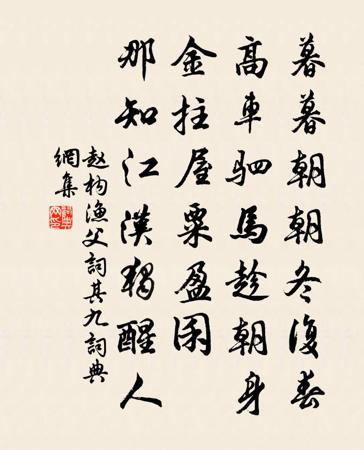 詩詞名句歷史字典書法欣賞書法字典國語詞典說文解字康熙字典古漢語字典標 題 作 者 詩 句 漁父詞(其九)作者:趙構 朝代:宋代漁父詞(其九)原文暮暮朝朝冬復春。高車駟馬趁朝身。金拄屋,粟盈囷。那知江漢獨醒人。詩詞問答問:漁父詞(其九)的作者是誰?答:趙構問:漁父詞(其九)寫於哪個朝代?答:宋代問:漁父詞(其九)是什麼體裁?答:詞趙構漁父詞(其九)書法欣賞漁父詞(其九)書法作品詩詞推薦次長蘆張舜民〔宋代〕炎荒往返正三年,重過長蘆古寺前。萬里風波行欲盡,停撓南望一潸然。送僧法印智因西上賀鑄〔宋代〕千里長淮北,東風破雪寒。此行休問路,驀直到長安。詩劉楨〔魏晉〕初春含寒氣。陽氣匿其暉。灰風從天起。砂石縱橫飛。次令衿游玉壺高詠十絕處處可人席羲叟〔宋代〕陂塘五月迎秋爽,脩竹成陰一徑開。俗客自應慚到此,幽深雅稱杖藜來。宿山家韋莊〔唐代〕山行侵夜到,雲竇一星燈。草動蛇尋穴,枝搖鼠上藤。背風開藥灶,向月展漁罾。明日前溪路,煙蘿更幾層。句徐似道〔宋代〕葉從秋後變,色向曉來紅。送僧歸淨眾釋慧空〔宋代〕君不見昔日貴湖拋保福,苧溪溪畔曾叮囑。汝歸東海我歸山,鳥道行人難措足。又不見無隱當年隱石師,獨傍岩阿贈江州景德長老蘇軾〔宋代〕白足高僧解達觀,安排春事滿幽欄。不須天女來相試,總把空花眼裡看。頌古五十三首釋文禮〔宋代〕天地廣無邊,何雲藏北斗。跛腳老雲門,未明三 * 。金剛隨機無盡頌依法出生分第八釋印肅〔宋代〕遍觀諸佛法,不與群情雜。聲色外威儀,透過魔軍甲。效孟郊體謝翱〔宋代〕移參窗此地,經歲日不至。悠悠荒郊雲,背植足陰氣。新雨養陳根,乃復佐藥餌。天涯葵藿心,憐爾獨種參。次韻都曹燈夕之作強至〔宋代〕夜色澄明宇宙寬,新正才半覺春慳。行歌遡月疑塵外,醉眼隨車憶夢間。燭影更和人散亂,漏聲不放馬舒閒。啼鳥三月壬申同堯民希孝觀渠名寺經藏得弘明集中黃庭堅〔宋代〕秘藏開新譯,天花雨舊堂。證經多寶塔,寢疾淨名床。鳥語雜歌頌,蛛絲凝篆香。同游得趙李,談道過何王。蝶戀花張之翰〔元代〕往歲相從今幾許。今歲逢君,愈見真誠處。除卻交情無別語。匆匆忍上歸舟雲。醉里猶歌長短句。醒後軒窗,歷歷菩薩蠻(夏)劉燾〔宋代〕潤肌饒汗香紅沁。沁紅香汗饒肌潤。低檻小山圍。圍山小檻低。枕橫釵墜鬢。鬢墜釵橫枕。歸夢與郎期。期郎與夢巫山華岳〔宋代〕碧簪千丈倚巴江,暮雨朝雲總是常。山勢插天宮殿少,不知何處是高堂。依韻和邵太子文兄八月總章朝歸長句晁說之〔宋代〕東皇受籙增嘉運,曉坐明堂夜拜章。玉燭千年承瑞露,金龍萬國鎮青霜。風來紫極簫聲靜,人在丹台佩影涼。與子春睡朱淑真〔宋代〕午窗春睡中,堆枕起來時。瘦怯羅衣褪,慵妝鬢影垂。舊愁消不盡,新恨忽相隨。有蝶傳魂夢,無鴻寄別離。禮湘山佛和別駕叔韻李曾伯〔宋代〕自得湘南一派奇,禪舂元熟不須師。幾千億化如來相,五百年將再出時。翠壁雲連秋樹老,寶坊香靜午齋遲。我來贈江西吳定夫劉宰〔宋代〕定夫江海士,瘦骨如臞仙。翩然及吾門,不假左右先。我方厭塵埃,一笑喜相延。肩縣兩破囊,既見始解纏。我欲名句推薦白頭搔更短,渾欲不勝簪。杜甫《春望》 書無不可讀者!魏徵《隋書·列傳·卷四十一》 夜深靜臥百蟲絕,清月出嶺光入扉。韓愈《山石》 弱柳青槐拂地垂,佳氣紅塵暗天起。盧照鄰《長安古意》 喜怒無蹤,慎思及遠,人所難圖焉。來俊臣《羅織經·固榮卷第六》 私行勝,則少公功。韓非及後人《韓非子·外儲說左下》 蒼蒼竹林寺,杳杳鐘聲晚。劉長卿《送靈澈上人》 天地合而萬物生,陰陽接而變化起,性偽合而天下治。荀子《荀子·禮論》 黃花本是無情物,也共先生晚節香。于謙《過菊江亭》 但使龍城飛將在,不教胡馬度陰山。王昌齡《出塞二首》