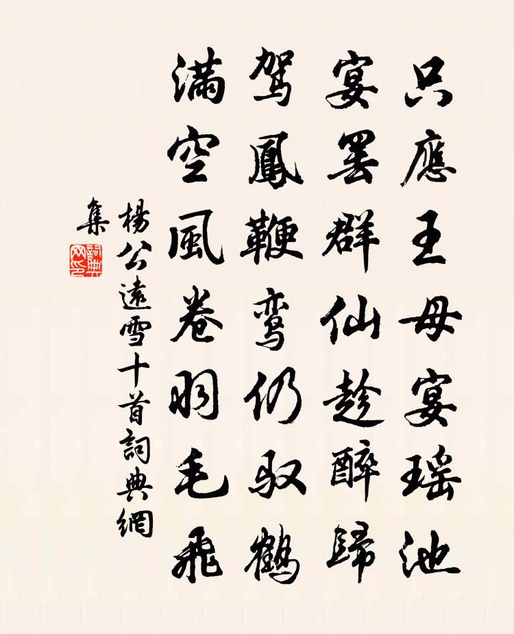 詩詞名句歷史字典書法欣賞書法字典國語詞典說文解字康熙字典古漢語字典標 題 作 者 詩 句 雪十首作者:楊公遠 朝代:宋代雪十首原文只應王母宴瑤池,宴罷群仙趁醉歸。駕鳳鞭鸞仍馭鶴,滿空風卷羽毛飛。詩詞問答問:雪十首的作者是誰?答:楊公遠問:雪十首寫於哪個朝代?答:宋代楊公遠雪十首書法欣賞雪十首書法作品詩詞推薦思黯南墅賞牡丹劉禹錫〔唐代〕偶然相遇人間世,合在增城阿姥家。有此傾城好顏色,天教晚發賽諸花。題南康太守宅五老亭蘇轍〔宋代〕王老高閒不入城,開軒肯就史君迎。坐中莫著閒賓客,物外新成六弟兄。雲氣飄浮衣袂舉,泉流灑落佩環聲。岌然紅梅閣二首李石〔宋代〕天上佳上雲縷衣,暗傳春恨入新詩。樓頭玉笛關情緒,不念殘香結子時。寄查元章晁公溯〔宋代〕一別三十載,再來聞未聞。割鮮煩啗我,舉酒欲浮君。辯口霏木屑,醉顏生纈紋。相從能幾日,明發重離群。句吳光〔宋代〕月借窗移疏影轉,風翻雪放一枝高。感皇恩王千秋〔宋代〕天氣過燒燈,初閒人倦。曉色曈曨繡簾卷。聚星歌扇,一簇雪香瓊軟。壽杯爭要把,從他滿。低低笑祝,年齡遐遠浯溪中興頌易祓〔宋代〕湘江東西直浯溪,上有十丈中舉碑。誰鑒豐碑鎮山曲,溪邊美人美如玉,想當歌頌大業時,胸蟠星斗光陸離。蠶須竹溪生日二首劉克莊〔宋代〕兩翁雖老殊精悍,筆力縱橫可掣鯨。晚各為農同保社,昔偕謁帝入承明。不嫌華發稱遺老,猶冀餘年看太平。從古歲除二首劉克莊〔宋代〕冰銜常憑麽,雪鬢轉皤然。一然差堪喜,詩多似去年。憶父母汪真〔宋代〕屺岵登來步步悲,百年空有淚雙垂。淒淒葉落秋風曉,寂寂燈昏夜雨時。庭院每驚攜杖履,羹牆長見畫容儀。遙瞻石門元好問〔金代〕兩崖橫絕倚山垠,草徑低迷未可分。潭影乍從明處見,竹香偏向靜中聞。石林萬古不知暑,茅屋四鄰惟有雲。曳杖宮詞張公庠〔宋代〕天語放朝春雪急,濃雲偏傍禁城低。喧呼萬馬爭歸路,落絮飛花半作泥。鷓鴣天 漁父洪希文〔元代〕萬頃玻璃浩蕩浮。桃李小岸蓼花洲。春風秋月等閒度,雨笠煙蓑得自由。移桂棹,下綸鉤。功名利祿不須求。得魚絕句六十四首張伯端〔宋代〕須將死戶為生戶,莫執生門號死門。若會殺機明返覆,始知害里卻生恩。鄉校頌陸淞〔宋代〕維校在鄉,示民有防。入孝出悌,為忠為良,斯邦家之光。湘月·天風吹我龔自珍〔清代〕壬申夏泛舟西湖,述懷有賦,時予別杭州蓋十年矣天風吹我,墮湖山一角,果然清麗。曾是東華生小客,回首蒼茫宮詞王仲修〔宋代〕繭館輕寒曉漏殘,春陰桑柘碧於藍。宵衣願治先農事,故敕宮娥學養蠶。菩薩蠻(立春日)郭應祥〔宋代〕雪銷未久寒猶力。霜華特地催晴色。殘臘尚餘旬。隔年先見春。獨憐霜點鬢。羞戴銀幡勝。百里卻熙然。今年強去郊廟歌辭。釋奠武成王樂章。迎俎酌獻佚名〔唐代〕五齊潔,九牢碩。梡橛循,罍斝滌。進具物,揚鴻績。和奏發,高靈寂。虔告終,繁祉錫。昭秩祀,永無易。與歌童田順郎劉禹錫〔唐代〕天下能歌御史娘,花前葉底奉君王。九重深處無人見,分付新聲與順郎。名句推薦年年春日異鄉悲,杜曲黃鶯可得知。韋莊《江外思鄉》 美人自刎烏江岸,戰火曾燒赤壁山,將軍空老玉門關。張可久《賣花聲·懷古》 兒童見說深驚訝,卻問何方是故鄉。殷堯藩《同州端午》 江海不擇小助,故能成其富。韓非及後人《韓非子·大體》 稚子金盆脫曉冰,彩絲穿取當銀錚。楊萬里《稚子弄冰》 春風十里揚州路,卷上珠簾總不如。杜牧《贈別》 好學深思,心知其意。司馬遷《史記·五帝本紀》 天明登前途,獨與老翁別。杜甫《石壕吏》 善用兵者不以短擊長,而以長擊短。司馬遷《史記·淮陰侯列傳》 哀哀父母,生我勞瘁。佚名《蓼莪》