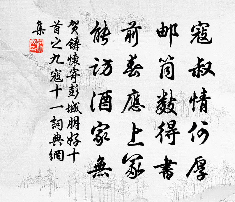 詩詞名句歷史字典書法欣賞書法字典國語詞典說文解字康熙字典古漢語字典標 題 作 者 詩 句 懷寄彭城朋好十首之九寇十一作者:賀鑄 朝代:宋代原文寇叔情何厚,郵筒數得書。前春應上冢,能訪酒家無。詩詞問答問:《懷寄彭城朋好十首之九寇十一》的作者是誰?答:賀鑄問:該詩寫於哪個朝代?答:宋代問:賀鑄的名句有哪些?答:賀鑄名句大全書法欣賞懷寄彭城朋好十首之九寇十一書法作品詩詞推薦次韻楊宰陳造〔宋代〕有薪尚濕惡,有谷未舂簸。病客正牢落,忽雪忽蜚墮。枵腹亟問炊,曲身可欠火。檐隙納璀璨,座隅紛碎瑣。繽漂滿庭芳 嘆名利馬鈺〔元代〕利惹心猿,名牽意馬,無晝無夜賓士。波波劫劫,來往沒休期。一向貪饕越煞,心勞役、形苦神疲。休迷執,一個孟子王令〔宋代〕孟子不肯比伊尹,仲尼方可期文王。聖賢自得固厚重,庸俗始以己較量。微生喜以佞面詆,臧氏惡非禮所當。惜哉二十一日風甚明日梅花無在者獨紅萼留枝間甚陳與義〔宋代〕昨日梅花猶可攀,今朝殘萼便斕班。群仙已御東風去,總脫絳袂留林間。烏程水樓留別皇甫曾〔唐代〕悠悠千里去,惜此一尊同。客散高樓上,帆飛細雨中。山程隨遠水,楚思在青楓。共說前期易,滄波處處同。燭影搖紅張炎〔宋代〕二三友行歌雲舞繡中,亦清時之可樂,以詞寫之。舟艤鷗波,訪鄰尋里愁都散。老來猶似柳風流,先露看花眼。閒春霽朱淑真〔宋代〕淡淡輕寒雨後天,柳絲無力妥殘煙。弄晴鶯舌於中巧,著雨花枝分外妍。消破舊愁憑酒盞,去除新恨賴詩篇。年年採桑行顧禧〔宋代〕羅敷深閨女,出入有常儀。何為乎度陌越阡,執筐躊躇。執筐而躊躇,夫婿雖真,豈能不蠶而衣。次韻徐贊府蜚英八首方回〔宋代〕長官行縣課農書,耕叟治田賈趁虛。上到嶺頭望應喜,人煙今密舊時疏。渡泉嶠出諸山之頂詩江淹〔南北朝〕岑崟蔽日月。左右信艱哉。萬壑共馳騖。百穀爭往來。鷹隼既厲翼。蛟魚亦曝鰓。崩壁迭枕臥。嶄石屢盤迴。伏波朱亭伯改轉見過一首蘇籀〔宋代〕三就可憐繁馬頸,一鳴須信絕雞群。縶維才駿殊旌別,籍甚名聲奈耳聞。浩渺池庭輩鴻鷺,勝軒館殿擢蘭芸。相容和資政侍郎湖亭雜詠絕句十首采菱梅堯臣〔宋代〕紫角菱實肥,青銅菱葉老。孤根未能定,不及寒塘草。次韻石秀才淮上偶作鄭獬〔宋代〕出汴忽如魚脫網,長淮萬里斷煩囂。白雲已抱日光轉,碧浪更和天面搖。自此乘槎須犯斗,誰能鞭石解為橋。玉京送人自蘇州之長沙縣官薛能〔唐代〕驅馬復乘流,何時發虎丘。全家上南嶽,一尉事諸侯。茶煮朝宗水,船停調角州。炎方好將息,卑濕舊堪憂。正月三日閒行白居易〔唐代〕黃鸝巷口鶯欲語,烏鵲河頭冰欲銷。[黃鸝,坊名。烏鵲,河名。]綠浪東西南北水,紅欄三百九十橋。[蘇之官挽徐縣尹吳龍翰〔宋代〕雄筆工褒貶,登科年少時。青山知宦拙,白首尚書痴。鶚薦仍歸弟,鳳毛喜有兒。傳家遺卷在,光彩玉離離。和帥座勸農三首趙善括〔宋代〕投老歸歟一草亭,蓽門蕙帳對蘭屏。自從濫吹紅蓮幕,孤負東風柳眼青。趙賓暘唐師善見和涌金城望次韻五首方回〔宋代〕主人攜妓我題詩,三十年如一瞬馳。尚想泊船行馬處,不殊沖雪探梅時。相君已抱犧牛悔,京兆空餘鵩鳥悲。長思仙侯善淵〔元代〕明宗祖,悟真禪。靈光一點出先天。易蒼丹,*素玄。澄瑞秀,滿山川。霜天風息自凝然。散瓊花,寶桂圓。蘭亭故居王邁〔宋代〕弭節稽山樂事多,舊聞一一入搜羅。臥薪伯業今何在,喬木家聲久不磨。可笑兒曹憐野鶩,卻輸道士辨籠鵝。不因名句推薦無有定法如來可說。鳩摩羅什譯《金剛經·無得無說》 昭君拂玉鞍,上馬啼紅頰。李白《王昭君二首》 歲華向晚愁思,誰念玉關人老?蔡挺《喜遷鶯·霜天秋曉》 羊腸白道穿雲出,雁齒紅橋亞水低。許德溥《西橋柳色》 麋鹿成群,虎豹避之;飛鳥成列,鷹鷲不擊劉向《說苑·雜言》 細腰爭舞君沉醉,白日秦兵天下來。李涉《楚宮怨二首·其一》 獨夜憶秦關,聽鍾未眠客。韋應物《夕次盱眙縣》 煢煢孑立,形影相弔。西晉·李密《陳情表》 數枝門柳低衣桁,一片山花落筆床。岑參《山房春事二首》 柳垂江上影,梅謝雪中枝。晏幾道《臨江仙·身外閒愁空滿》