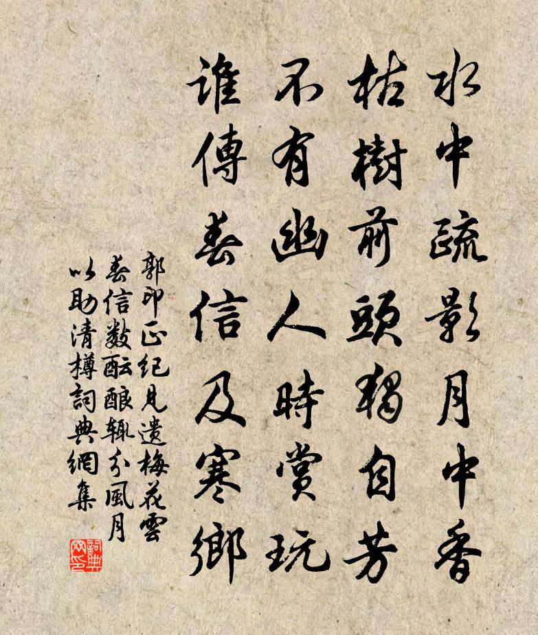詩詞名句歷史字典書法欣賞書法字典國語詞典說文解字康熙字典古漢語字典標 題 作 者 詩 句 正紀見遺梅花雲春信數醞釀輒分風月以助清樽作者:郭印 朝代:宋代原文水中疏影月中香,枯樹前頭獨自芳。不有幽人時賞玩,誰傳春信及寒鄉。詩詞問答問:《正紀見遺梅花雲春信數醞釀輒分風月以助清樽》的作者是誰?答:郭印問:該詩寫於哪個朝代?答:宋代書法欣賞正紀見遺梅花雲春信數醞釀輒分風月以助清樽書法作品詩文賞析【原題】:正紀見遺梅花雲春信數醞釀輒分風月以助清樽而一樽無有也戲成兩絕贈之詩詞推薦九月八日酬皇甫十見贈白居易〔唐代〕君方對酒綴詩章,我正持齋坐道場。處處追游雖不去,時時吟詠亦無妨。霜蓬舊鬢三分白,露菊新花一半黃。惆悵口占謝高簿送錦薰籠王志道〔宋代〕一種薰籠出錦機,殷勤遣送到書幃。自慚不是裁花手,沾得仇香香滿衣。雪禁體陳杰〔宋代〕南風導前北風續,仁氣潛隨殺機伏。初疑慘澹八表昏,忽變光明大千足。上天之載德如毛,帝力不知封比屋。垢污題蔡君謨墨跡後李廌〔宋代〕古人托一技,身死名不滅。賢愚置不論,筆畫觀可閱。嶧山刻秦銘,斯篆屈金鐵。雖在眾憎惡,恨不頸薦鉞。褚令和微之游湖春夏秋冬四絕韓維〔宋代〕冰散玉珂微弄暖,梅含金粉巧矜新。道人不管年光逝,貪作詩章等待人。題寶林瓊閣黎房舒坦〔宋代〕山農未用踏溝車,一穴靈泉蔭萬家。香積從今飽檀施,會看講夜落天花。送鄭司直歸上都劉長卿〔唐代〕歲歲逢離別,蹉跎江海濱。宦遊成楚老,鄉思逐秦人。馬首歸何日,鶯啼又一春。因君報情舊,閒慢欲垂綸。漁父吳鎮〔元代〕殘陽浦里漾漁船。青草湖中欲暮天。看白鳥,下平川。點破瀟湘萬里沛公亭傅若金〔元代〕遙山寂寂對危亭,壞礎欹沙柳自青。四海久非劉社稷,千秋猶有漢精靈。豐西水散煙沉浦,碭北雲來雨入庭。坐想上鄧憲生辰楊簡〔宋代〕乃眷西顧,金節異之。禮樂光華,亦王近畿。穆王宴王母於九光流霞館曹唐〔唐代〕桑葉扶疏閉日華,穆王邀命宴流霞。霓旌著地雲初駐,金奏掀天月欲斜。歌咽細風吹粉蕊,飲余清露濕瑤砂。不知菩薩蠻(初冬旅中)趙長卿〔宋代〕客帆卸盡風初定。夜空霜落吳江冷。幸自不思歸。無端烏夜啼。雞鳴殘月落。到枕秋聲惡。有酒不須斟。酒深愁轉呈定國蘇軾〔宋代〕舊病應逢醫口藥,新妝漸畫入時眉。信知詩是窮人物,近覺王郎不作詩。愛日陳普〔宋代〕絕妙茅齋對竹林,少年日月直千金。殷勤好與此君約,不許空移不寸陰。賦得白鷗歌送李伯康歸使盧綸〔唐代〕積水深源,白鷗翻翻。倒影光素,於潭之間。銜魚魚落亂驚鳴,爭撲蓮叢蓮葉傾。爾不見波中鷗鳥閒無營,何必汲葉茂卿寄詩卷賦此以謝之陳文蔚〔宋代〕正念交情舊,忽來詩卷新。既能賒酒餘,寧作賣書貧。計想尋窗下,閒須過澗濱。為言田舍樂,花鳥亦情真。題米元暉萬里長江圖錢聞詩〔宋代〕太湖水入霅溪寒,疊嶂連山幾萬般。此景古今無盡藏,總歸懶拙一毫端。秋懷三十六首邵雍〔宋代〕稻稌天所生,{左麥右匊}櫱人所制。釀之命為酒,飲之可成醉。剛者使之柔,懦者使之毅。善移造物權,其功亦舉世美奉詔旨分督決獄甲戌判袂之武陽壬午還趙蕃〔宋代〕盛暑宵憂動邃旒,敕催諸道決纍囚。承流宣澤彌兢惕,履險航湍敢滯留。南北分馳才數夕,重輕釋系已三州。高材次韻何廉昉太守感懷述事十六首曾國藩〔清代〕二月長安春姑歸,觚稜回首夢魂飛。宮鴉掠日槐陰瘦,廄馬嘶風柳絮肥。東閣賜茶雙鳳闕,西效扈蹕九龍旗。十年名句推薦存亡在虛實,不在於眾寡。韓非及後人《韓非子·安危》 一一書來報故人,我欲因之壯心魄。李白《赤壁歌送別》 應是夜寒凝。惱得梅花睡不成。黃升《南鄉子·冬夜》 平皋行雁下,曲渚雙鳧出。崔元翰《奉和聖制重陽旦日百寮曲江宴示懷》 哀哀父母,生我勞瘁。佚名《蓼莪》 苦雨思白日,浮云何由卷。李白《玉真公主別館苦雨贈衛尉張卿二首》 用兵之道,先勝後戰。陳壽《三國志·魏書·荀彧攸賈詡傳》 惡言不出於口,忿言不反於身。戴聖《禮記·祭義》 猶余雪霜態,未肯十分紅。王十朋《紅梅》 斷送落花三月雨,摧殘楊柳九秋霜。施耐庵《水滸傳·第十六回》