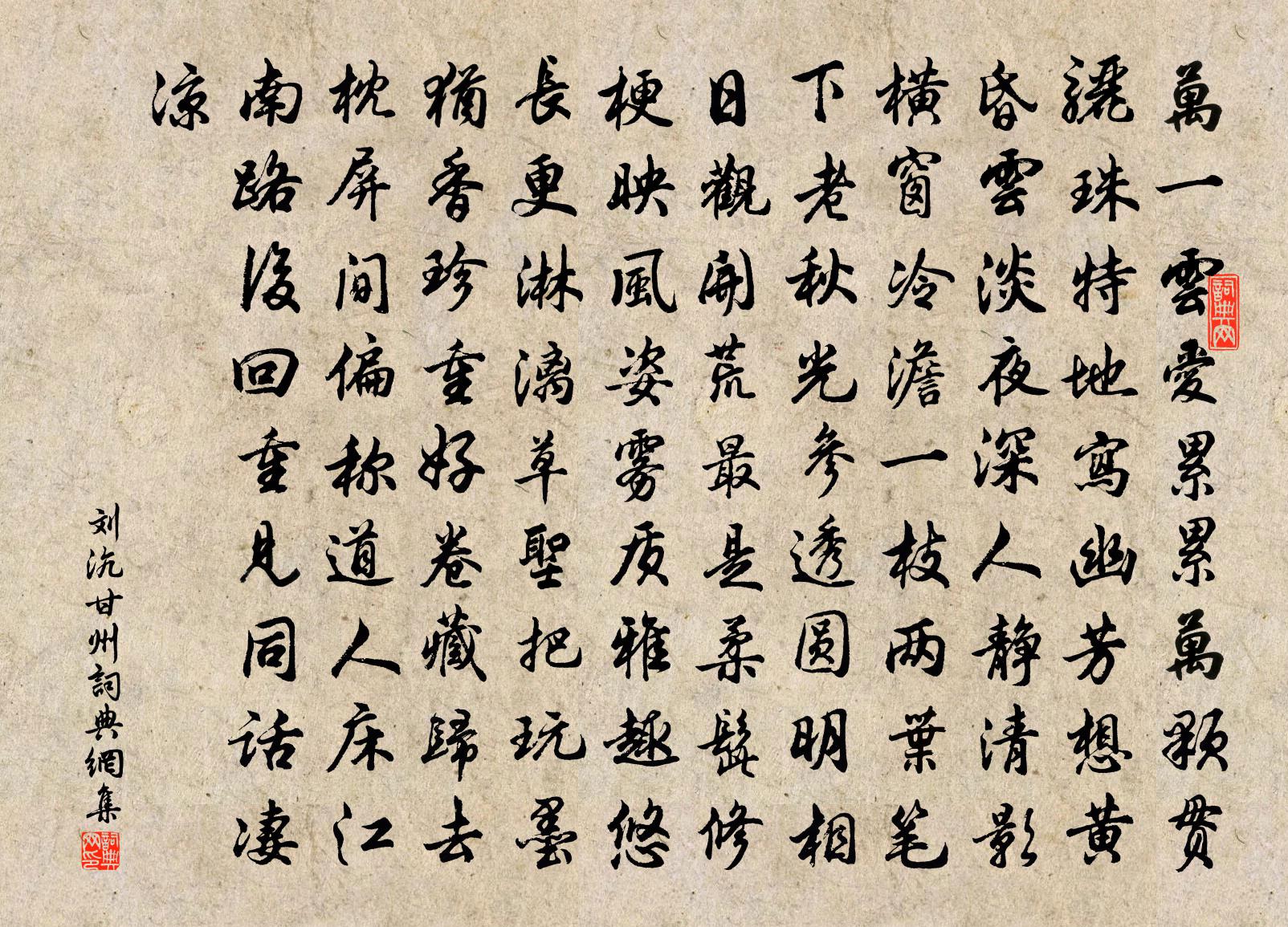 詩詞名句歷史字典書法欣賞書法字典國語詞典說文解字康熙字典古漢語字典標 題 作 者 詩 句 甘州作者:劉沆 朝代:宋代甘州原文萬一雲愛累累、萬顆貫驪珠,特地寫幽芳。想黃昏雲淡,夜深人靜,清影橫窗。冷澹一枝兩葉,筆下老秋光。參透圓明相,日觀開荒。最是柔髭修梗,映風姿霧質,雅趣悠長。更淋漓草聖,把玩墨猶香。珍重好、卷藏歸去,枕屏間、偏稱道人床。江南路,後回重見,同話淒涼。詩詞問答問:甘州的作者是誰?答:劉沆問:甘州寫於哪個朝代?答:宋代劉沆甘州書法欣賞甘州書法作品詩詞推薦此君室方蒙仲〔宋代〕為嫌太孤高,邂逅松梅友。忽與竹同評,是遇知音不。頌古十五首釋慧遠〔宋代〕見處孤危立處高,急如石火利如刀。到家問路家何在,掀倒棋盤脫布袍。西山葉適〔宋代〕對面吳橋港,西山第一家。有林皆橘樹,無水不荷花。竹下晴垂釣,松間雨試茶。更瞻東掛彩,空翠雜朝霞。移家謝趙再可章甫〔宋代〕病眼不禁黃土眯,塵纓屢費滄浪水。曉窗笑語鏡中人,但可置之岩穴里。縣官有田容我耕,收身已是太遲生。醉眠登聖善寺閣望龍門成崿〔唐代〕高閣聊登望,遙分禹鑿門。剎連多寶塔,樹滿給孤園。香境超三界,清流振陸渾。報慈弘孝理,行道得真源。空淨念奴嬌(中秋後一夕泊舟城外)劉一止〔宋代〕水煙收盡,望汀萍千頃,銀光如冪。霜鏡無痕清夜久,惟有驚魚跳出。月在杯中,我疑天賜,歡飲仍如璧。姮娥應南鄉子劉秉忠〔元代〕憔悴寄西州。賦得登樓懶上樓。魂夢不知關塞遠,悠悠。疏雨梧桐客里秋。往事起新愁。九曲迴腸不自由。見說世游黃山石待問〔宋代〕軒皇曾把浮丘袂,駐蹕茲山遂得名。迤邐乍登隨步勝,巍峨一上覺身輕。煙雲日變百千態,猿鶴時聞三兩聲。截斷惜紅衣張炎〔宋代〕兩翦秋痕,平分水影,炯然冰潔。未識新愁,眉心倩人貼。無端醉里,通一笑、柔花盈睫。痴絕。不解送情,倚銀晚春客愁五絕方回〔宋代〕想歸歸未得,悔醉醉還頻。不料湓江上,題詩送晚春。和之美舟行雜詩八首舟中夜坐司馬光〔宋代〕風柳動蕭疏,寒星浸寥落。中宵四寂然,時有游魚躍。江沙落席帆,岸柳縈單舸。小市遠微茫,簇水初燈火。步過縣南長橋游南山普寧寺山高處有塔院及小陸游〔宋代〕偶扶藤杖過南津,野寺長橋發興新。暫就清溪照須鬢,不妨翠霧濕衣巾。山縈細棧疑無路,樹落崩崖欲壓人。朝暮皇孫壽詩二首陳造〔宋代〕寶祚煌煌羨帝祺,天潢餘潤到孫枝。壽星良月占重見,振古熙朝此一時。椽筆紀祥芳草頌,龍樓開笑正含飴。蘿圖忘機台郭印〔宋代〕物物皆有機,此發彼先知。試看弋釣子,魚入鳥高飛。游陽洞天林尚仁〔宋代〕每個虛亭坐片時,旋尋古蹟上岩梯。石含秋色苔痕老,洞接雲天樹影低。樵客出林驚虎嘯,道人臨水聽猿啼。吟邊光華亭魏伯恂〔宋代〕亭高爽塏聳牙檐,萬種森羅共一川。坐使江山歸舊觀,欣年童稚望郵船。柳煙烘日塵迷渚,麥浪降風翠拍天。民物阮郎歸張掄〔宋代〕金烏玉兔最無情。驅馳不暫停。春光才去又朱明。年華只暗驚。須省悟,莫勞神。朱顏不再新。滅除妄想養天真。侍宴安樂公主新宅應制李適適〔唐代〕銀河半倚鳳凰台,玉酒相傳鸚鵡杯。若見君平須借問,仙槎一去幾時來。偶成曹彥約〔宋代〕可惜有生都袞袞,如何終日只紛紛。滿前妙景無人識,到處清音獨我聞。水調歌頭林淳〔宋代〕瀟灑東湖上,夜雨洗清秋。朝來塵霽,凝望千里興悠悠。山色揉藍深染,波影青銅新鑄,□冷翠光浮。蓑笠真吾事名句推薦天朗氣清,惠風和暢王羲之《蘭亭集序 / 蘭亭序》 恨君卻似江樓月,暫滿還虧,暫滿還虧,待得團圓是幾時?呂本中《採桑子·恨君不似江樓月》 騎牛遠遠過前村,短笛橫吹隔隴聞。黃庭堅《牧童詩》 客思似楊柳,春風千萬條。王安石《壬辰寒食》 記得那年花下,深夜,初識謝娘時。韋莊《荷葉杯·記得那年花下》 照花前後鏡,花面交相映。溫庭筠《菩薩蠻·小山重疊金明滅》 同欲者相憎,同憂者相親。劉向《戰國策·中山·犀首立五王》 春雨斷橋人不度,小舟撐出柳陰來。徐俯《春遊湖》 凡彼禍難也,先者恆凶,後者恆吉。佚名《黃帝四經·十大經·雌雄節》 晝出耘田夜績麻,村莊兒女各當家。范成大《夏日田園雜興·其七》