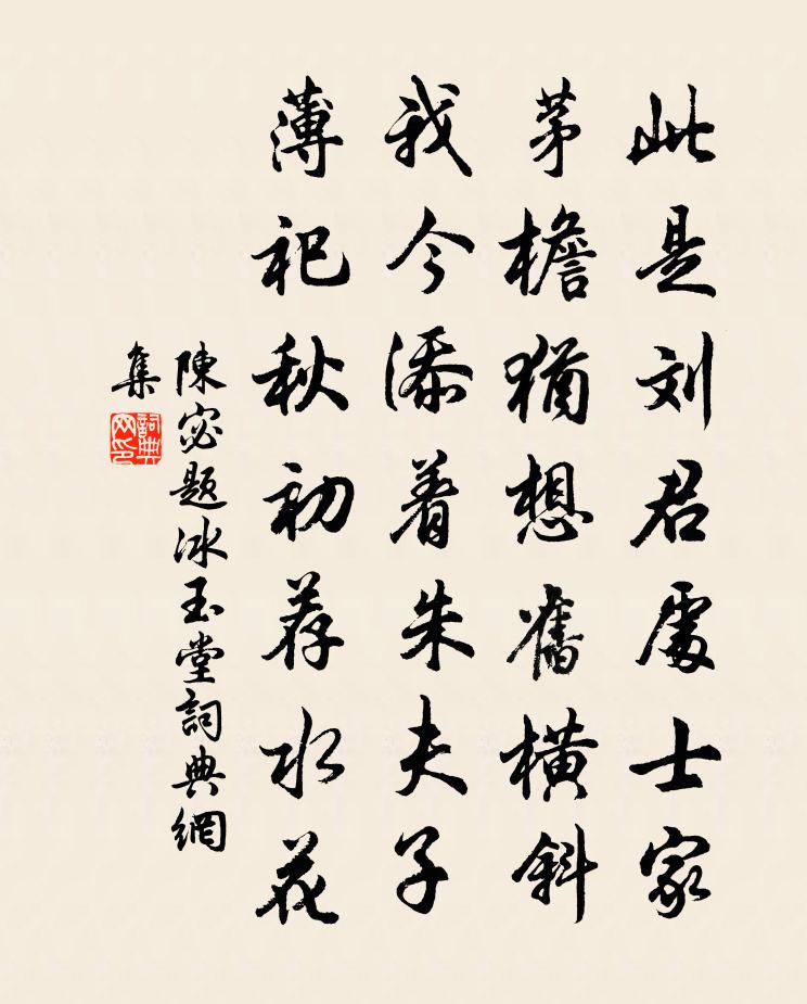 詩詞名句歷史字典書法欣賞書法字典國語詞典說文解字康熙字典古漢語字典標 題 作 者 詩 句 題冰玉堂作者:陳宓 朝代:宋代題冰玉堂原文此是劉君處士家,茅檐猶想舊橫斜。我今添著朱夫子,薄祀秋初薦水花。詩詞問答問:題冰玉堂的作者是誰?答:陳宓問:題冰玉堂寫於哪個朝代?答:宋代陳宓題冰玉堂書法欣賞題冰玉堂書法作品詩詞推薦偈頌二百零五首釋正覺〔宋代〕檐頭雨滴聲,問你要惺惺。直下成己事,途中作主盟。剎剎見佛,塵塵出經。擘開華岳連天色,放出黃河到海聲。清心鏡 戒華麗馬鈺〔元代〕出家兒,聽仔細。居止慎勿,修來壯麗。要創置、急急修真,認氣神宗祖。鍊汞鉛,調龍虎。木金間隔,逗流子午莫鋣關陶弼〔宋代〕三任邊州六往還,此時才入莫鋣關。訪僧莫道無閒事,手指青天口說山。五龍灣陳岩〔宋代〕石骨分開四角稜,日華磨透鏡光明。水流圓折仍方折,忽作鏗然戛玉聲。採桑子·殘霞夕照西湖好歐陽修〔宋代〕殘霞夕照西湖好,花塢苹汀,十頃波平,野岸無人舟自橫。 西南月上浮雲散,軒檻涼生。蓮芰香清。水面風來酒郊廟歌辭。武后崇先廟樂章(載《本集》)武則天〔唐代〕先德謙撝冠昔,嚴規節素超今。奉國忠誠每竭,承家至孝純深。追崇懼乖尊意,顯號恐玷徽音。既迫王公屢請,方散策釋紹嵩〔宋代〕江上雲亭霽景鮮,畫屏展盡一山川。遲遲欲去猶回首,目盡孤煙白鳥邊。寄虛齋趙侍郎戴復古〔宋代〕老眼開還闔,愁懷醉不醒。乾坤多變故,人物曉天星。藥石匡時切,蓍龜見事靈。得公十數輩,亦足壯朝廷。雜憶五首元稹〔唐代〕今年寒食月無光,夜色才侵已 * 。憶得雙文通內里,玉櫳深處暗聞香。花籠微月竹籠煙,百尺絲繩拂地懸。憶得盤圃張伯誠餉柑艾性夫〔宋代〕髯奚叩門踏枯葉,手持子敬相問帖。筠籃包送洞庭秋,照眼錯落黃金毬。含漿似注甘露缽,好與文園止消渴。問渠論詩三十首·十三元好問〔金代〕萬古文章有坦途,縱橫誰似玉川盧? 真書不入今人眼,兒輩從教鬼畫符。秋陰陸游〔宋代〕陂澤秋容淡,郊原曉氣清。雨來鳩有語,社近燕無情。拄杖扶腰痛,漁舟照眼明。苦吟緣病輟,隨意或詩成。舟中偶成何應龍〔宋代〕黃帽招呼急下船,天明僅可過涵山。朦朦一枕梅花夢,猶在寒窗紙帳間。詠史下高堂隆陳普〔宋代〕負土衣冠亂滿園,不知曹德是軒轅。土山白盡忠臣發,何似初來莫妄言。九日觀萬堂小酌懷正仲及梅所鍊師舒岳祥〔宋代〕極目冥鴻顥氣初,人生快意食鱸魚。剪來萸菊觸新酒,麾去蚊蠅府舊書。騷雅劉郎今健否,清修周老近何如。篆畦梅仙山劉邊〔宋代〕已是吳門變姓名,後來誰更識先生。一杯漢土丹墟在,萬古閩山劍氣橫。步入白雲秋石瘦,坐分黃葉午風清。逃奴寄連元禮屯田員外宋祁〔宋代〕憶共西州把酒卮,酒酣風味未全衰。人驚李郭同舟日,句索羊何共和時。省帳飄香君覲早,篋書騰謗我歸遲。他年除夜雪陸游〔宋代〕只怪重衾不禦寒,起看急雪玉花乾。遲明欲謁虛皇殿,廄馬蒙氈立夜闌。夏日寇準〔宋代〕離心杳杳思遲遲,深院無人柳自垂。日暮長廊聞燕語,輕寒微雨麥秋時。溪上醉吟陸游〔宋代〕行行不知溪路深,但怪素月生遙岑。不辭醉袖拂花絮,與子更醉青蘿陰。名句推薦行人夜宿金陵渚,試聽沙邊有雁聲。李頎《送劉昱》 世間無限丹青手,一片傷心畫不成。高蟾《金陵晚望》 日出入安窮?時世不與人同。佚名《日出入》 君子不器。孔子弟子《論語·為政篇》 中山孺子倚新妝,鄭女燕姬獨擅場。李夢陽《汴京元夕》 獵人箭底求傷雁,釣戶竿頭乞活魚。王建《寄舊山僧》 位卑未敢忘憂國,事定猶須待闔棺。陸游《病起書懷》 不信妾斷腸,歸來看取明鏡前。李白《長相思·其二》 南朝四百八十寺,多少樓台煙雨中。杜牧《江南春》 兩人對酌山花開,一杯一杯復一杯。李白《山中與幽人對酌》