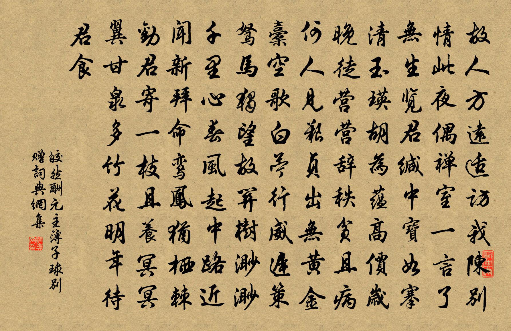 詩詞名句歷史字典書法欣賞書法字典國語詞典說文解字康熙字典古漢語字典標 題 作 者 詩 句 酬元主簿子球別贈作者:皎然 朝代:唐代酬元主簿子球別贈原文故人方遠適,訪我陳別情。此夜偶禪室,一言了無生。覽君緘中寶,如搴清玉瑛。胡為蘊高價,歲晚徒營營。辭秩貧且病,何人見艱貞。出無黃金橐,空歌白薴行。威遲策駑馬,獨望故關樹。渺渺千里心,春風起中路。近聞新拜命,鸞鳳猶棲棘。勸君寄一枝,且養冥冥翼。甘泉多竹花,明年待君食。詩詞問答問:酬元主簿子球別贈的作者是誰?答:皎然問:酬元主簿子球別贈寫於哪個朝代?答:唐代問:酬元主簿子球別贈是什麼體裁?答:五古皎然酬元主簿子球別贈書法欣賞酬元主簿子球別贈書法作品注釋全唐詩:卷818-5詩詞推薦又賦文天祥〔宋代〕一病忽兩月,蓬頭夏涉秋。形羸心自壯,手弱筆仍遒。昨夜燈如喜,今宵蝶莫愁。問誰驅五瘧,正與五窮謀。琴隱巒〔唐代〕七條絲上寄深意,澗水松風生十指。自乃知音猶尚稀,欲教更入何人耳。浣溪沙佚名〔宋代〕雨氣兼香泛芰荷。回舟冒雨懶披蓑。夜闌風靜水無波。白酒追歡常恨少,青山入望豈嫌多。人間榮辱盡從他。頌古二十七首釋雲賁〔宋代〕白牯問狸奴,虛空酬萬象。電激不停蹤,谷虛誰答響。啐兮啄兮,清機歷掌。回頭{左車右度}轢范春時,舌上葛賀新郎張輯〔宋代〕鵲喜花間曉。惜凝香、低將簾卷,海棠開早。前度登樓清嘯月,吹入春風不老。後五日、花朝方到。趁舞羅衣花訊赴試途中有感李鴻章〔清代〕侷促真如虱處褌,思乘春浪到龍門。許多同輩矜科第,已過年華付水源。兩字功名添熱血,半生知已有殊恩。壯懷周畏知司直得湖南帥,屬過吳門,復用己丑年范成大〔宋代〕邂逅婆娑失少年,劇談抵掌尚超然。君猶拄笏看山去,我且披蓑聽雨眠。京洛分襟疑後會,江吳把酒悟前緣。暫來投介庵先生並寄廬陵周侍郎四首趙蕃〔宋代〕粗識詩中趣,翻憐筆下難。中流疑失檝,無舉慮摧翰。起我七十病,蘄公九轉丹。韓家非所敢,曾未到郊寒。黃檗和尚贊釋師觀〔宋代〕一棒一條痕,一摑一掌血。 * 能活人,不傳之妙訣。句程師孟〔宋代〕珊瑚花發客疑真。朝中措 梅陸游〔宋代〕幽姿不入少年場,無語只淒涼。一個飄零身世,十分冷淡心腸。江頭月底,新詩舊夢,孤恨清香。任是春風不管,同年譚綜掾江陵宋祁〔宋代〕鄉樹湘雲外,行轅楚塞東。不辭淹拔萃,聊欲辨無同。暝紫生寒岫,疏丹點暮楓。登樓有歸訊,為附北歸鴻。送知殿釋慧空〔宋代〕人人盡有光明,只恐點時不到。試攜投子油瓶,一一與伊按過。齊優開籠飛去所獻楚王鵠崔樞〔唐代〕受命籠齊鵠,交歡獻楚王。惠心先巧辯,戢羽見迴翔。意適清風遠,憂除白日長。度雲搖舊影,過樹閱新芳。直取鵲橋仙·月朧星淡謝薖〔宋代〕月朧星淡,南飛烏鵲,暗數秋期天上。錦樓不到野人家,但門外、清流疊嶂。一杯相屬,佳人何在,不見繞粱清唱贈揚元鼎陳藻〔宋代〕老泉早別閩中去,君在姑蘇台下生。每見鄉閭新到客,便尋香火舊來情。百年念祖心田孝,一種論文眼力明。歲晚對酒勸令公開春遊宴白居易〔唐代〕時泰歲豐無事日,功成名遂自由身。前頭更有忘憂日,向上應無快活人。自去年來多事故,從今日去少交親。宜須理菊趙蕃〔宋代〕攜鉏乘夏雨,分菊待秋風。幽事常關我,閒居不負公。苔深連竹地,籬破接蘭叢。更約兒童輩,須勤灌溉功。和楊季恪景疏希白二首吳芾〔宋代〕二疏高躅聳簪紳,寂寞無人繼後塵。一代風流雖已遠,千年我德鎮如新。幸拋印綬歸空谷,得與湖山作好春。若較梁州對雨,懷麴二秀才,便呈麴大判官,時疾岑參〔唐代〕江上雲氣黑,山旱山昨夜雷。水惡平明飛,雨從嶓冢來。濛濛隨風過,蕭颯鳴庭槐。隔簾濕衣巾,當暑涼幽齋。麴名句推薦天下大勢,分久必合,合久必分。羅貫中《三國演義·第一回》 北風其涼,雨雪其雱。佚名《北風》 江上晚來堪畫處,釣魚人一蓑歸去。馬致遠《壽陽曲·江天暮雪》 手弄生綃白團扇,扇手一時似玉。蘇軾《賀新郎·夏景》 送子軍中飲,家書醉里題。岑參《磧西頭送李判官入京》 淡淡橫朝煙,脈脈深秋思。劉道著《湘江秋曉》 句有可削,足見其疏;字不得減,乃知其密。劉勰《文心雕龍·熔裁》 山荒聊可田,錢鎛還易辦。王守仁《謫居糧絕請學於農將田南山詠言寄懷》 興盡晚回舟,誤入藕花深處。李清照《如夢令·常記溪亭日暮》 觀人以言,美於黼黻、文章荀子《荀子·非相》
