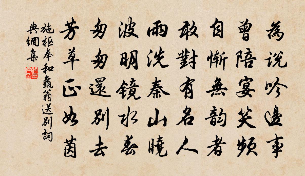 詩詞名句歷史字典書法欣賞書法字典國語詞典說文解字康熙字典古漢語字典標 題 作 者 詩 句 奉和龜翁送別作者:施樞 朝代:宋代奉和龜翁送別原文為說吟邊事,曾陪宴笑頻。自慚無韻者,敢對有名人。雨洗秦山曉,波明鏡水春。匆匆還別去,芳草正如茵。詩詞問答問:奉和龜翁送別的作者是誰?答:施樞問:奉和龜翁送別寫於哪個朝代?答:宋代施樞奉和龜翁送別書法欣賞奉和龜翁送別書法作品詩詞推薦秋來瘦甚而益健戲作陸游〔宋代〕莫笑形羸不自支,清虛正與老人宜。矛頭淅米誰能食,甑里生塵卻自奇。獨釣又逢秋晚後,安眠常到日高時。邇來殘句:磊落金盤薦糟蟹陳師道〔宋代〕磊落金盤薦糟蟹,纖柔玉指破霜柑。頌古一百首釋智愚〔宋代〕昨日過竹院西字,鄰家稚子隔溪啼。山寒水肅半黃落,無數歸鴉卜樹棲。松花江捕魚乾隆〔清代〕松江網魚亦可觀,潭情潦盡澄秋煙,虞人技癢欲效悃,我亦因之一放船。施罟旋近岸,清波可數鰷鱸鰱,就中鱏鰉句諶祜〔宋代〕天開漢統王巴蜀,雲從秦繇起沛豐。陽朔鑒山寺劉坦齋〔宋代〕鑒山最有登臨勝,門巷縈迴知幾重。此日樓頭瞻御墨,何時天上覩飛龍。關河痛隔魚紋斷,臣子遙申虎拜恭。欲托游洞霄嚴嘉〔宋代〕帝子 * 上瑤闕,靈妃跨鳳音塵絕。行雲山水跡依然,留伴九峰秋夜月。閬苑宮前見玉真,許傳訊息到金庭。瓊姿寒食夜偶題宋祁〔宋代〕前塵露氣壓輕埃,風漾花陰聚復開。苦恨浮雲心不淨,月中時汙太清來。詠二十四氣詩·春分二元稹〔唐代〕二氣莫交爭,春分雨處行。雨來看電影,雲過聽雷聲。山色連天碧,林花向日明。梁間玄鳥語,欲似解人情。永定寺喜辟強夜至韋應物〔唐代〕子有新歲慶,獨此苦寒歸。夜叩竹林寺,山行雪滿衣。深爐正燃火,空齋共掩扉。還將一尊對,無言百事違。他山之石袁燮〔宋代〕他山之石能攻玉,詩人此意宜三復。莫嫌山骨太堅峭,足使國珍充韞匱。磨礱砥礪功日新,圭璧琮璜光可燭。人生讀圓覺經辛棄疾〔宋代〕二十五輪清淨觀,上中下期春夏齋。本來欲造空虛地,那得許多纏繞來。古釵嘆張籍〔唐代〕古釵墮井無顏色,百尺泥中今復得。鳳凰宛轉有古儀,欲為首飾不稱時。女伴傳看不知主,羅袖拂拭生光輝。蘭膏送慶顏禪者釋重顯〔宋代〕岩桂風清香露滴,定起高秋映虛碧。斷雲不是歸帝鄉,飛落人間有誰識。夜坐聞窗下水聲韓元吉〔宋代〕書史懸知伴此生,敢求身外百年名。青燈又暗吹窗雨,流水長聞入夜聲。玩世久忘榮辱累,定交諸盡死生情。翛然京居秋感五絕句晁說之〔宋代〕江上高人未肯來,京華秋鬢獨徘徊。饒渠看取潮頭月,莫戀林香待放梅。秋胡行徐集孫〔宋代〕五年行邁兮歸遲遲,採桑山陰兮奉親慈。冰霜自潔兮清節持,有客遺金兮志不移。橐有金兮盍專為母馳,心悅桑女雜興利登〔宋代〕松柏托茂林,高不尋太至。寸喬附太山,未長已千里。置身患不高,餘事安足擬。游必蓬萊游,棲必昆倉棲。仙遊出泉水驛林逋〔宋代〕曉城寒水共蕭蕭,濕碧吹青路一條。煙靄濃間出山驛,林蘿深里過溪橋。閒情謾會吟兼畫,隱事猶輸釣與樵。多謝禪人並化主寫真求贊釋正覺〔宋代〕拄杖倚床,默而成章。夜月通犀角,秋空沒雁行。清寫芭蕉雪,秀盛芙蓉霜。青原價問盧陵米,會有知音句廝當。名句推薦孤花片葉,斷送清秋節。納蘭性德《清平樂·孤花片葉》 人過留名,雁過留聲。佚名《增廣賢文·下集》 洞房昨夜停紅燭,待曉堂前拜舅姑。朱慶餘《近試上張籍水部 / 近試上張水部 / 閨意獻張水部》 故大人之務,將在於眾賢而已。墨子《墨子·08章 尚賢(上)》 垂釣板橋東,雪壓蓑衣冷。釋敬安《題寒江釣雪圖》 少壯從戎馬上飛,雪山童子未緇衣劉商《贈頭陀師》 江水三千里,家書十五行。袁凱《京師得家書》 千年史冊恥無名,一片丹心報天子。陸游《金錯刀行》 郎騎竹馬來,繞床弄青梅。李白《長干行二首》 兒童強不睡,相守夜歡嘩。蘇軾《守歲》