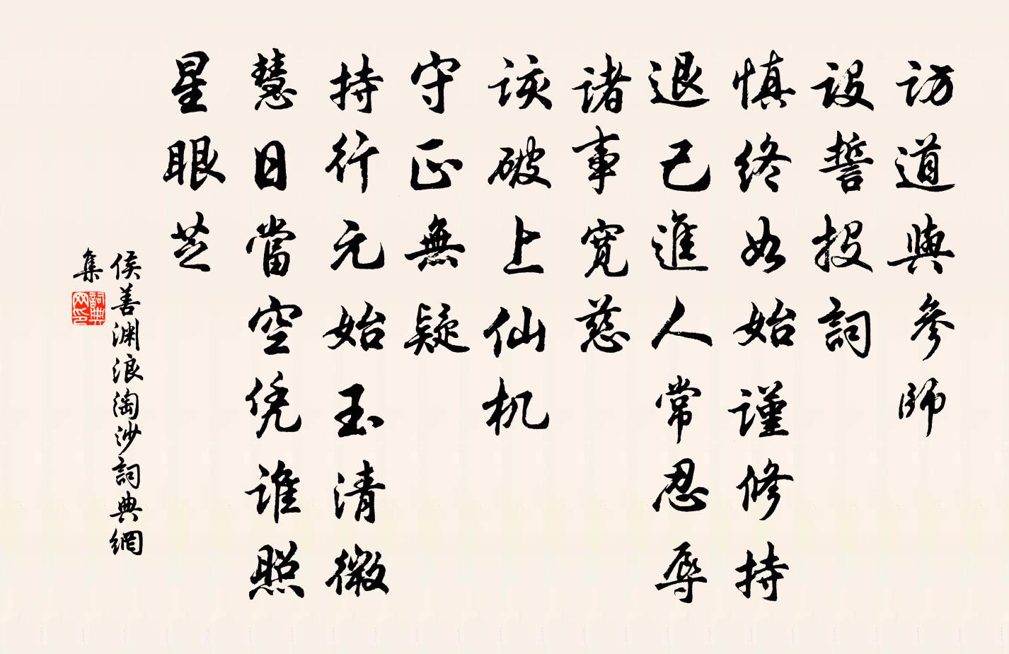 詩詞名句歷史字典書法欣賞書法字典國語詞典說文解字康熙字典古漢語字典標 題 作 者 詩 句 浪淘沙作者:侯善淵 朝代:元代浪淘沙原文訪道與參師。設誓投詞。慎終如始謹修持。退己進人常忍辱,諸事寬慈。該破上仙機。守正無疑。持行元始玉清微。慧日當空憑誰照,星眼芝詩詞問答問:浪淘沙的作者是誰?答:侯善淵問:浪淘沙寫於哪個朝代?答:元代問:浪淘沙是什麼體裁?答:詞侯善淵浪淘沙書法欣賞浪淘沙書法作品詩詞推薦游譚田寺蔣金部〔宋代〕我愛譚田寺,短橋橫碧波。數椽松竹里,靜處不須多。定風波·為有書來與我莊棫〔清代〕為有書來與我期,便從蘭杜惹相思。昨夜蝶衣剛入夢,珍重,東風要到送春時。 三月正當三十日,占得,春光望江南張繼先〔宋代〕西源好,幽徑不成斜。山谷隱連無改色,池塘空靜默無瑕。人釣水之涯。仙舫小,人慾盼君家。歸棹日回如覽鏡,偈頌一百二十三首釋祖欽〔宋代〕雲影重重,山色蒙蒙。天晴日出,柳綠花紅。雲門大師颺下乾屎橛,進得清香遍地,散為萬物春風。寄遠其二李白〔唐代〕青樓何所在。乃在碧雲中。寶鏡掛秋水。羅衣輕春風。新妝坐落日。悵望金屏空。念此送短書。 願同雙飛鴻。 馬司戶所作墨梅並示佳作因次韻蔡沈〔宋代〕誰把霜毫歸庾嶺,王孫去後久寥寥。長時月夜橫疏影,鎮日春風上素綃。可笑兒童尋剪摘,如知蜂蝶亦邀招。人心足姜句蘇泂〔宋代〕那知身百歲,未辦屋三間。見客慵開口,逢僧託買山。喜無他志願,幸不礙清閒。社燕秋鴻里,人生各有還。相和歌辭鳳笙曲沉佺期〔唐代〕憶昔王子晉,鳳笙游雲空。揮手弄白日,安能戀青宮。豈無嬋娟子,結念羅帳中。憐壽不貴色,身世兩無窮。鷓鴣天趙長卿〔宋代〕落魄東吳二十春。風流詩句得清新。今年卻恨花星照,再見溫卿與遠真。分楚佩,染巫雲。赤繩結得短花茵。若非留別武陵袁丞王昌齡〔唐代〕皇恩暫遷謫,待罪逢知己。從此武陵溪,孤舟二千里。桃花遺古岸,金澗流春水。誰識馬將軍,忠貞抱生死。溪山堂玩月姚勉〔宋代〕前山杳靄翠煙凝,幾點疎星隔岸燈。不是飛來千里月,如何照徹一壺冰。天開圖畫無窮趣,人在林巒最上層。動智題山雲海月樓熊禾〔宋代〕壺山一片雲,滄海一輪月。仁人典刑靜,志士胸次闊。我來登斯樓,撫景亦奇絕。一天任舒捲,萬古看出沒。吟情和僧長吉湖居五題其二水月范仲淹〔宋代〕千尋月腳寒,湖影淨於天。忽如常娥宮,俯仰見嬋娟。更約中秋夕,長津無寸煙。城北青蓮院方丈壁間有畫燕子者過客多題詩予陸游〔宋代〕一雙掠水燕來初,萬點飛花社雨余。辛苦成巢君勿笑,從來吾亦愛吾廬。省試夏日可畏(一作張籍詩)丘為〔唐代〕赫赫溫風扇,炎炎夏日徂。火威馳迥野,畏景爍遙途。勢矯翔陽翰,功分造化爐。禁城千品燭,黃道一輪孤。落照呈徑畈徐左司劉黻〔宋代〕五載相違一日過,巷無車跡有樵歌。因嗟世上深危證,合住山中養太和。蔓草不知春事去,梅花曾識歲寒多。予今偈頌一百二十三首釋祖欽〔宋代〕坐本無拘,何必曰放。動靜但見一如,日用自然虛曠。鵲噪鴉鳴,水綠山青。騰騰任運不知名,也是錯認定盤星。夜雨陸游〔宋代〕夜雨有殘滴,秋碪無絕聲。得詩旋已忘,覓睡固難成。壯志悲垂老,歸耕願太平。發春才屬爾,歲事又崢嶸。讀樂天詩戲效其體周必大〔宋代〕側足二三臣,平頭六十人。胸中冰與炭,鏡里雪兼銀。豈有花經眼,何嘗酒入唇。勞生成底事,胡不早收身。元祐祀九宮貴神二首佚名〔宋代〕上天貴神,九宮設位,功徳及物。乃秩明祀。望拜紫壇,赫然靈氣。奠玉牙幣,歆之無愧。名句推薦貨有高低三等價,客無遠近一般看吳承恩《西遊記·第八十四回》 三軍可奪帥也,匹夫不可奪志也。佚名《論語十二章》 騎牛遠遠過前村,短笛橫吹隔隴聞。黃庭堅《牧童詩》 燕子不知人去也,飛認闌乾。韓疁《浪淘沙·莫上玉樓看》 光陰似箭,日月如梭吳承恩《西遊記·第八回》 官不得其才,比於畫地作餅,不可食也。吳兢《貞觀政要·卷三·論擇官》 浮雲一別後,流水十年間。韋應物《淮上喜會梁川故人 / 淮上喜會梁州故人》 為淵驅魚者,獺也;為叢驅爵者,鸇也孟子《孟子·離婁章句上·第九節》 得成比目何辭死,願作鴛鴦不羨仙。盧照鄰《長安古意》 學而時習之,不亦說乎?佚名《論語十則》