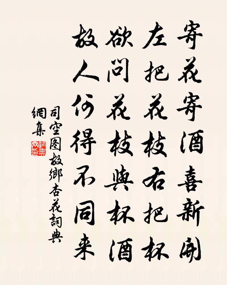 詩詞名句歷史字典書法欣賞書法字典國語詞典說文解字康熙字典古漢語字典標 題 作 者 詩 句 故鄉杏花作者:司空圖 朝代:唐代故鄉杏花原文寄花寄酒喜新開,左把花枝右把杯。欲問花枝與杯酒,故人何得不同來?詩詞問答問:故鄉杏花的作者是誰?答:司空圖問:故鄉杏花寫於哪個朝代?答:唐代問:故鄉杏花是什麼體裁?答:七絕問:司空圖的名句有哪些?答:司空圖名句大全司空圖故鄉杏花書法欣賞故鄉杏花書法作品注釋寄情於花,寄情於酒欣喜與花的盛開,左手拿著花枝右手拿著酒杯。想問問花枝和酒杯,老朋友為什麼不能一起來呢?標籤:友情詩詞推薦下途歸石門舊居李白〔唐代〕山高,越水清,握手無言傷別情。將欲辭君掛帆去,離魂不散煙郊樹。此心郁悵誰能論,有愧叨承國士恩。雲物共尋西山隱者不遇 / 山行尋隱者不遇丘為〔唐代〕絕頂一茅茨,直上三十里。扣關無僮僕,窺室唯案幾。若非巾柴車,應是釣秋水。差池不相見,黽勉空仰止。草色夏日南亭懷辛大孟浩然〔唐代〕山光忽西落,池月漸東上。散發乘夜涼,開軒臥閒敞。荷風送香氣,竹露滴消響。欲取鳴琴彈,慨無知音賞。感此夢武昌揭傒斯〔元代〕黃鶴樓前鸚鵡洲,夢中渾似昔時游。蒼山斜入三湘路,落日平鋪七澤流。鼓角沈雄遙動地,帆檣高下亂維舟。故人衡陽與夢得分路贈別柳宗元〔唐代〕十年憔悴到秦京,誰料翻為嶺外行。伏波故道風煙在,翁仲遺墟草樹平。直以慵疏招物議,休將文字占時名。今朝聞樂天授江州司馬元稹〔唐代〕殘燈無焰影幢幢,此夕聞君謫九江。垂死病中驚坐起,暗風吹雨入寒窗。三江小渡楊萬里〔宋代〕溪水將橋不復回,小舟猶倚短篙開。交情得似山溪渡,不管風波去又來。琴調相思引·送范殿監賀鑄〔宋代〕終日懷歸翻送客,春風祖席南城陌。便莫惜離觴頻卷白。動管色,催行色;動管色,催行色。何處投鞍風雨夕?臨淮上喜會梁川故人 / 淮上喜會梁州故人韋應物〔唐代〕江漢曾為客,相逢每醉還。浮雲一別後,流水十年間。歡笑情如舊,蕭疏鬢已斑。何因北歸去,淮上對秋山。丹陽送韋參軍嚴維〔唐代〕丹陽郭里送行舟,一別心知兩地秋。日晚江南望江北,寒鴉飛盡水悠悠。行路難·縛虎手賀鑄〔宋代〕縛虎手。懸河口。車如雞棲馬如狗。白綸巾。撲黃塵。不知我輩,可是蓬蒿人。衰蘭送客鹹陽道。天若有情天亦老送綦毋潛落第還鄉 / 送別王維〔唐代〕新地無隱者,英靈盡來歸。遂令東山客,不得顧採薇。既至金門遠,孰雲吾道非?江淮度寒食,京洛縫春衣。置酒定風波·山路風來草木香辛棄疾〔宋代〕山路風來草木香。雨余涼意到胡床。泉石膏肓吾已甚。多病。提防風月費遍章。 孤負尋常山簡醉。獨自。故應知宣州九日聞崔四侍御與宇文太守游敬亭余時登響山不同此李白〔唐代〕九日茱萸熟,插鬢傷早白。登高望山海,滿目悲古昔。遠訪投沙人,因為逃名客。故交竟誰在,獨有崔亭伯。重陽鵲橋仙·七夕送陳令舉蘇軾〔宋代〕緱山仙子,高清雲渺,不學痴牛騃女。鳳簫聲斷月明中,舉手謝、時人慾去。客槎曾犯,銀河微浪,尚帶天風海雨謫仙怨·晴川落日初低劉長卿〔唐代〕晴川落日初低,惆悵孤舟解攜。鳥向平蕪遠近,人隨流水東西。白雲千里萬里,明月前溪後溪。獨恨長沙謫去,江浪淘沙歐陽修〔宋代〕把酒祝東風,且共從容。垂楊紫陌洛城東。總是當時攜手處,游遍芳叢。聚散苦匆匆,此恨無窮。今年花勝去年紅登單父陶少府半月台李白〔唐代〕陶公有逸興,不與常人俱。築台像半月,回向高城隅。置酒望白雲,商飆起寒梧。秋山入遠海,桑柘羅平蕪。水色十二月十九日夜中發鄂渚曉泊漢陽親舊攜酒追送聊為短句黃庭堅〔宋代〕接淅報官府,敢違王事程。宵征江夏縣,睡起漢陽城。鄰里煩追送,杯盤瀉濁清。秪應瘴鄉老,難答故人情。送魏二王昌齡〔唐代〕醉別江樓橘柚香,江風引雨入舟涼。憶君遙在瀟湘月,愁聽清猿夢裡長。名句推薦為誰醉倒為誰醒,到今猶恨輕離別。呂本中《踏莎行·雪似梅花》 誰料同心結不成,翻就相思結。夏完淳《卜運算元·秋色到空閨》 秋草六朝寒,花雨空壇。朱彝尊《賣花聲·雨花台》 江水三千里,家書十五行。袁凱《京師得家書》 美言可以市尊,美行可以加人。老子《老子·德經·第六十二章》 應酬都不暇,一嶺是梅花。張道洽《嶺梅》 花片片飛風弄蝶,柳陰陰下水平橋。張先《浣溪沙·樓倚春江百尺高》 泠泠七弦上,靜聽松風寒。劉長卿《聽彈琴》 相知無遠近,萬里尚為鄰。張九齡《送韋城李少府》 廉者憎貪,信者疾偽宋祁、歐陽修、范鎮、呂夏卿等《新唐書·列傳·卷三十二》