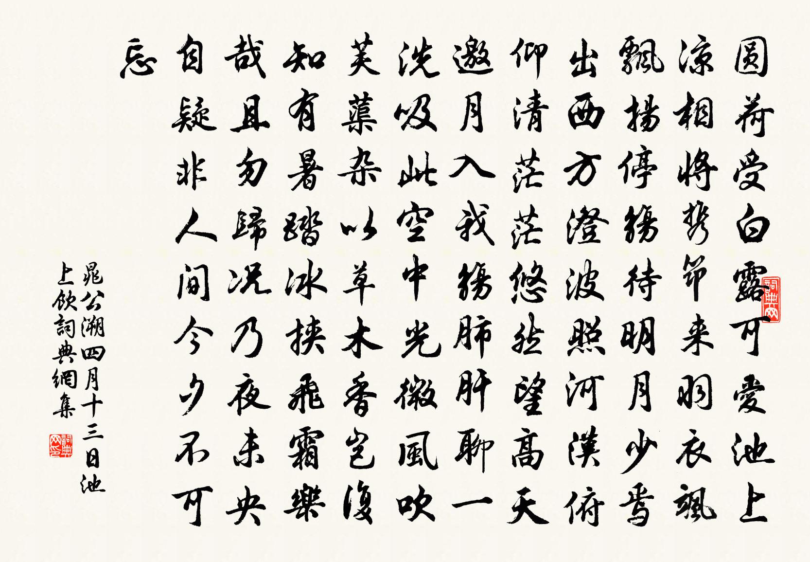 詩詞名句歷史字典書法欣賞書法字典國語詞典說文解字康熙字典古漢語字典標 題 作 者 詩 句 四月十三日池上飲作者:晁公溯 朝代:宋代四月十三日池上飲原文圓荷受白露,可愛池上涼。相將攜筇來,羽衣颯飄揚。停觴待明月,少焉出西方。澄波照河漢,俯仰清茫茫。悠然望高天,邀月入我觴。肺肝聊一洗,吸此空中光。微風吹芙蕖,雜以草木香。豈復知有暑,踏冰挾飛霜。樂哉且勿歸,況乃夜未央。自疑非人間,今夕不可忘。詩詞問答問:四月十三日池上飲的作者是誰?答:晁公溯問:四月十三日池上飲寫於哪個朝代?答:宋代晁公溯四月十三日池上飲書法欣賞四月十三日池上飲書法作品詩詞推薦頌證道歌證道歌釋印肅〔宋代〕六般神通空不空,眼耳鼻舌身意同。無皮鼓子教誰打,古今分付與雷公。慈恩寺南池秋荷詠韋應物〔唐代〕對殿含涼氣,裁規覆清沼。衰紅受露多,餘馥依人少。蕭蕭遠塵跡,颯颯凌秋曉。節謝客來稀,回塘方獨繞。真州元夕和韻二首李壁〔宋代〕璧月舒金波,流光入窗蓬。江水碧杳杳,淮山直叢叢。牢落亦清甘,繁華兒輩事。一褐擁春寒,倦撥青編睡。絳紗辟亂逢故人艾性夫〔宋代〕亂里相逢各自忙,少依松影話淒涼。古來尚有種桃處,今去當傳辟穀方。馬蹴黃塵遮日暗,鬼吹青燐隔林光。海田偈五首釋覺阿上〔宋代〕掃盡葛藤與知見,信手拈來全體現。腦後圓光徹太虛,千機萬機一時轉。宋頌九首湯湯石介〔宋代〕昔時蜀道,絕人來往。今蜀既平,王道蕩蕩。尉候一置,朝貢相望。巍巍皇祖,德聲遠暢。書懷送田二舍人自吏部郎中出典泰州王禹偁〔宋代〕共嘆蹉跎兩鬢蒼,立朝為郡是尋常。重歸謝客中書省,又送山濤吏部郎。三入承明身最忝,十年兄事分偏長。喜聞王龜齡輓詞楊萬里〔宋代〕佛以偏師勝,天能一手回。橫空立萬仞,不為作三魁。道大身無著,人亡世卻哀。溪梅那解事,寂寞為誰開?次韻中秋風雨中約客葉元老有詩魏了翁〔宋代〕長雨頑雲處處山,浹旬渾不露天慳。魚旟未光心如醉,鴻雁關情鬢欲斑。月體晦明猶偶爾,酒腸舒慘亦渾閒。只將六言山居釋紹曇〔宋代〕野菜花飛胡蝶,古藤枝掛清猿。閒倚柴門看倦,枕肱高臥雲根。送葉茂叔淮安教方回〔宋代〕為儒元匪易,入仕似無難。捷疾非科第,飛騰即教官。梁城依汴古,楚郡號淮安。台省多知己,書燈莫遣寒。因營張村蠻窩並書所見戴表元〔宋代〕頭白西來不買田,時時卻費買山錢。一丘一壑吾歸矣,待得田多是幾年。江州五詠其三庾樓蘇轍〔宋代〕元規情不薄,上客有殷生。夜半酒將罷,公來坐不驚。舞翻江月迥,談落麈毛輕。塵世風流盡,高樓空此名。漫述黃庚〔宋代〕逢人休要說公卿,老去無心慕寵榮。李不封侯劉不第,千年青史亦傳名。張思孺秘校輓詩二首文同〔宋代〕昔在天彭郡,僑居過一冬。感君常見訪,無日不相從。遠寺攜棋局,高亭把灑鍾。認知三載後,孤冢列新松。冬夜不寐朱淑真〔宋代〕推枕鴛幃不耐寒,起來霜月轉欄乾。悶懷脈脈與誰說,淚滴羅衣不忍看。點絳唇 謝萬仲理惠帛謝應芳〔元代〕彩翼雙鳧,寄來一幅天機錦。純綿絕品。將意何勤恁。歲晚空山,不怕冰霜凜。西風緊。便添袍*。被德吾無隱。念奴嬌(春夢)梁棟〔宋代〕一場春夢,待從頭、說與傍人聽著。罨畫溪山紅錦障,舞燕歌鶯台閣。碧海傾春,黃金買夜,猶道看承薄。雕香剪六日雲重有雪意獨酌陸游〔宋代〕遍游藪澤一漁舠,盡歷風霜只縕袍。天為念貧偏與健,人因見嬾誤稱高。地連海澨濤聲近,雲冒山椒雪意豪。偶得冰玉堂辭晁補之〔宋代〕論世以觀士兮,集羲以為詞。所非正而敢從兮,日可罣而東之。嗟若士之弗獲兮,羌何忿而負石。繄聖賢之出處兮名句推薦一葉度春風,芳芳自相接。蕭衍《芳樹》 大道之行也,天下為公。戴聖《禮記·禮運》 靡靡秋已夕,淒淒風露交。陶淵明《己酉歲九月九日》 絮影苹香,春在無人處周晉《點絳唇·訪牟存叟南漪釣隱》 撥雪尋春,燒燈續晝。毛滂《踏莎行·元夕》 涓流雖寡,浸成江河;爝火雖微,卒能燎野范曄《後漢書·列傳·酷吏列傳》 倉廩實,則知禮節;衣食足,則知榮辱管仲《管子·牧民》 寡助之至,親戚畔之;多助之至,天下順之。孟子《孟子·公孫丑章句下·第一節》 丁丁漏水夜何長,漫漫輕雲露月光。張仲素《秋夜曲》 男兒何不帶吳鉤,收取關山五十州。李賀《南園十三首·其五》