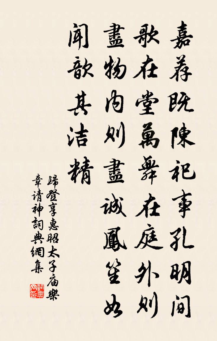 詩詞名句歷史字典書法欣賞書法字典國語詞典說文解字康熙字典古漢語字典標 題 作 者 詩 句 享惠昭太子廟樂章(請神)作者:歸登 朝代:唐代享惠昭太子廟樂章(請神)原文嘉薦既陳,祀事孔明。間歌在堂,萬舞在庭。 外則盡物,內則盡誠。鳳笙如聞,歆其潔精。詩詞問答問:享惠昭太子廟樂章(請神)的作者是誰?答:歸登問:享惠昭太子廟樂章(請神)寫於哪個朝代?答:唐代歸登享惠昭太子廟樂章(請神)書法欣賞享惠昭太子廟樂章(請神)書法作品詩詞推薦登羅浮山吳泳〔宋代〕玉蟾奔月灶爐乾,老鶴巢松殿宇寒。裡面看山山不見,不如只響外邊看。昔游詩 其三姜夔〔宋代〕九山如馬首,一一奔洞庭。小舟過其下,幸哉波浪平。大風忽怒起,我舟如葉輕。或升千丈坡,或落千丈坑。回望滿江紅(重九登增江鳳台望崔清獻故居)陳紀〔宋代〕鳳去台空,庭葉下、嫩寒初透。人世上、幾番風雨,幾番重九。列岫迢迢供遠目,晴空蕩蕩容長袖。把中年、懷抱東城送客馬上賀鑄〔宋代〕向午孤煙起客檣,一陂春水兩鴛鴦。漁童解唱滄浪曲,應笑塵埃馬上郎。示彌光禪人釋宗杲〔宋代〕龜毛牛得笑咍咍,一擊萬重關鎖開。慶快平生在今日,孰雲吉里賺吾來。過八疊山陳造〔宋代〕我從外朝來,嶮峭相連線。巉絕不可上,孰與西八疊。車匪毛羽去,我豈猿猱捷。一步九頓仆,陟起正岌頁。飛蘿酬盧汀諫議姚合〔唐代〕粟如流水帛如山,依念倉邊語笑間。篇什縱橫文案少,親朋撩亂吏人閒。杯觴引滿從衣濕,牆壁書多任手頑。遙賀來上人乾延壽院乞頌釋正覺〔宋代〕披蓁卜築古林阿,百丈心於老病多。照徹有無方得我,緣分生滅不 * 。谷雲冷抱松根石,山月明懸屋角蘿。若子以詩就葉洞春求畫蒲萄陳普〔宋代〕洞春豪傑士,妙筆出怪奇。寫就大宛根,可怪不可{扌棄}。此手豈易得,此手難再攜。敢將有聲畫,博君無聲詩寓言二首賈至〔唐代〕春草紛碧色,佳人曠無期。悠哉千里心,欲采商山芝。嘆息良會晚,如何桃李時。懷君晴川上,佇立夏雲滋。凜凜戊寅臘月二十日空坑敗被執於今二周年矣感懷文天祥〔宋代〕橫磨十萬坐無謀,回首蹉跎海上州。大傅只圖和藥了,將軍便謂斫頭休。乾坤顛倒真千劫,身世留連復一周。一死水調歌頭(除夕)李處全〔宋代〕今夕定何夕,今夕歲還除。團欒兒女,盡情燈火照圍爐。但惜年從節換,便覺身隨日老,蹤跡尚沈浮。萬事古如此留山甫舒岳祥〔宋代〕新舂知麥味,舊債了鄰賒。借榻無鵑處,敲門有竹家。韭苗香煮餅,菊腦和烹茶。少駐還山屐,烏紗細雨斜。離齊州後五首曾鞏〔宋代〕將家須向習池游,難放西湖十頃秋。從此七橋風與月,夢魂長到木蘭舟。送卓漳州二首劉克莊〔宋代〕鞾袴偏裨謁,旛花父老迎。跖徒方攫市,結輩忽專城。勤拊無捐瘠,寬征有願耕。遙知南詔路,來往漸通行。銅雀悲謝朓〔南北朝〕落日高城上。餘光入繐帷。寂寂深松晚。寧知琴瑟悲。夜雨書窗周敦頤〔宋代〕秋風拂盡熱,半夜雨淋漓。繞屋是芭蕉,一枕萬響圍。恰似釣魚船,篷底睡覺時。龍淵劉達〔宋代〕岩岩白石嵌,深泉適此止。夜雨半山回,春風蟄龍起。清明無遁形,浦博有餘美。受濁不傷清,納汙非所恥。趣操喜雨口號呈陳守伯固十二首陳造〔宋代〕旱風蟲孽久挻災,好雨如今陸續來。誰道天人不相與,青章解挽帝心回。尋白石山真禪師舊草堂劉長卿〔唐代〕惆悵雲山暮,閒門獨不開。何時飛杖錫,終日閉蒼苔。隔嶺春猶在,無人燕亦來。誰堪暝投處,空復一猿哀。名句推薦一切法無我無人無眾生無壽者。鳩摩羅什譯《金剛經·究竟無我》 萬里歸船弄長笛,此心吾與白鷗盟。黃庭堅《登快閣》 驟雨過,珍珠亂撒,打遍新荷。元好問《驟雨打新荷》 狗吠深巷中,雞鳴桑樹顛。陶淵明《歸園田居·其一》 臘盡愁難盡,春歸人未歸。馮夢龍《喻世明言·卷一》 絕聖棄智,民利百倍;絕仁棄義,民復孝慈;絕巧棄利,盜賊無有。老子《老子·道經·第十九章》 忽聞歌古調,歸思欲沾巾。杜審言《和晉陵陸丞早春遊望》 知其雄,守其雌,為天下谿。老子《老子·道經·第二十八章》 迴廊一寸相思地,落月成孤倚。納蘭性德《虞美人·銀床淅瀝青梧老》 江天一色無纖塵,皎皎空中孤月輪。張若虛《春江花月夜》