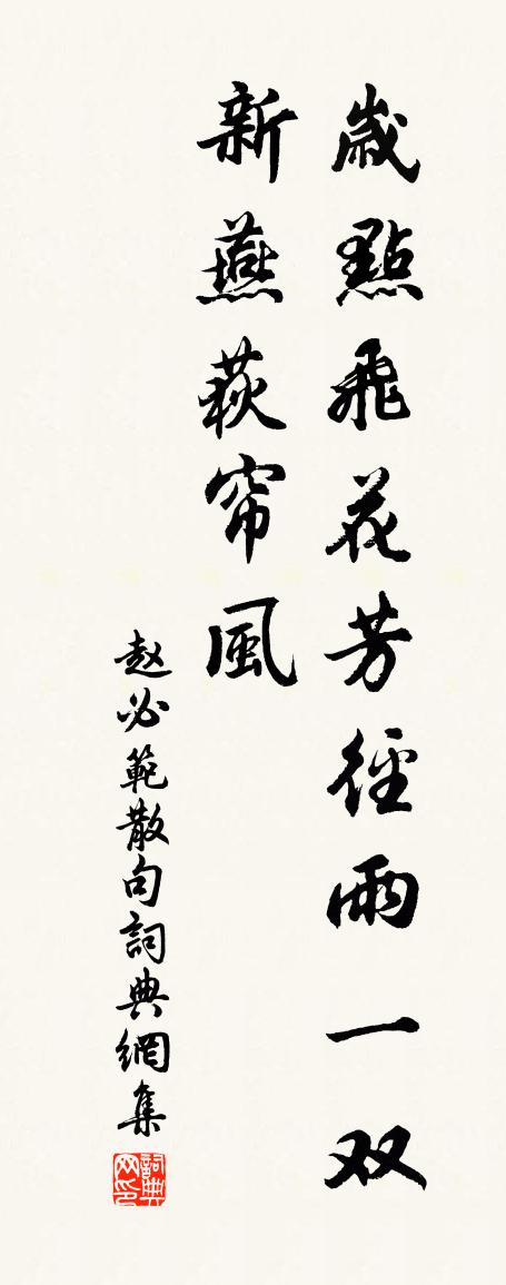 詩詞名句歷史字典書法欣賞書法字典國語詞典說文解字康熙字典古漢語字典標 題 作 者 詩 句 句作者:趙必范 朝代:宋代句原文歲點飛花芳徑雨,一雙新燕荻簾風。詩詞問答問:句的作者是誰?答:趙必范問:句寫於哪個朝代?答:宋代趙必范句書法欣賞句書法作品詩詞推薦依韻和王宣徽冬燕王珪〔唐代〕丞相華堂燕斝飛,群恩自與眾心期。魯台況值書雲後,漢殿仍經喜雪時。便有東風來翠幕,別翻新曲度瑤池。可傷賦劉子澄墨莊趙蕃〔宋代〕勤力漢疏傅,遺安龐德公。公家業異此,衰盛國應同。句錢惟演〔宋代〕東南地迥宵烽息,西北樓高晚望迷。周伯范棋會以足疾不赴走筆寄坐客樓鑰〔宋代〕里閭講棋社,大要率且真。豈惟簡苛禮,正欲聚首頻。向來賞花約,深恐負此春。春來顧多事,殆如參與辰。今朝初夏過湖外別業薛嵎〔宋代〕郊原新綠喜初晴,一曲湖光瀲灩明。幾處樓台空鎖鑰,百年人物盡丘塋。好花自分隨春去,惡木寧思擇地生。獨念贊五祖和尚釋宗元〔宋代〕貌古而清,語俚而新。同乎流俗,大有逕庭。常心是道, * 活人。使當時磨下玉潔冰清,則楊岐一宗未必中興者玉艷亭即事五首白玉蟾〔宋代〕夙酒縈懷處,芳亭拄頰間。一鶯黃翠柳,雙鷺白青山。杪秋登江樓(一作岳陽樓)周賀〔唐代〕平楚起寒色,長沙猶未還。世情何處淡,湘水向人閒。空翠隱高鳥,夕陽歸遠山。孤雲萬餘里,惆悵洞庭間。中塔悟空禪院王藺〔宋代〕富貴危機豈獨今,且從麋鹿逐山林。只慚莫報君恩重,敢廢惓惓畎畝心。又答斌老病癒遣悶二首黃庭堅〔宋代〕風生高竹涼,雨送新荷氣。魚游悟世網,鳥語入禪味。一揮四百病,智刃有餘地。病來每厭客,今乃思客至。余以庚寅十月十日抵敝廬今恰三年感而有作偶吳芾〔宋代〕何處風煙似我園,且將蕭散樂餘年。向來已不憂三黜,老去誰能羨九遷。門外往還惟白足,里中游舊盡華顛。竹林夏日翠漪堂文同〔宋代〕湖山碧溶溶,寒漪四望通。龜魚游浩渺,鳧鶩下虛空。爽氣吟窗外,清光釣艇中。一襟時自快,多謝北軒風。孟子心官則思陳普〔宋代〕心嚴內主役群形,百體欽承順令行。若失所思隨欲動,反為形役自紛爭。政府生日十首曹勛〔宋代〕中興光啟自元鈞,比德褒功禮意新。是贊是圖超古羽,儀刑一代冠麒麟。風雨不止而夾岸黃花盛開偶成吳則禮〔宋代〕風雨放船不惡,淮南九月未霜。一色黃花千里,後身猶作柴桑。霜天曉角(霜夜小酌)趙長卿〔宋代〕合兒幽靜處,圍爐面小窗。好是鬥頭兒坐,梅煙炷、返魂香。對火怯夜冷,猛飲消漏長。飲罷且收拾睡,斜月照、沁園春侯善淵〔元代〕混沌之中,恍惚存亡,何所運為。自妝分天地,三才應化,山川華麗,秀野蘭芝。日月鮮明,移神顯煥,洞曉陰陽殘春感事十首方回〔宋代〕寒暑元如故,乾坤豈不寬。時情工刻薄,生理轉艱難。遑恤諸兒笑,終憑後代看。淵明詠貧士,感慨異悲酸。惺惺石釋紹曇〔宋代〕主人翁已強安名,何待區區喚一聲。坐得石頭穿透底,依然打個不惺惺。滿庭芳馬鈺〔元代〕家緣猛棄,更不疑惑。辨認陰魂陽魄。咄出屍蟲,屏盡氣財酒色。好事先人後己,做憨憨、有似彌勒。修大道,處名句推薦甘居人下者鮮。御之失謀,非犯,則篡耳。來俊臣《羅織經·治下卷第三》 樓上黃昏欲望休,玉梯橫絕月中鉤李商隱《代贈二首》 爭渡,爭渡,驚起一灘鷗鷺。李清照《如夢令·常記溪亭日暮》 寒食不多時,牡丹初賣。晁沖之《感皇恩·寒食不多時》 短籬殘菊一枝黃。正是亂山深處、過重陽。呂本中《南歌子·驛路侵斜月》 花似伊。柳似伊。花柳青春人別離。歐陽修《長相思·花似伊》 雷填填兮雨冥冥,猿啾啾兮狖夜鳴;屈原《九歌》 為誰醉倒為誰醒,到今猶恨輕離別。呂本中《踏莎行·雪似梅花》 殘雪庭陰,輕寒簾影,霏霏玉管春葭。王沂孫《高陽台·和周草窗寄越中諸友韻》 氣性不和平,則文章事功,俱無足取王永彬《圍爐夜話·第四十則》