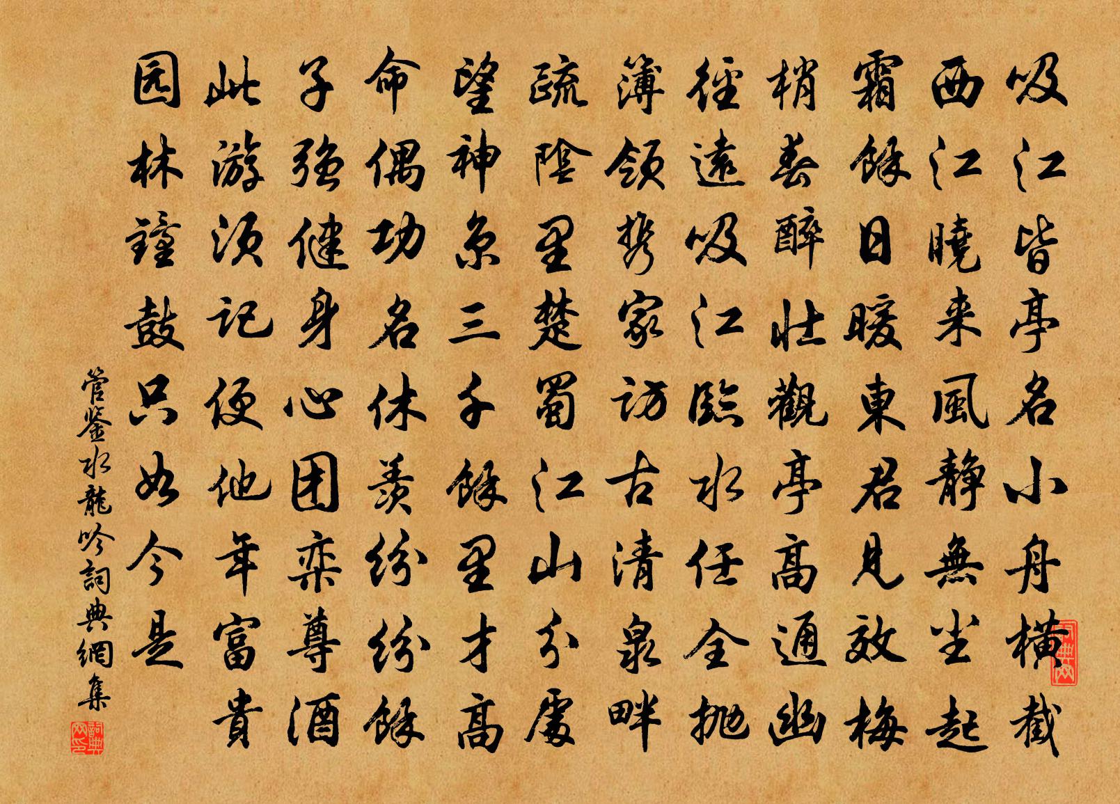 詩詞名句歷史字典書法欣賞書法字典國語詞典說文解字康熙字典古漢語字典標 題 作 者 詩 句 水龍吟作者:管鑒 朝代:宋代水龍吟原文吸江,皆亭名小舟橫截西江,曉來風靜無塵起。霜余日暖,東君見效,梅梢春醉。壯觀亭高,通幽徑遠,吸江臨水。任全拋簿領,攜家訪古,清泉畔、疏陰里。楚蜀江山分處,望神京、三千餘里。才高命偶,功名休羨,紛紛餘子強健身心,團欒尊酒,此游須記。便他年富貴,園林鐘鼓,只如今是。詩詞問答問:水龍吟的作者是誰?答:管鑒問:水龍吟寫於哪個朝代?答:宋代管鑒水龍吟書法欣賞水龍吟書法作品詩詞推薦和元厚之平羌王珪〔唐代〕詔收新土鳳林東,四百年來一戰功。蔥嶺自橫秦塞上,金城還落漢圖中。輕裘坐款無遺策,折箭來庭有舊風。零雨紹興祀大火十二首佚名〔宋代〕熒惑在天,惟火興合。翳神主火,純一不雜。作配熒惑,祀功則然。不腆之幣,於以告虔。夕月三首佚名〔宋代〕凝陰稟粹,照臨八埏。麗天垂象,繼日代明。一氣資始,四時運行。靈祗昭昭,備物訝誠。昭君辭應詔庾信〔南北朝〕斂眉光祿塞。還望夫人城。片片紅顏落。雙雙淚眼生。冰河牽馬渡。雪路抱鞍行。胡風入骨冷。夜月照心明。方調苦熱白居易〔唐代〕頭痛汗盈巾,連宵復達晨。不堪逢苦熱,猶賴是閒人。朝客應煩倦,農夫更苦辛。始慚當此日,得作自由身。紹興十四年奉上徽宗冊實三首真宗〔宋代〕惟精惟一,乃照乃神。鴻我克揚,茂寮新宣。如禹之功,如堯之仁。孝思永慕,用詔無垠。復用前韻呈刑部杜丈君章晁補之〔宋代〕杜侯灑墨春雲暮,紛紛滿紙棲鴉聚。文章不犯世故鋒,牛鬼荒虛瓦棺古。平生傀磊寧獨此,躋俗唐虞要遭主。先君浣溪沙納蘭性德〔清代〕記綰長條欲別難。盈盈自此隔銀灣。便無風雪也摧殘。青雀幾時裁錦字,玉蟲連夜剪春幡。不禁辛苦況相關。中元日曉登碧落堂,望南北山二首楊萬里〔宋代〕米山不知重,近見三兩疊。遠者淡不真,眇與天相接。晨光染紅雲,正向山外貼。映出青萬層,還與雲俱滅。江夏別魯直送之宜州潘大臨〔宋代〕翰墨精神全魏漢,文章波瀾似春秋。可是中州著不得,江南已遠更宜州。寄殿院薛侍御無可〔唐代〕名高意本閒,浮俗自難攀。佐蜀連錢出,朝天獬豸還。迴翔歷清院,彈奏迥離班。休浣通玄旨,留僧晝掩關。金陵雜興二百首一百四十七蘇泂〔宋代〕方橋一派水縈紆,客散亭空清夜徂。二十五聲春點靜,月明池上柳疏疏。送友人及第歸江東陳羽〔唐代〕五陵春色泛花枝,心醉花前遠別離。落羽恥為關右客,成名空羨里中兒。都門雨歇愁分處,山店燈殘夢到時。家住真隱寺劉克莊〔宋代〕出郭斜陽已在山,夜深乘月到江乾。奴敲小店牢扃戶,僧借虛堂徑掛單。駭浪急回恩膽薄,逆風小住為心寬。投床題滿氏申申亭王令〔宋代〕申申亭者名自誰,河東丈人身銘之。方其作亭自休息,固欲申暢名其題。雖然自奉頗幽樂,豈敢兼忽當世為。若日贈別晉三處士高適〔唐代〕有人家住清河源,渡河問我游梁園。手持道經注已畢,心知內篇口不言。盧門十年見秋草,此心惆悵誰能道。知己黑青賈似道〔宋代〕黑者須當黑似漆,仔細看來無別色。更兼牙肚白如銀,名號將軍為第一。魏府君輓詞林季仲〔宋代〕霜露長悲陟岵人,見翁強健卻酸辛。家徒四壁知無恨,掌有雙珠未是貧。老去米鹽渾不問,病來藥石強相親。歸從夕月十首佚名〔宋代〕猗歟崇基,右平左誠。祗率典常,屈茲秋夕。陟降惟寅,威們抑抑。神其鑒觀,穰簡是集。喜遷鶯姬翼〔元代〕欲明鬼真趣。便鬼掃蕩多方,亡羊岐路。脫落皮鬼,惟存真實,絕盡向時行步。一朵玉蓮開展,不受纖塵點污。收名句推薦瑤池阿母綺窗開,黃竹歌聲動地哀李商隱《瑤池》 不及夜台塵土隔,冷清清、一片埋愁地納蘭性德《金縷曲·亡婦忌日有感》 池館隳摧古榭荒,此延嘉客會重陽。韓琦《九日水閣》 鼙鼓動時雷隱隱,獸頭凌處雪微微。盧肇《競渡詩 / 及第後江寧觀競渡寄袁州剌史成應元》 不才明主棄,多病故人疏。孟浩然《歲暮歸南山 / 歸故園作 / 歸終南山》 應是天仙狂醉,亂把白雲揉碎。李白《清平樂·畫堂晨起》 物舍其所長,之其所短,堯亦有所不及矣劉向《戰國策·齊三·孟嘗君有舍人而弗悅》 莫遣只輪歸海窟,仍留一箭射天山。李益《塞下曲》 單于北望拂雲堆,殺馬登壇祭幾回。王之渙《涼州詞二首》 見一葉落,而知歲之將暮劉安及其門客《淮南子·說山訓》