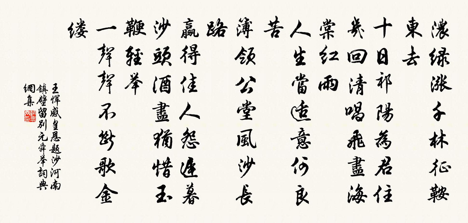 詩詞名句歷史字典書法欣賞書法字典國語詞典說文解字康熙字典古漢語字典標 題 作 者 詩 句 感皇恩 題沙河南 鎮壁,留別元舜舉作者:王惲 朝代:元代原文濃綠漲千林,征鞍東去。十日祁陽為君住。幾回清唱,飛盡海棠紅雨。人生當適意、何良苦。簿領公堂,風沙長路。贏得佳人怨遲暮。沙頭酒盡,猶惜玉鞭輕舉。一聲聲不斷、歌金縷。詩詞問答問:《感皇恩 題沙河南 鎮壁,留別元舜舉》的作者是誰?答:王惲問:該詩寫於哪個朝代?答:元代問:該詩是什麼體裁?答:詞書法欣賞感皇恩 題沙河南 鎮壁,留別元舜舉書法作品詩詞推薦蘄口道中三首王令〔宋代〕維舟泝江流,人力與水爭。回視東下人,恍如御風行。誰能倒長江,奔瀉暫西傾。聊用快客意,何憚魚龍驚。縣齋秋懷程公許〔宋代〕蜀西金天晶,氣稟勇於義。時台紬書樂,一麾豈其志。堂堂蜀蜀公孫,加璧不可致。語默易規,經綸那得避。君看中壘一首蘇籀〔宋代〕更生傾側四斥已,精誠所祈格天地。著明深切安危機,同道蕭周數人耳。不容何病見君子,節義政應強國熱,倖卿次韻謝董君讀予詩稿方回〔宋代〕宇宙茫茫戰馬塵,中原文獻不無人。詩裁彩筆天公妒,書擁青燈夜氣神。簁雨簸風六月冷,磔雲裂霧千峰新。何當登廣武原張祜〔唐代〕廣武原西北,華夷此浩然。地盤山入海,河繞國連天。遠樹千門邑,高檣萬里船。鄉心日雲暮,猶在楚城邊。滿江紅·送廖叔仁赴闕嚴羽〔宋代〕日近觚稜,秋漸滿、蓬萊雙闕。正錢塘江上,潮頭如雪。把酒送君天上去,瓊玉琚玉佩軝鴻列。丈夫兒、富貴等浮李蘇軾〔宋代〕不及梨英軟,應慚梅萼紅。西園有千葉,淡佇更纖穠。譚仁季以二詩見貽走筆次韻曹彥約〔宋代〕風聲久想杜陵珂,坐對忘年可爛柯。但覺清談揮玉柄,也知文律敵金科。螳螂欲張難當轍,鼴鼠終微漫飲河。從此謝潘端叔惠紅梅樓鑰〔宋代〕黃姑曾為點冰肌,亦有緇塵染素衣。何似煙脂天賜與,暗香猶在是耶非。送薛二十三郎中赴婺州姚合〔唐代〕我住浙江西,君去浙江東。日日心來往,不畏浙江風。商山路驛桐樹昔與微之前後題名處白居易〔唐代〕與君前後多遷謫,五度經過此路隅。笑問中庭老桐樹,這回歸去免來無?題鄭通妙方丈白玉蟾〔宋代〕無爭之棋兩三局,自勸之酒一二杯。但且任么隨俗過,丹成雲靄自然來。逍遙翁溪亭王建〔唐代〕逍遙翁在此裴回,帝改溪名起石台。車馬到春常借問,子孫因選暫歸來,稀疏野竹人移折,零落蕉花雨打開。無主鳳鳴有吉凶戴復古〔宋代〕鵲噪令人喜,鴉噪令人憎。人心自分別,吉凶屬禽聲。舜時有鳳鳴,文王時亦鳴。漢時鳳亦鳴,六朝時亦鳴。鳳鳴好事近趙聞禮〔宋代〕小枕夢催閒,飛雨時鳴高屋。掛起西窗人靜,聽春禽聲續。鴨塘溪綠漲輕痕,煙柳媚新綠。誰伴瘦筇尊酒,弄岩泉菩薩蠻辛棄疾〔宋代〕西風都是行人恨。馬頭漸喜歸期近。試上小紅樓。飛鴻字字愁。闌乾閒倚處。一帶山無數。不似遠山橫。秋波相共閒居白居易〔唐代〕空腹一盞粥,飢食有餘味。南檐半床日,暖臥因成睡。綿袍擁兩膝,竹几支雙臂。從旦直至昏,身心一無事。心足偈頌一百零二首釋慧遠〔宋代〕今朝四月八,邪師壞 * 。累及釋迦文,死水裹庵殺。客中夜雨柴望〔宋代〕離情先怯向邊州,寒葉敲窗更報秋。幾點攪殘千里夢,一聲滴作兩鄉愁。苦緣楊柳沾離席,偏傍梧桐濺小樓。惟有巫山一段雲 攜杖上禪房山尹志平〔元代〕自在三山客,逍遙西海賓。孤身到處自全真。風月永為鄰。識破浮華虛假。誰羨望雲星馬。一條拄杖勝龍驂。穩步名句推薦強欲登高去,無人送酒來。岑參《行軍九日思長安故園》 人生有情淚沾臆,江水江花豈終極!杜甫《哀江頭》 上之所以使下者,一物也;下之所以事上者,一術也。墨子《墨子·08章 尚賢(上)》 離愁漸遠漸無窮,迢迢不斷如春水。歐陽修《踏莎行·候館梅殘》 何事非相思,江上葳蕤竹。吳均《登二妃廟》 萬事到頭都是夢,休休。明日黃花蝶也愁。蘇軾《南鄉子·重九涵輝樓呈徐君猷》 桃李春風一杯酒,江湖夜雨十年燈。黃庭堅《寄黃幾復》 目之於色也,有同美焉。孟子《孟子·告子章句上·第七節》 風含翠篠娟娟淨,雨裛紅蕖冉冉香。杜甫《狂夫》 奢則不孫,儉則固。與其不孫也,寧固。顏之推《顏氏家訓·治家篇》