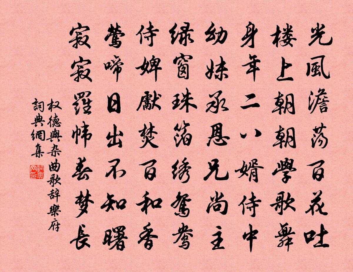 詩詞名句歷史字典書法欣賞書法字典國語詞典說文解字康熙字典古漢語字典標 題 作 者 詩 句 雜曲歌辭樂府作者:權德輿 朝代:唐代雜曲歌辭樂府原文光風澹蕩百花吐,樓上朝朝學歌舞。身年二八婿侍中,幼妹承恩兄尚主。綠窗珠箔繡鴛鴦,侍婢先焚百和香。鶯啼日出不知曙,寂寂羅幃春夢長。詩詞問答問:雜曲歌辭樂府的作者是誰?答:權德輿問:雜曲歌辭樂府寫於哪個朝代?答:唐代問:雜曲歌辭樂府是什麼體裁?答:樂府權德輿雜曲歌辭樂府書法欣賞雜曲歌辭樂府書法作品注釋全唐詩:卷26_104詩詞推薦紹興道者紹興朝士〔宋代〕萬里雲歸洞,千山水向東。玉爐香冷處,煙散碧霞中。題井陘雙谿李道士所居岑參〔唐代〕五粒松花酒,雙谿道士家。唯求縮卻地,鄉路莫教賒。賀新郎·和前韻辛棄疾〔宋代〕覓句如東野。想錢塘風流處士,水仙祠下。更億小孤煙浪里,望斷彭郎欲嫁。是一色空濛難畫。誰解胸中吞雲夢,句繆瑜〔宋代〕有客去游丞相閣,無人來問孝廉船。過百家渡四絕句楊萬里〔宋代〕園花落盡路花開,白白紅紅各自媒。莫問早行奇絕處,四方八面野香來。去國待潮江亭太常徐簿宋卿載酒來別陸游〔宋代〕昨解魚符已徑歸,偶隨尺一起柴扉。蹔留已媿黔吾突,久住空令緇客衣。外物紛紛何足問,故人眷眷莫相違。從今龔遂徐鈞〔宋代〕帶牛佩犢俗難平,喜得公來便息兵。最是有功能不伐,君前猶自遜王生。山頭鹿張籍〔唐代〕山頭鹿,角芟芟,尾促促。貧兒多租輸不足,夫死未葬兒在獄。早日熬熬蒸野岡,禾黍不收無獄糧。縣家唯憂少軍寄山友長孫棲嶠賈島〔唐代〕此時氣蕭颯,琴院可應關。鶴似君無事,風吹雨遍山。松生青石上,泉落白雲間。有徑連高頂,心期相與還。婆羅門引(西湖十詠·兩峰插雲)陳允平〔宋代〕髻鬟對聳,萬松扶玉上青冥。西風共倚,煙南水北,石荒苔老,三十六梯平。愛翠尖如削,天外亭亭。高寒夢驚。踏莎行 崑崙山團庵王哲〔元代〕做就圈模,且休蓋椽。諸公怎曉余方便。水符不向此中行,因緣已至文登縣。各謹持修,速歸鍛練。內容顯現親頭風入松沈禧〔元代〕紅梅慶六十壽陽回潛谷起*虬。萬斛燦琳球。芳姿占得先春意,冰霜操、甘抱清幽。野店溪橋托質,蒼松翠竹為儔涼風嘆白居易〔唐代〕昨夜涼風又颯然,螢飄葉墜臥床前。逢秋莫嘆須知分,已過潘安三十年。贈王尊師姚合〔唐代〕先生自說瀛洲路,多在青松白石間。海岸夜中常見日,仙宮深處卻無山。犬隨鶴去游諸洞,龍作人來問大還。今日東平留贈狄司馬(曾與田安西充判官)高適〔唐代〕古人無宿諾,茲道以為難。萬里赴知己,一言誠可嘆。馬蹄經月窟,劍術指樓蘭。地出北庭盡,城臨西海寒。森然立春日集杜句高斯得〔宋代〕春日垂霜鬢,江村亂水中。偷生長避地,愁坐正書空。乞米煩佳客,應門試小童。布衾冷如鐵,長夜豈堪終。立春日侍宴內出剪彩花應制蘇頲〔唐代〕曉入宜春苑,穠芳吐禁中。剪刀因裂素,妝粉為開紅。彩異驚流雪,香饒點便風。裁成識天意,萬物與花同。奉酬袁使君高寺院新亭對雨(其亭即使君所創)皎然〔唐代〕茲亭跡素淺,勝事並隨公。法界飄香雨,禪窗灑竹風。浮煙披夕景,高鶴下秋空。冥寂四山久,寧期此會同。再次首唱韻和楊億〔宋代〕碧樹銀塘接畫樓,天人誰肯降瓊輈。三山密信傳青雀,五日歸鞍躍紫騮。郢酒泛冰星弁側,吳歈倚瑟黛蛾愁。雲峰萍李嶠〔唐代〕二月虹初見,三春蟻正浮。青蘋含吹轉,紫帝帶波流。屢逐明神薦,常隨旅客游。既能甜似蜜,還繞楚王舟。名句推薦驚風飄白日,忽然歸西山曹植《贈徐幹詩》 求備之心,可用之以修身,不可用之心接物王永彬《圍爐夜話·第一五九則》 易求無價寶,難得有心郎。魚玄機《贈鄰女 / 寄李億員外》 天行有常,不為堯存,不為桀亡。荀子《荀子·天論》 青山橫北郭,白水繞東城李白《送友人》 楚水巴山江雨多,巴人能唱本鄉歌。劉禹錫《竹枝詞二首·其二》 東風吹水日銜山,春來長是閒。李煜《阮郎歸·呈鄭王十二弟》 一年春又盡,倚杖對斜暉。左緯《春晚》 看似尋常最奇崛,成如容易卻艱辛。王安石《題張司業詩》 布穀飛飛勸早耕,舂鋤撲撲趁春睛。姚鼐《山行·布穀飛飛勸早耕》