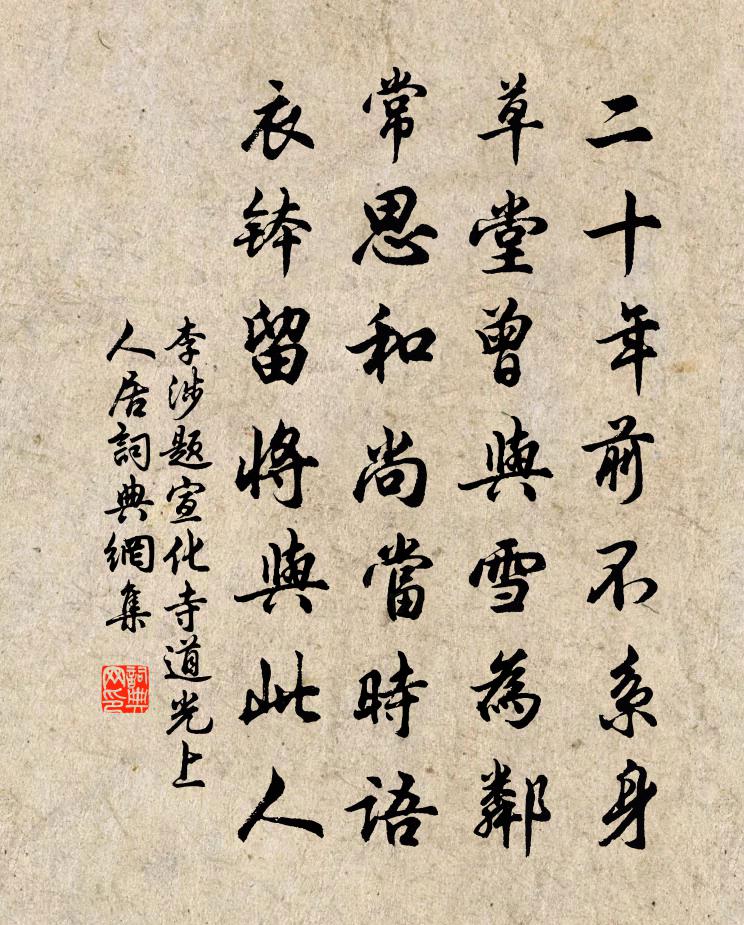 詩詞名句歷史字典書法欣賞書法字典國語詞典說文解字康熙字典古漢語字典標 題 作 者 詩 句 題宣化寺道光上人居作者:李涉 朝代:唐代題宣化寺道光上人居原文二十年前不系身,草堂曾與雪為鄰。常思和尚當時語,衣缽留將與此人。詩詞問答問:題宣化寺道光上人居的作者是誰?答:李涉問:題宣化寺道光上人居寫於哪個朝代?答:唐代問:題宣化寺道光上人居是什麼體裁?答:七絕李涉題宣化寺道光上人居書法欣賞題宣化寺道光上人居書法作品注釋全唐詩:卷477-98詩詞推薦早梅楊公遠〔宋代〕籬下叢叢菊花時,清香飛上向南枝。化工未必無私意,試問春風知不知。題弟晦所居壁楊億〔宋代〕製宅何其巧,連山復帶溪。芳樽長有酒,嘉樹自成蹊。學舍祥鱣墮,歌梁賀燕迷。調琴明月樹,系馬綠楊堤。好畤夜坐二首楊公遠〔宋代〕門外霜風獵獵聲,擁爐坐對一燈明。閒思浮世古今事,倦聽荒城長短更。滿榻詩書終有味,半生名利竟無成。從人菩薩蠻舒亶〔宋代〕疏英乍蕾餘寒淺。蹋枝小鵲嬌猶顫。謾炷水沈香。簾波不是湘。清愁支酒力。畏聽江城笛。恁忍說華年。垂垂欲暮醉蓬萊(丁亥壽蜀帥)李曾伯〔宋代〕有擎天一柱,殿角西頭,手扶宗祐。萬里魚鳧,倚金城山立。亭障驚沙,氈裘捲地,倏度黃龍磧。玉帳從容,招搖布袋贊釋普度〔宋代〕兜率內宮不肯住,杖挑布袋紅塵去。不知開口笑何人,待你下生人笑你。阿呵呵,寬著肚皮等著他。偈頌一百二十三首釋祖欽〔宋代〕天不能蓋,地不能載。即之本無,棄權之則在。無本不無,在即不在。金剛與泥神揩背,一拶粉碎。游九鎖楊伯岩〔宋代〕曉山雲樹碧生秋,乘興間為洞府游。片石卻將仙路隔,負人平昔慕浮丘。齊天樂(左綿道中)陸游〔宋代〕角殘鍾晚關山路,行人乍依孤店。塞月征塵,鞭絲帽影,常把流年虛占。藏鴉柳暗。嘆輕負鶯花,謾勞書劍。事往鳳棲梧/蝶戀花張綱〔宋代〕風動飛霙迎曉霽。銀海光浮,宴啟群仙會。騎省流芳誰可繼。尊前看取連枝貴。華發衰翁羞晚歲。未報皇恩,尚忝冬日放言二十一首張耒〔宋代〕小兒喜學書,滿紙如塗鴉。老婦寒不績,當戶理琵琶。樽中有神物,快瀉如流霞。三杯任兀兀,凍臉生春華。友人楚孟德過余縱言及神仙余謂之無孟德謂之司馬光〔宋代〕仙家不似人間歡,瑤漿琅菜青玉盤。乘醉東遊憩陽穀,酒瓢間掛扶桑木。梅梁殿馬之純〔宋代〕太極初時欠一梁,漂流偶見石城傍。曾聞禹廟還如此,可見川只欲效祥。不但千年無朽蠹,能令滿殿有芬香。要將題董一之花木杪方岳〔宋代〕君不見王子猷,剡溪夜雪之孤舟。此翁百好不入眼,而雅與竹深相投。君不見陶淵明,徽弦不具之古琴。東籬把菊秦刷子陳東〔宋代〕誰斫碧琅玕,影撼半庭風月。尚有歲寒心在,留得數根華發。龍孫受戲碧波濤,喜動清風發。到得浪花深處,起一歷城春日對酒祖無擇〔宋代〕數尺遊絲拂面來,數枝紅杏向人開。眼前信美非吾土,且勸春風酒一杯。謝王恭父惠石岩花二首袁燮〔宋代〕岩畔移來漫一叢,鮮鮮忽發十分紅。細看頗與鬷明類,言善方知美在中。下竺寺金魚顧逢〔宋代〕黃金成一片,雨過唼方池。相爾浮沉樂,如吾愛傲時。水聲頻撥剌,人影不驚疑。中有成龍者,騰空未可知。魏撫乾輓詩魏了翁〔宋代〕同姓又同升,知君莫我深。磨人三寸鐵,行己四知金。雪柏擎蒼乾,霜鍾振曉音。若人今在否,撫事一沾襟。次韻王景彝正月十六夜省宿過景靈街梅堯臣〔宋代〕宮街不閉東城月,圓影才虧夜色春。自躍金羈來宿省,從他錦帳欲誇人。燈光遠近疑爭晝,歌韻高低競起塵。我老名句推薦不知江月待何人,但見長江送流水。張若虛《春江花月夜》 梅子金黃杏子肥,麥花雪白菜花稀。范成大《四時田園雜興·其二》 大江流日夜,客心悲未央。謝朓《暫使下都夜發新林至京邑贈西府同僚》 輕淘起,香生玉塵,雪濺紫甌圓。米芾《滿庭芳·詠茶》 論如析薪,貴能破理。劉勰《文心雕龍·論說》 滯雨通宵又徹明,百憂如草雨中生。薛逢《長安夜雨》 橫眉冷對千夫指,俯首甘為孺子牛。魯迅《自嘲》 十日雨絲風片裡,濃春艷景似殘秋。王士禎《秦淮雜詩二十首·其一》 懷舊空吟聞笛賦,到鄉翻似爛柯人。劉禹錫《酬樂天揚州初逢席上見贈》 臣下之勸勞灼見,生民之疾苦周知。宋濂、王褘《元史·列傳·卷一》