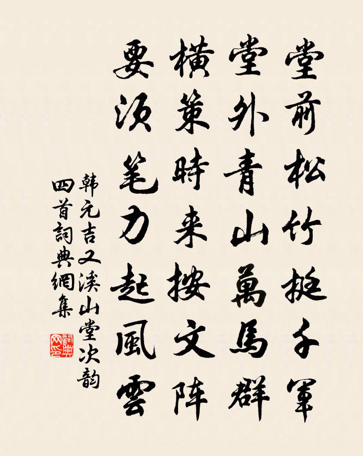 堂前松竹挺千軍,堂外青山萬馬群,橫策時來按文陣,要須筆力起風雲。詩詞問答
