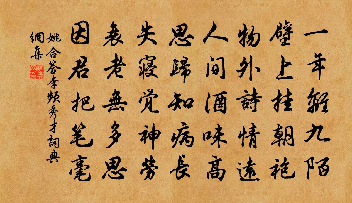 詩詞名句歷史字典書法欣賞書法字典國語詞典說文解字康熙字典古漢語字典標 題 作 者 詩 句 答李頻秀才作者:姚合 朝代:唐代答李頻秀才原文一年離九陌,壁上掛朝袍。物外詩情遠,人間酒味高。思歸知病長,失寢覺神勞。衰老無多思,因君把筆毫。詩詞問答問:答李頻秀才的作者是誰?答:姚合問:答李頻秀才寫於哪個朝代?答:唐代問:答李頻秀才是什麼體裁?答:五律姚合答李頻秀才書法欣賞答李頻秀才書法作品注釋全唐詩:卷501-28詩詞推薦緣識宋太宗〔宋代〕知靜求難靜,忙心不可閒。艷陽天地熱,思暮日銜山。仙學堂李仲光〔宋代〕天人異所稟,事物皆生知。強名仙學堂,此語將誰欺。我欲借隙地,虛檐敞茅茨。琅琅誦玉章,勉力探希夷。河上二首司空圖〔唐代〕慘慘日將暮,驅羸獨到莊。沙痕傍墟落,風色入牛羊。新霽田園處,夕陽禾黍明。沙村平見水,深巷有鷗聲。歌筵感舊陳維崧〔清代〕誰家搖步障,明月夜,賞花天。正壁帶紅稠,簾衣綠縐,夾路釵鈿。從前,也曾聽處,漸如塵似夢記難全。遮莫延秋夕宿楊明府廳趙湘〔唐代〕主人無俗緣,留客菊花邊。雨氣寒並竹,秋聲夜雜蟬。爽知於酒稱,閒覺愛棋偏。不欲欹孤枕,更深卻潄泉。汴水易士達〔宋代〕千里通渠竟達河,萬民力役怨聲多。錦帆不送龍舟返,並覆亡隋入 * 。靜照堂張掞〔宋代〕牛斗光芒下,江山形勝中。招提萬法本,靜照一堂空。花木含春意,門庭話古風。支郎乞詩什,愧匪雅南工。初夏雜興陸游〔宋代〕自斷殘年莫問天,吾儕何處不隨緣。家貧卻得身差健,夜短何妨晝熟眠。未歷名山采靈藥,且從同社樂豐年。賣絲答青山閣見寄胡仲弓〔宋代〕詩人無俗事,侵曉訪僧居。山近市聲遠,樓空松影虛。耕雲雖有地,種藥恐無鋤。但學觀心法,何須課佛書。偈頌十八首釋道璨〔宋代〕弟兄財本不多爭,共駕官船各自撐。撐去撐來回首看,依前不離蓼花汀。溪行寄王震張九齡〔唐代〕山氣朝來爽,溪流日向清。遠心何處愜,閒棹此中行。叢桂林間待,群鷗水上迎。徒然適我願,幽獨為誰情。書李世南所畫秋景二首蘇軾〔宋代〕人間斤斧日創夷,誰見龍蛇百尺姿。不是溪山成獨往,何人解作掛猿枝。懷舊陸游〔宋代〕身是人間一斷蓬,半生南北任秋風。琴書昔作天涯客,蓑笠今成澤畔翁。夢破江亭山驛外,詩成燈影雨聲中。不須次韻十詩晝寢樓鑰〔宋代〕才盡甘為世所捐,不如高臥了餘年。時逢毀譽心無諍,間有詩文手自編。老去已知身是夢,閒來更得酒中天。簾深久居京師感懷詩費冠卿〔唐代〕煢獨不為苦,求名始辛酸。上國無交親,請謁多少難。九月風到面,羞汗成冰片。求名俟公道,名與公道遠。力盡戲詠村居陸游〔宋代〕馬跡車聲斷已無,鄰翁笑語自相呼。衣裁大布如亭長,船設低篷學釣徒。愍物慾師僧施食,畏人愁報吏催租。陳蕃句劉存行〔宋代〕麥苗花下綠,犢子草邊黃。挽梁尚書二首吳芾〔宋代〕身在名卿數,人懷長者風。愛民余善政,富國著休功。敭歷周中外,哀榮極始終。芝蘭方競秀,流慶看無窮。玩鷗亭曾幾〔宋代〕乃翁獨步辭雲間,五花判罷游金鑾。甘泉頗勞侍從事,夜直必夢江湖寬。晚遭忌刻泛湘水,眾為不樂公欣歡。白鷗以孟夏唱酬陳子高詩寄季承並借窮愁志及其兄趙蕃〔宋代〕故家不復見中州,插架聞君似鄴侯。往事誰能論牛李,舊書聊欲借窮愁。薰蕕政自難同器,涇渭懸知卒異流。何事名句推薦休說鱸魚堪膾,盡西風,季鷹歸未?辛棄疾《水龍吟·登建康賞心亭》 一觴雖獨盡,杯盡壺自傾。陶淵明《飲酒·其四》 鵲辭穿線月,花入曝衣樓。李賀《七夕》 七八個星天外,兩三點雨山前。辛棄疾《西江月·夜行黃沙道中》 失道而後德,失德而後仁,失仁而後義,失義而後禮。老子《老子·德經·第三十八章》 未能拋得杭州去,一半勾留是此湖。白居易《春題湖上》 金井梧桐秋葉黃,珠簾不捲夜來霜。王昌齡《長信怨》 無端聽畫角,枕畔紅冰薄。納蘭性德《菩薩蠻·朔風吹散三更雪》 居高聲自遠,非是藉秋風。虞世南《蟬》 今日樓台鼎鼐,明年帶礪山河辛棄疾《西江月·堂上謀臣尊俎》