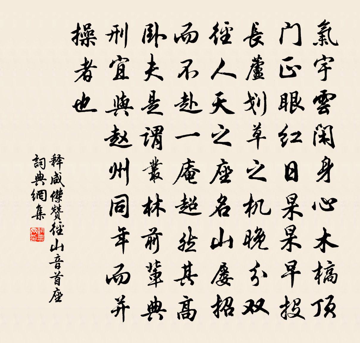 詩詞名句歷史字典書法欣賞書法字典國語詞典說文解字康熙字典古漢語字典標 題 作 者 詩 句 贊徑山音首座作者:釋鹹傑 朝代:宋代贊徑山音首座原文氣宇雲閒,身心木槁。頂門正眼,紅日杲杲。早投長蘆劃草之機,晚分雙徑人天之座。名山屢招而不赴,一庵超然其高臥。夫是謂叢林前輩典刑,宜與趙州同年而並操者也。詩詞問答問:贊徑山音首座的作者是誰?答:釋鹹傑問:贊徑山音首座寫於哪個朝代?答:宋代釋鹹傑贊徑山音首座書法欣賞贊徑山音首座書法作品詩詞推薦宮詞三十三首曹勛〔宋代〕滔天逆黨作兵端,坐致酋渠詔意寬。鹹與惟新皆赤子,釋囚盡復漢衣冠。禪人並化主寫真求贊釋正覺〔宋代〕是個人,欠精神。家風青天沒四壁,事業白雲閒一身。古澗之津,枯木之春。水曲折而歸大海,華次第而趁芳辰。次韻戲彩老人重陽懷故園作喻良能〔宋代〕瀟灑秋容雨後天,丹青端似倩龍眠。故園綠竹應今日,異縣黃花又一年。微祿只堪供菽水,菲材安敢擬淵騫。日來次韻穎仲蘭室這什李彌遜〔宋代〕黃卷青燈寄佛場,孤高如在遠林芳。下帷誰識傳經董,載酒時過尚白揚。華發同心猶有臭,青衿入室自知香。公卿減字木蘭花(和倅·車韻。因以送之)趙鼎〔宋代〕筆端紅翠。造化工夫春有意。雲夢涵胸。好去蓬山十二重。天街追騎。催喚謫仙泥樣醉。電掃雲空。百斛明珠咳唾鶴沖天(張仲宗以秋香酒見寄並詞,次其韻)李彌遜〔宋代〕篘玉液,釀花光。來趁北窗涼。為君小摘蜀葵黃。一似嗅枝香。飲中仙,山中相。也道十分宮樣。一般時候最宜嘗清遠江峽山寺張說〔唐代〕流落經荒處,逍遙此梵宮。雲峰吐月白,石壁淡煙紅。寶塔靈仙涌,懸龕造化功。天香涵竹氣,虛唄引松風。檐牖題蘇端明書乳泉賦後尤煓〔宋代〕萬籟既寂,一氣孔神。吸彼沆瀣,沃此肺膺。至陽之精,天一所生。欽哉此詞,展也大成。題智者雙清堂喻良能〔宋代〕潦收池淨見魚行,木落山空鳥語鳴。更待夜深來徙倚,要看霜月斗波清。咨咨草根蟲裘萬頃〔宋代〕咨咨草根蟲,瑟瑟葉上雨。休休退食人,落落誰與語。陳編竟日披,陋室隨時處。此心苟自樂,貧賤亦得所。夷齊田家歸陳藻〔宋代〕蒔秧郎婿晚歸來,白面勻妝是乃妻。笑說福唐風俗惡,一田夫婦兩身泥。五美吟·明妃曹雪芹〔清代〕絕艷驚人出漢宮,紅顏命薄古今同。君王縱使輕顏色,予 * 何畀畫工?謝柳全叔縣丞寄高麗松花曾幾〔宋代〕幽人所住空山里,老樹皆作虯龍起。但知樹底聽松風,不見風前落松子。三韓華萼手自開,其間瑣碎如嬰孩。請因謁金門趙師俠〔宋代〕風雨急。紅紫又還狼藉。嫩綠團枝苔徑濕。簾開雙燕入。院靜晝閒人寂。一縷水沈煙直。心事有誰能會得。階前芳哭宋文淵王洋〔宋代〕清懷凜凜古人風,尚憶當年語意同。開口劍鋒初論事,歸休弱羽已傷弓。累朝因革襟懷內,四海悲歡指顧中。寂寞謁貴公子,不禮,書格子屏風李貞白〔唐代〕道格何曾格,言糊又不糊。渾身總是眼,還解識人無。秋江寫望林逋〔宋代〕蒼茫沙咀鷺鷥眠,片水無痕浸碧天。最愛蘆花經雨後,一篷煙火飯漁船。謝安大使兒遺白玉環魏了翁〔宋代〕寶刀切寒玉,解作環無端。連蜷虹貫日,晶潤晴生煙。帝省岷嶓下,冠佩人閒閒。乃飭坤之靈,效貢窮山淵。不以和楚守於伯達曹勛〔宋代〕平生聞說於門貴,遠業傳家見此賢。妙譽逐風來不竟,美才制錦諒隨緣。一言悟主君須得,百巧成窮我可憐。坐想頌古一百二十一首釋宗杲〔宋代〕移身不移步,移步不移身。走卻金師子,捉得玉麒麟。名句推薦槐葉初勻日氣涼,蔥蔥鼠耳翠成雙。范成大《夏日田園雜興》 彩線輕纏紅玉臂,小符斜掛綠雲鬟。蘇軾《浣溪沙·端午》 羈旅長堪醉,相留畏曉鍾。戴叔倫《客夜與故人偶集 / 江鄉故人偶集客舍》 名實相生,利用相成,是非相明,去就相安也。王通《中說·卷五·問易篇》 差若毫釐,謬以千里。魏收《魏書·列傳·卷六十六》 坤至柔而動也剛,至靜而德方佚名《易傳·文言傳·坤文言》 悲懷感物來,泣涕應情隕。潘安《悼亡詩三首》 書中自有黃金屋,書中自有顏如玉趙恆《勸學詩》 苟利國家生死以,豈因禍福避趨之。林則徐《赴戍登程口占示家人·其二》 傷心橋下春波綠,曾是驚鴻照影來。陸游《沈園二首》